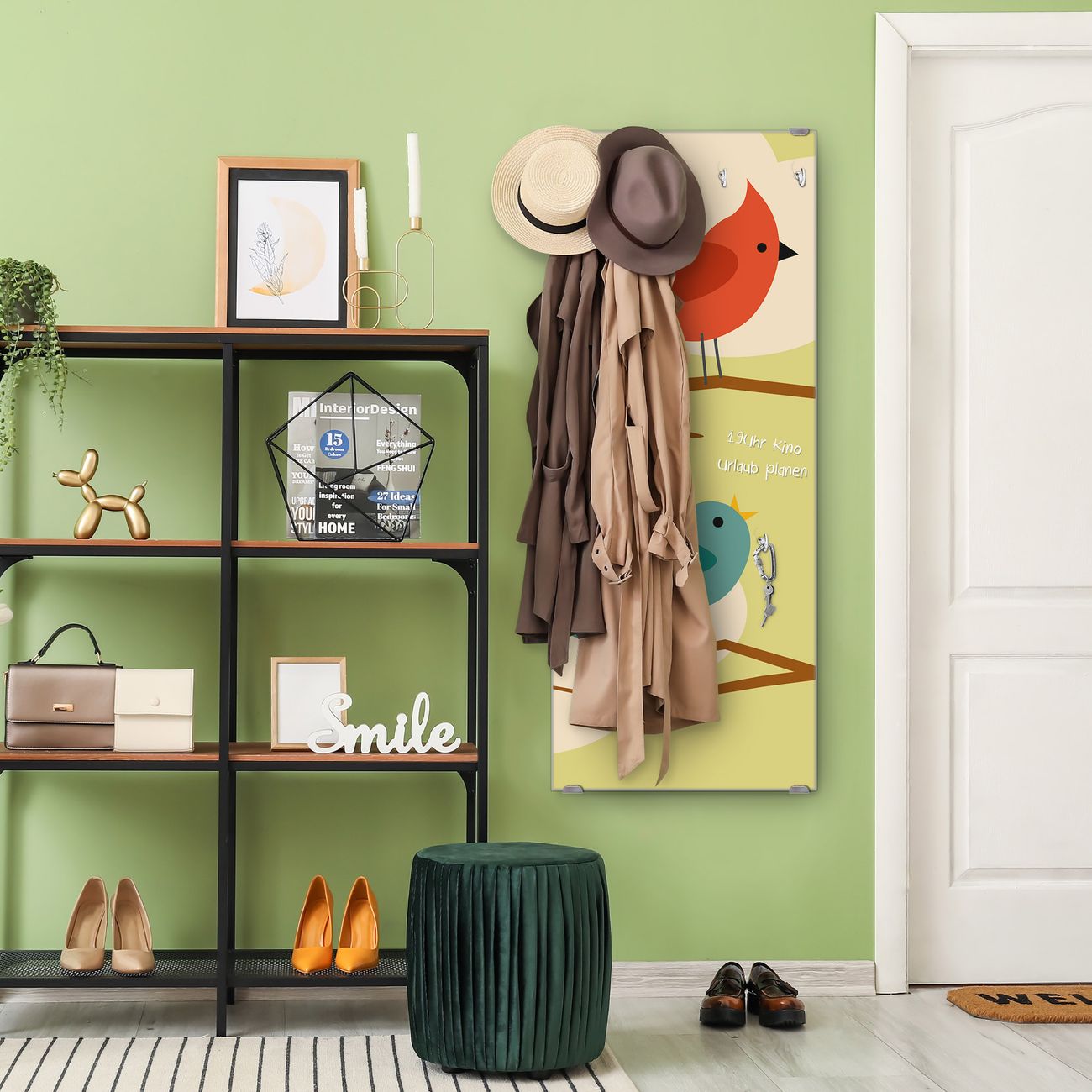 FUNKTION: Die banjado Wandgarderobe mit Motiv Fünf Vögel ist Ihr täglicher Begleiter. Zuverlässig hängen hier Ihre Jacken und Mäntel griffbereit. Das Echtglas ist Ihr Paneel auch beschreibbar und wieder abwischbar. DESIGN: Sie erhalten eine Garderobenleiste aus elegantem Echtglas mit dem Farbbrillanten Motiv Fünf Vögel hinterklebt. Das Design ist zeitlos klassisch, ohne dabei auf Funktionalität zu verzichten. Suchen Sie aus einer Vielzahl von Motiven das für Ihre Einrichtung Passende aus. DETAILS: Die Flurgarderobe besteht aus 4mm gehärtetem Sicherheitsglas. Sie ist 50cm breit, 125cm hoch und 6cm tief. Die Garderobenhaken zur Selbstmontage präsentieren sich in Edelstahl-Optik, ebenso die Abstandshalter für die Wandmontage. Ihre neue Garderobe ist sofort einsatzbereit. NUTZEN: Ihre neue Garderobe hält nicht nur zuverlässig Ihre Kleidung, sie ist auch optisch ein Blickfang. Durch das Glas können Sie an der Garderobe mit wasserlöslichen Kreidestiften oder Whiteboard-Markern auch Nachrichten hinterlassen. BANJADO: Wir sind ein kleines kreatives Team aus Sachsen und entwickeln Produkte die Design und Funktionalität verbinden sollen. Viel Freude mit Ihrer neuen Garderobe wünscht das banjado-Team!