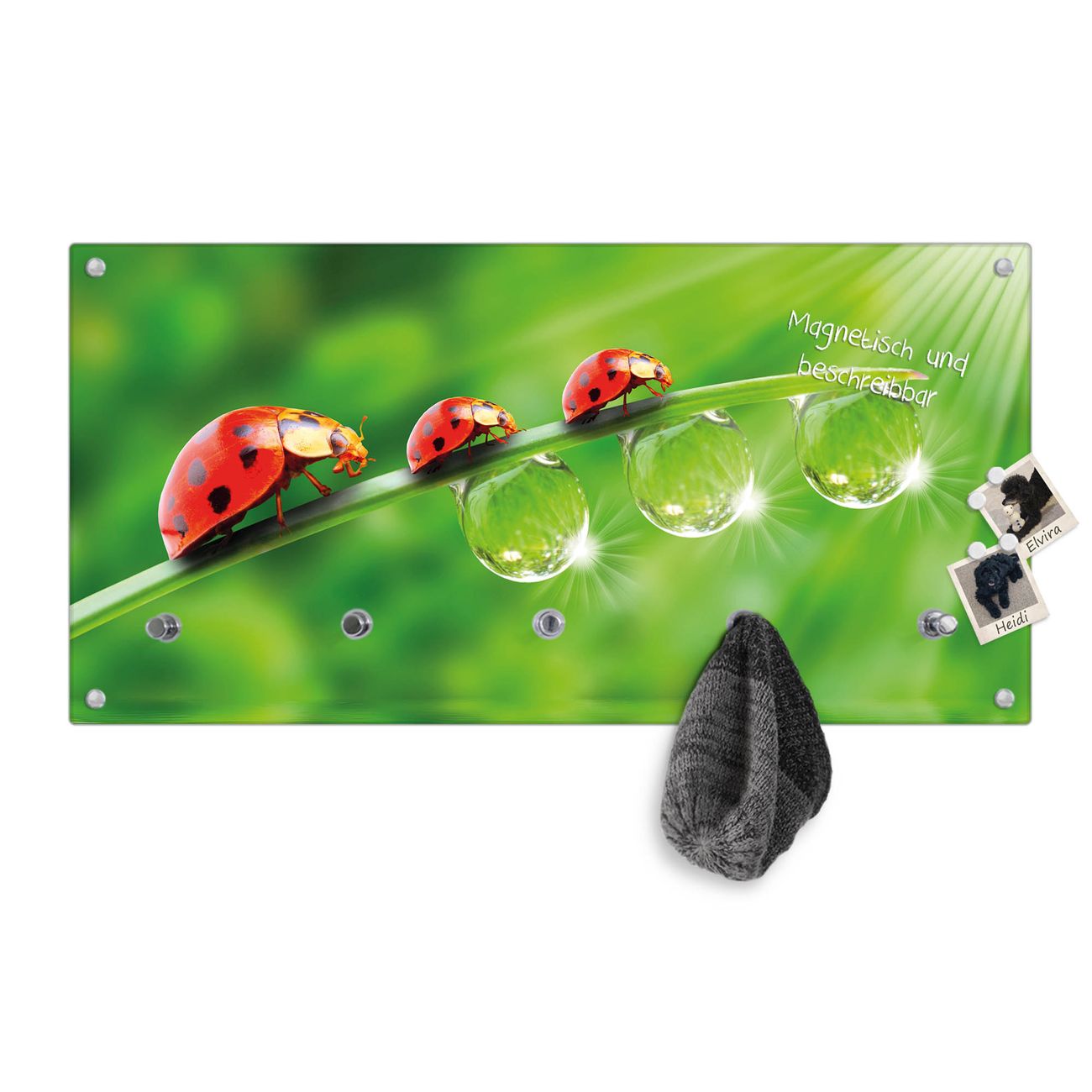 Bitte beachten Sie, dass an dieser Garderobe nur starke Neodym-Magnete halten! FUNKTION: Die banjado Wandgarderobe mit Motiv Für Jeden Einen ist Ihr täglicher Begleiter. Zuverlässig hängen hier Ihre Jacken und Mäntel griffbereit. Gleichzeitig ist die Design Garderobe magnetisch, Sie können Notizen anheften und durch das Echtglas ist Ihr Paneel auch beschreibbar und wieder abwischbar. DESIGN: Sie erhalten eine Garderobenleiste aus elegantem Echtglas mit dem Farbbrillanten Motiv Für Jeden Einen hinterklebt. Das Design ist zeitlos klassisch, ohne dabei auf Funktionalität zu verzichten. Suchen Sie aus einer Vielzahl von Motiven das für Ihre Einrichtung Passende aus. DETAILS: Die Flurgarderobe besteht aus 4mm gehärtetem Sicherheitsglas. Sie ist 80cm breit, 40cm hoch und 6cm tief. Die Garderobenhaken zur Selbstmontage präsentieren sich in Edelstahl-Optik, ebenso die Abstandshalter für die Wandmontage. Ihre neue Garderobe ist sofort einsatzbereit. NUTZEN: Ihre neue Garderobe hält nicht nur zuverlässig Ihre Kleidung, sie ist auch optisch ein Blickfang. Durch die magnetische Wirkung können Sie mit 4 beigefügten extrastarken Neodym-Magneten Notizen anheften und mit wasserlöslichen Kreidestiften oder Whiteboard-Markern auch Nachrichten hinterlassen. BANJADO: Wir sind ein kleines kreatives Team aus Sachsen und entwickeln Produkte die Design und Funktionalität verbinden sollen. Viel Freude mit Ihrer neuen Garderobe wünscht das banjado-Team!
