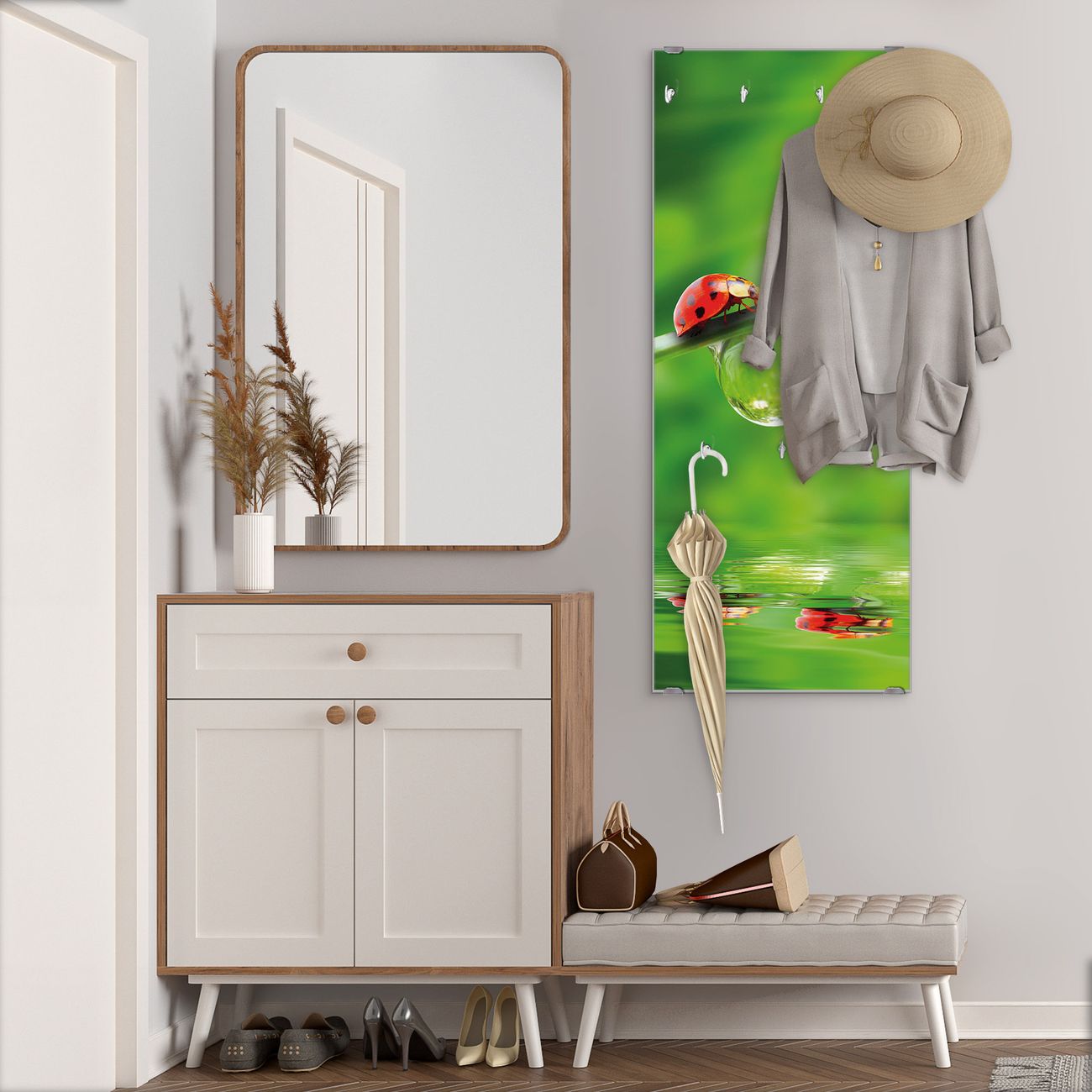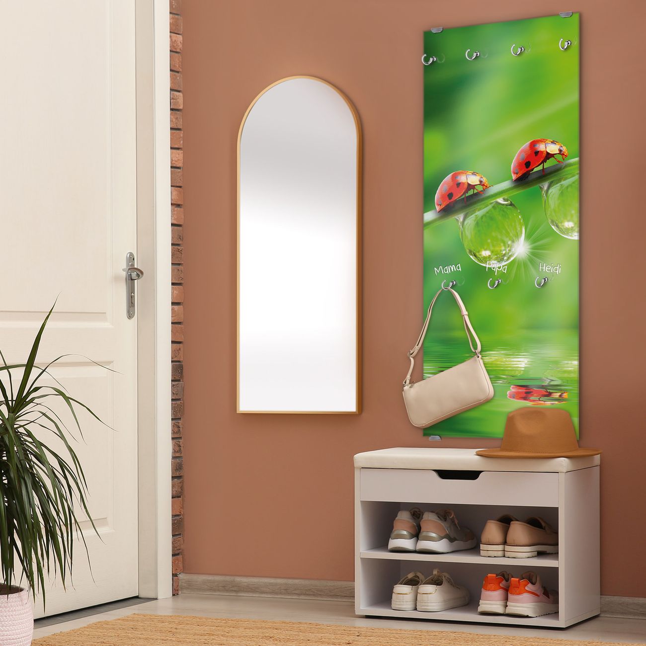 FUNKTION: Die banjado Wandgarderobe mit Motiv Für Jeden Einen ist Ihr täglicher Begleiter. Zuverlässig hängen hier Ihre Jacken und Mäntel griffbereit. Das Echtglas ist Ihr Paneel auch beschreibbar und wieder abwischbar. DESIGN: Sie erhalten eine Garderobenleiste aus elegantem Echtglas mit dem Farbbrillanten Motiv Für Jeden Einen hinterklebt. Das Design ist zeitlos klassisch, ohne dabei auf Funktionalität zu verzichten. Suchen Sie aus einer Vielzahl von Motiven das für Ihre Einrichtung Passende aus. DETAILS: Die Flurgarderobe besteht aus 4mm gehärtetem Sicherheitsglas. Sie ist 50cm breit, 125cm hoch und 6cm tief. Die Garderobenhaken zur Selbstmontage präsentieren sich in Edelstahl-Optik, ebenso die Abstandshalter für die Wandmontage. Ihre neue Garderobe ist sofort einsatzbereit. NUTZEN: Ihre neue Garderobe hält nicht nur zuverlässig Ihre Kleidung, sie ist auch optisch ein Blickfang. Durch das Glas können Sie an der Garderobe mit wasserlöslichen Kreidestiften oder Whiteboard-Markern auch Nachrichten hinterlassen. BANJADO: Wir sind ein kleines kreatives Team aus Sachsen und entwickeln Produkte die Design und Funktionalität verbinden sollen. Viel Freude mit Ihrer neuen Garderobe wünscht das banjado-Team!
