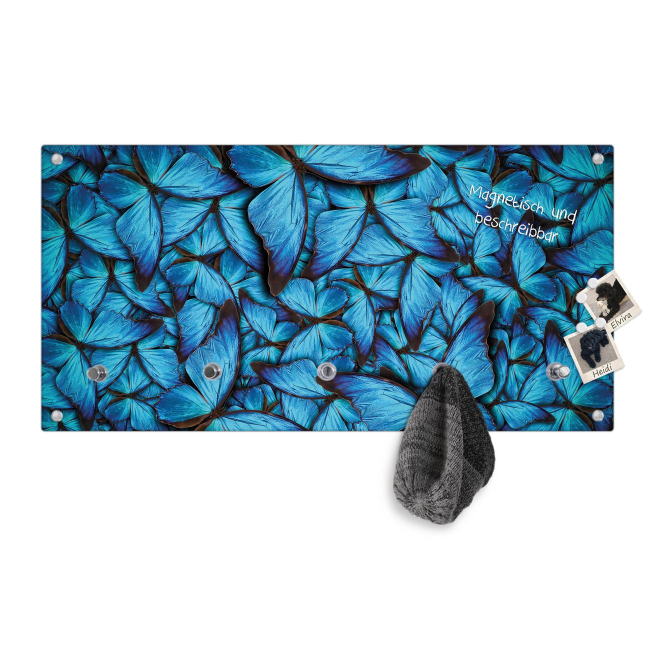 Bitte beachten Sie, dass an dieser Garderobe nur starke Neodym-Magnete halten! FUNKTION: Die banjado Wandgarderobe mit Motiv Fürstliche Falter ist Ihr täglicher Begleiter. Zuverlässig hängen hier Ihre Jacken und Mäntel griffbereit. Gleichzeitig ist die Design Garderobe magnetisch, Sie können Notizen anheften und durch das Echtglas ist Ihr Paneel auch beschreibbar und wieder abwischbar. DESIGN: Sie erhalten eine Garderobenleiste aus elegantem Echtglas mit dem Farbbrillanten Motiv Fürstliche Falter hinterklebt. Das Design ist zeitlos klassisch, ohne dabei auf Funktionalität zu verzichten. Suchen Sie aus einer Vielzahl von Motiven das für Ihre Einrichtung Passende aus. DETAILS: Die Flurgarderobe besteht aus 4mm gehärtetem Sicherheitsglas. Sie ist 80cm breit, 40cm hoch und 6cm tief. Die Garderobenhaken zur Selbstmontage präsentieren sich in Edelstahl-Optik, ebenso die Abstandshalter für die Wandmontage. Ihre neue Garderobe ist sofort einsatzbereit. NUTZEN: Ihre neue Garderobe hält nicht nur zuverlässig Ihre Kleidung, sie ist auch optisch ein Blickfang. Durch die magnetische Wirkung können Sie mit 4 beigefügten extrastarken Neodym-Magneten Notizen anheften und mit wasserlöslichen Kreidestiften oder Whiteboard-Markern auch Nachrichten hinterlassen. BANJADO: Wir sind ein kleines kreatives Team aus Sachsen und entwickeln Produkte die Design und Funktionalität verbinden sollen. Viel Freude mit Ihrer neuen Garderobe wünscht das banjado-Team!