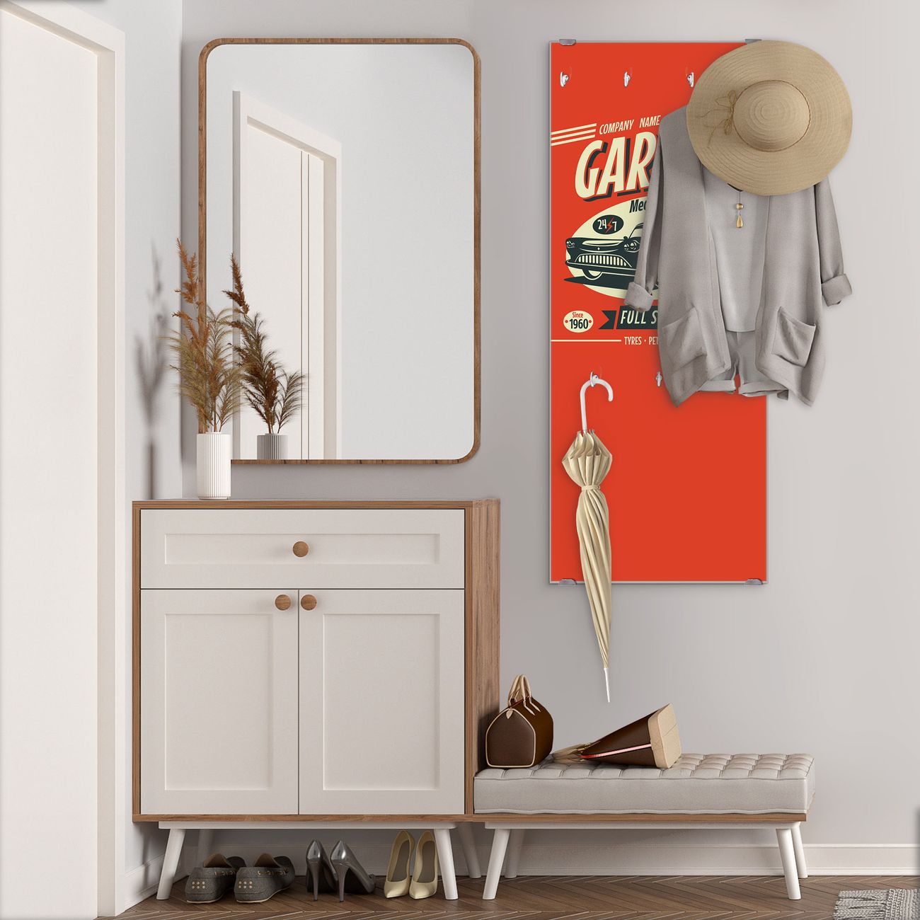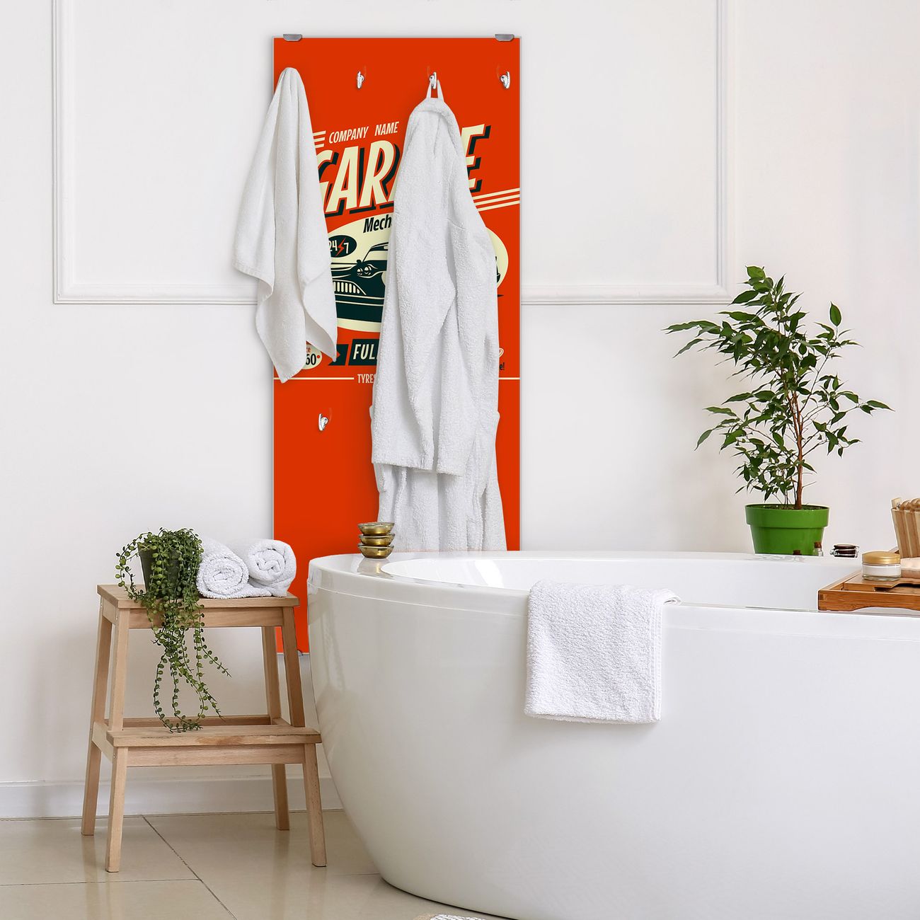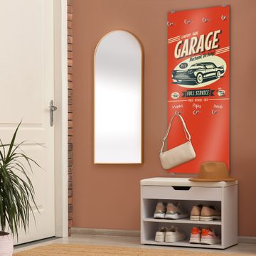 FUNKTION: Die banjado Wandgarderobe mit Motiv Full Service ist Ihr täglicher Begleiter. Zuverlässig hängen hier Ihre Jacken und Mäntel griffbereit. Das Echtglas ist Ihr Paneel auch beschreibbar und wieder abwischbar. DESIGN: Sie erhalten eine Garderobenleiste aus elegantem Echtglas mit dem Farbbrillanten Motiv Full Service hinterklebt. Das Design ist zeitlos klassisch, ohne dabei auf Funktionalität zu verzichten. Suchen Sie aus einer Vielzahl von Motiven das für Ihre Einrichtung Passende aus. DETAILS: Die Flurgarderobe besteht aus 4mm gehärtetem Sicherheitsglas. Sie ist 50cm breit, 125cm hoch und 6cm tief. Die Garderobenhaken zur Selbstmontage präsentieren sich in Edelstahl-Optik, ebenso die Abstandshalter für die Wandmontage. Ihre neue Garderobe ist sofort einsatzbereit. NUTZEN: Ihre neue Garderobe hält nicht nur zuverlässig Ihre Kleidung, sie ist auch optisch ein Blickfang. Durch das Glas können Sie an der Garderobe mit wasserlöslichen Kreidestiften oder Whiteboard-Markern auch Nachrichten hinterlassen. BANJADO: Wir sind ein kleines kreatives Team aus Sachsen und entwickeln Produkte die Design und Funktionalität verbinden sollen. Viel Freude mit Ihrer neuen Garderobe wünscht das banjado-Team!