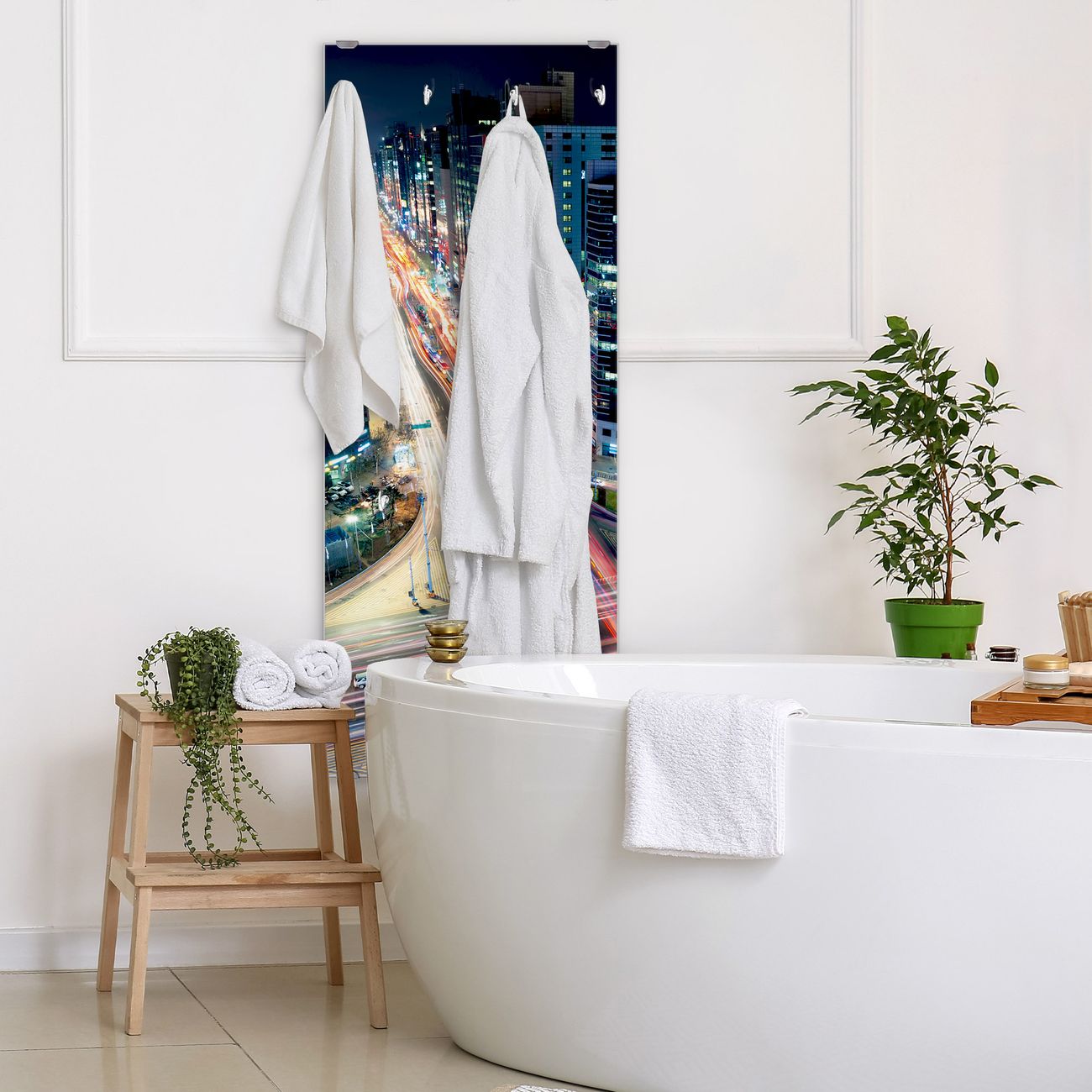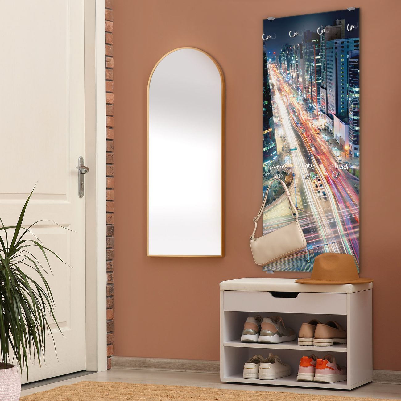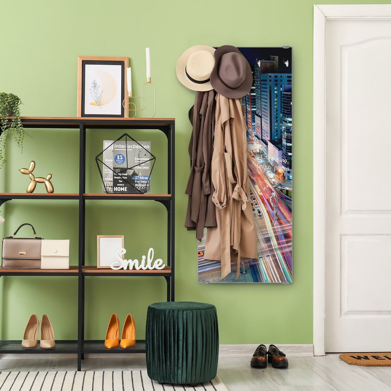 FUNKTION: Die banjado Wandgarderobe mit Motiv Gangnam Bei Nacht ist Ihr täglicher Begleiter. Zuverlässig hängen hier Ihre Jacken und Mäntel griffbereit. Das Echtglas ist Ihr Paneel auch beschreibbar und wieder abwischbar. DESIGN: Sie erhalten eine Garderobenleiste aus elegantem Echtglas mit dem Farbbrillanten Motiv Gangnam Bei Nacht hinterklebt. Das Design ist zeitlos klassisch, ohne dabei auf Funktionalität zu verzichten. Suchen Sie aus einer Vielzahl von Motiven das für Ihre Einrichtung Passende aus. DETAILS: Die Flurgarderobe besteht aus 4mm gehärtetem Sicherheitsglas. Sie ist 50cm breit, 125cm hoch und 6cm tief. Die Garderobenhaken zur Selbstmontage präsentieren sich in Edelstahl-Optik, ebenso die Abstandshalter für die Wandmontage. Ihre neue Garderobe ist sofort einsatzbereit. NUTZEN: Ihre neue Garderobe hält nicht nur zuverlässig Ihre Kleidung, sie ist auch optisch ein Blickfang. Durch das Glas können Sie an der Garderobe mit wasserlöslichen Kreidestiften oder Whiteboard-Markern auch Nachrichten hinterlassen. BANJADO: Wir sind ein kleines kreatives Team aus Sachsen und entwickeln Produkte die Design und Funktionalität verbinden sollen. Viel Freude mit Ihrer neuen Garderobe wünscht das banjado-Team!