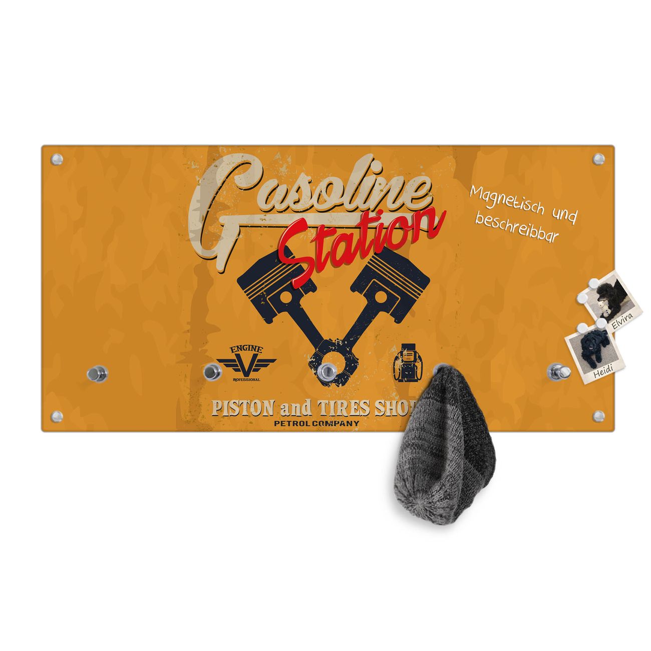 Bitte beachten Sie, dass an dieser Garderobe nur starke Neodym-Magnete halten! FUNKTION: Die banjado Wandgarderobe mit Motiv Gasoline Station ist Ihr täglicher Begleiter. Zuverlässig hängen hier Ihre Jacken und Mäntel griffbereit. Gleichzeitig ist die Design Garderobe magnetisch, Sie können Notizen anheften und durch das Echtglas ist Ihr Paneel auch beschreibbar und wieder abwischbar. DESIGN: Sie erhalten eine Garderobenleiste aus elegantem Echtglas mit dem Farbbrillanten Motiv Gasoline Station hinterklebt. Das Design ist zeitlos klassisch, ohne dabei auf Funktionalität zu verzichten. Suchen Sie aus einer Vielzahl von Motiven das für Ihre Einrichtung Passende aus. DETAILS: Die Flurgarderobe besteht aus 4mm gehärtetem Sicherheitsglas. Sie ist 80cm breit, 40cm hoch und 6cm tief. Die Garderobenhaken zur Selbstmontage präsentieren sich in Edelstahl-Optik, ebenso die Abstandshalter für die Wandmontage. Ihre neue Garderobe ist sofort einsatzbereit. NUTZEN: Ihre neue Garderobe hält nicht nur zuverlässig Ihre Kleidung, sie ist auch optisch ein Blickfang. Durch die magnetische Wirkung können Sie mit 4 beigefügten extrastarken Neodym-Magneten Notizen anheften und mit wasserlöslichen Kreidestiften oder Whiteboard-Markern auch Nachrichten hinterlassen. BANJADO: Wir sind ein kleines kreatives Team aus Sachsen und entwickeln Produkte die Design und Funktionalität verbinden sollen. Viel Freude mit Ihrer neuen Garderobe wünscht das banjado-Team!