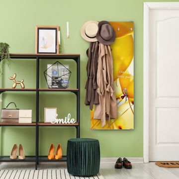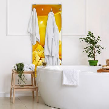 FUNKTION: Die banjado Wandgarderobe mit Motiv Gelbe Luftballons ist Ihr täglicher Begleiter. Zuverlässig hängen hier Ihre Jacken und Mäntel griffbereit. Das Echtglas ist Ihr Paneel auch beschreibbar und wieder abwischbar. DESIGN: Sie erhalten eine Garderobenleiste aus elegantem Echtglas mit dem Farbbrillanten Motiv Gelbe Luftballons hinterklebt. Das Design ist zeitlos klassisch, ohne dabei auf Funktionalität zu verzichten. Suchen Sie aus einer Vielzahl von Motiven das für Ihre Einrichtung Passende aus. DETAILS: Die Flurgarderobe besteht aus 4mm gehärtetem Sicherheitsglas. Sie ist 50cm breit, 125cm hoch und 6cm tief. Die Garderobenhaken zur Selbstmontage präsentieren sich in Edelstahl-Optik, ebenso die Abstandshalter für die Wandmontage. Ihre neue Garderobe ist sofort einsatzbereit. NUTZEN: Ihre neue Garderobe hält nicht nur zuverlässig Ihre Kleidung, sie ist auch optisch ein Blickfang. Durch das Glas können Sie an der Garderobe mit wasserlöslichen Kreidestiften oder Whiteboard-Markern auch Nachrichten hinterlassen. BANJADO: Wir sind ein kleines kreatives Team aus Sachsen und entwickeln Produkte die Design und Funktionalität verbinden sollen. Viel Freude mit Ihrer neuen Garderobe wünscht das banjado-Team!