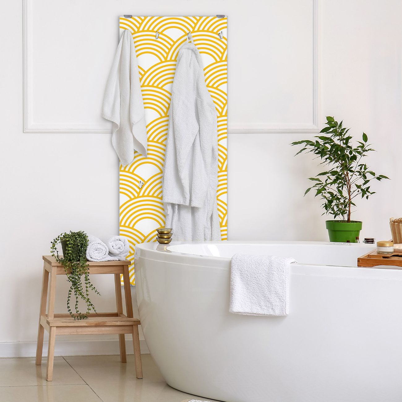 FUNKTION: Die banjado Wandgarderobe mit Motiv Gelbe Wellen ist Ihr täglicher Begleiter. Zuverlässig hängen hier Ihre Jacken und Mäntel griffbereit. Das Echtglas ist Ihr Paneel auch beschreibbar und wieder abwischbar. DESIGN: Sie erhalten eine Garderobenleiste aus elegantem Echtglas mit dem Farbbrillanten Motiv Gelbe Wellen hinterklebt. Das Design ist zeitlos klassisch, ohne dabei auf Funktionalität zu verzichten. Suchen Sie aus einer Vielzahl von Motiven das für Ihre Einrichtung Passende aus. DETAILS: Die Flurgarderobe besteht aus 4mm gehärtetem Sicherheitsglas. Sie ist 50cm breit, 125cm hoch und 6cm tief. Die Garderobenhaken zur Selbstmontage präsentieren sich in Edelstahl-Optik, ebenso die Abstandshalter für die Wandmontage. Ihre neue Garderobe ist sofort einsatzbereit. NUTZEN: Ihre neue Garderobe hält nicht nur zuverlässig Ihre Kleidung, sie ist auch optisch ein Blickfang. Durch das Glas können Sie an der Garderobe mit wasserlöslichen Kreidestiften oder Whiteboard-Markern auch Nachrichten hinterlassen. BANJADO: Wir sind ein kleines kreatives Team aus Sachsen und entwickeln Produkte die Design und Funktionalität verbinden sollen. Viel Freude mit Ihrer neuen Garderobe wünscht das banjado-Team!