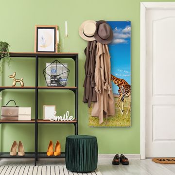 FUNKTION: Die banjado Wandgarderobe mit Motiv Giraffe ist Ihr täglicher Begleiter. Zuverlässig hängen hier Ihre Jacken und Mäntel griffbereit. Das Echtglas ist Ihr Paneel auch beschreibbar und wieder abwischbar. DESIGN: Sie erhalten eine Garderobenleiste aus elegantem Echtglas mit dem Farbbrillanten Motiv Giraffe hinterklebt. Das Design ist zeitlos klassisch, ohne dabei auf Funktionalität zu verzichten. Suchen Sie aus einer Vielzahl von Motiven das für Ihre Einrichtung Passende aus. DETAILS: Die Flurgarderobe besteht aus 4mm gehärtetem Sicherheitsglas. Sie ist 50cm breit, 125cm hoch und 6cm tief. Die Garderobenhaken zur Selbstmontage präsentieren sich in Edelstahl-Optik, ebenso die Abstandshalter für die Wandmontage. Ihre neue Garderobe ist sofort einsatzbereit. NUTZEN: Ihre neue Garderobe hält nicht nur zuverlässig Ihre Kleidung, sie ist auch optisch ein Blickfang. Durch das Glas können Sie an der Garderobe mit wasserlöslichen Kreidestiften oder Whiteboard-Markern auch Nachrichten hinterlassen. BANJADO: Wir sind ein kleines kreatives Team aus Sachsen und entwickeln Produkte die Design und Funktionalität verbinden sollen. Viel Freude mit Ihrer neuen Garderobe wünscht das banjado-Team!
