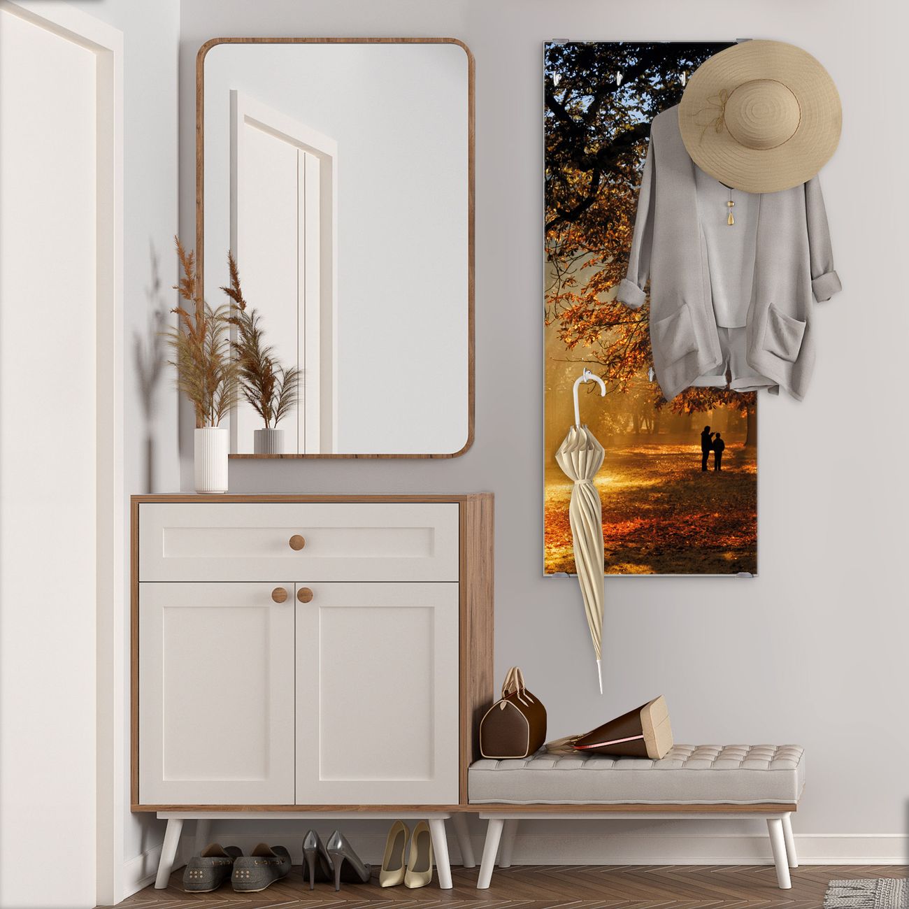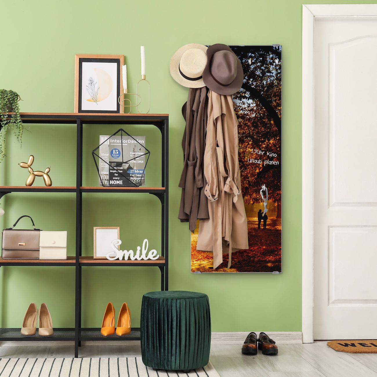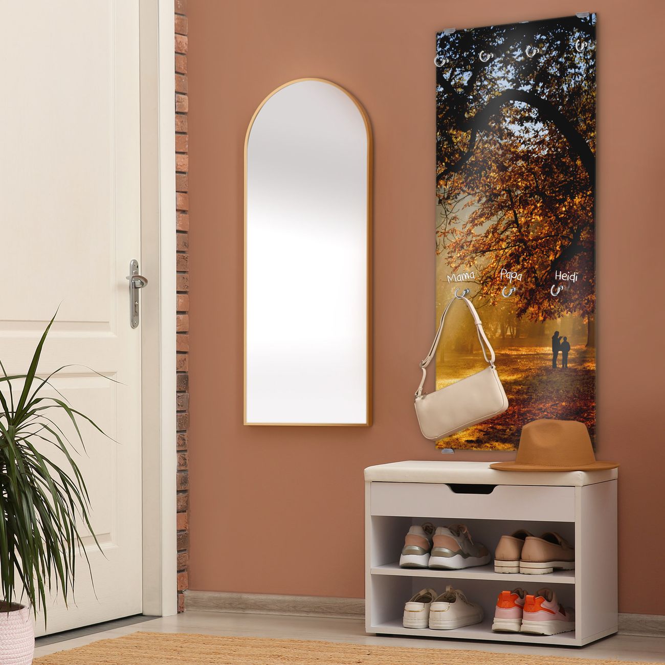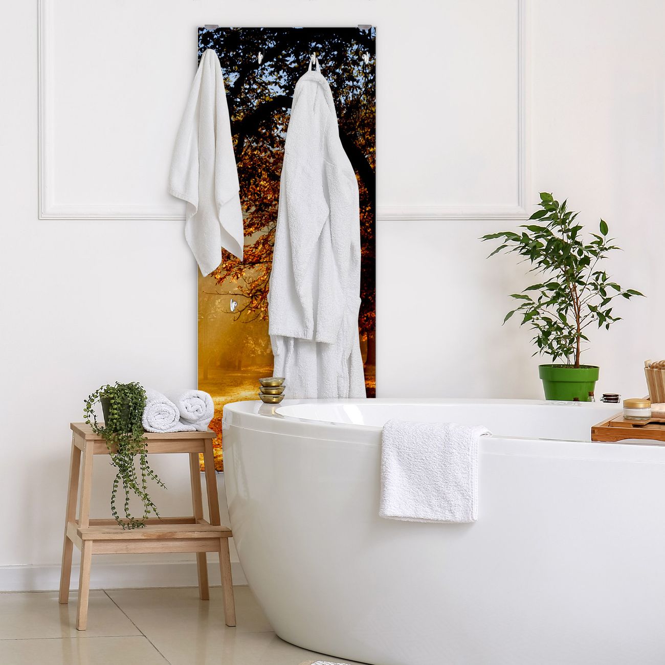 FUNKTION: Die banjado Wandgarderobe mit Motiv Goldener Herbst ist Ihr täglicher Begleiter. Zuverlässig hängen hier Ihre Jacken und Mäntel griffbereit. Das Echtglas ist Ihr Paneel auch beschreibbar und wieder abwischbar. DESIGN: Sie erhalten eine Garderobenleiste aus elegantem Echtglas mit dem Farbbrillanten Motiv Goldener Herbst hinterklebt. Das Design ist zeitlos klassisch, ohne dabei auf Funktionalität zu verzichten. Suchen Sie aus einer Vielzahl von Motiven das für Ihre Einrichtung Passende aus. DETAILS: Die Flurgarderobe besteht aus 4mm gehärtetem Sicherheitsglas. Sie ist 50cm breit, 125cm hoch und 6cm tief. Die Garderobenhaken zur Selbstmontage präsentieren sich in Edelstahl-Optik, ebenso die Abstandshalter für die Wandmontage. Ihre neue Garderobe ist sofort einsatzbereit. NUTZEN: Ihre neue Garderobe hält nicht nur zuverlässig Ihre Kleidung, sie ist auch optisch ein Blickfang. Durch das Glas können Sie an der Garderobe mit wasserlöslichen Kreidestiften oder Whiteboard-Markern auch Nachrichten hinterlassen. BANJADO: Wir sind ein kleines kreatives Team aus Sachsen und entwickeln Produkte die Design und Funktionalität verbinden sollen. Viel Freude mit Ihrer neuen Garderobe wünscht das banjado-Team!