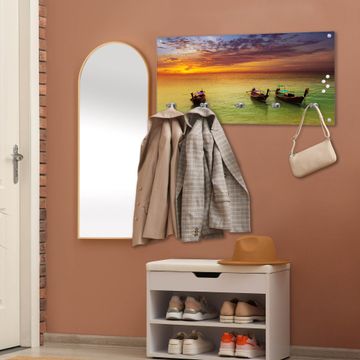Bitte beachten Sie, dass an dieser Garderobe nur starke Neodym-Magnete halten! FUNKTION: Die banjado Wandgarderobe mit Motiv Golf Von Thailand ist Ihr täglicher Begleiter. Zuverlässig hängen hier Ihre Jacken und Mäntel griffbereit. Gleichzeitig ist die Design Garderobe magnetisch, Sie können Notizen anheften und durch das Echtglas ist Ihr Paneel auch beschreibbar und wieder abwischbar. DESIGN: Sie erhalten eine Garderobenleiste aus elegantem Echtglas mit dem Farbbrillanten Motiv Golf Von Thailand hinterklebt. Das Design ist zeitlos klassisch, ohne dabei auf Funktionalität zu verzichten. Suchen Sie aus einer Vielzahl von Motiven das für Ihre Einrichtung Passende aus. DETAILS: Die Flurgarderobe besteht aus 4mm gehärtetem Sicherheitsglas. Sie ist 80cm breit, 40cm hoch und 6cm tief. Die Garderobenhaken zur Selbstmontage präsentieren sich in Edelstahl-Optik, ebenso die Abstandshalter für die Wandmontage. Ihre neue Garderobe ist sofort einsatzbereit. NUTZEN: Ihre neue Garderobe hält nicht nur zuverlässig Ihre Kleidung, sie ist auch optisch ein Blickfang. Durch die magnetische Wirkung können Sie mit 4 beigefügten extrastarken Neodym-Magneten Notizen anheften und mit wasserlöslichen Kreidestiften oder Whiteboard-Markern auch Nachrichten hinterlassen. BANJADO: Wir sind ein kleines kreatives Team aus Sachsen und entwickeln Produkte die Design und Funktionalität verbinden sollen. Viel Freude mit Ihrer neuen Garderobe wünscht das banjado-Team!