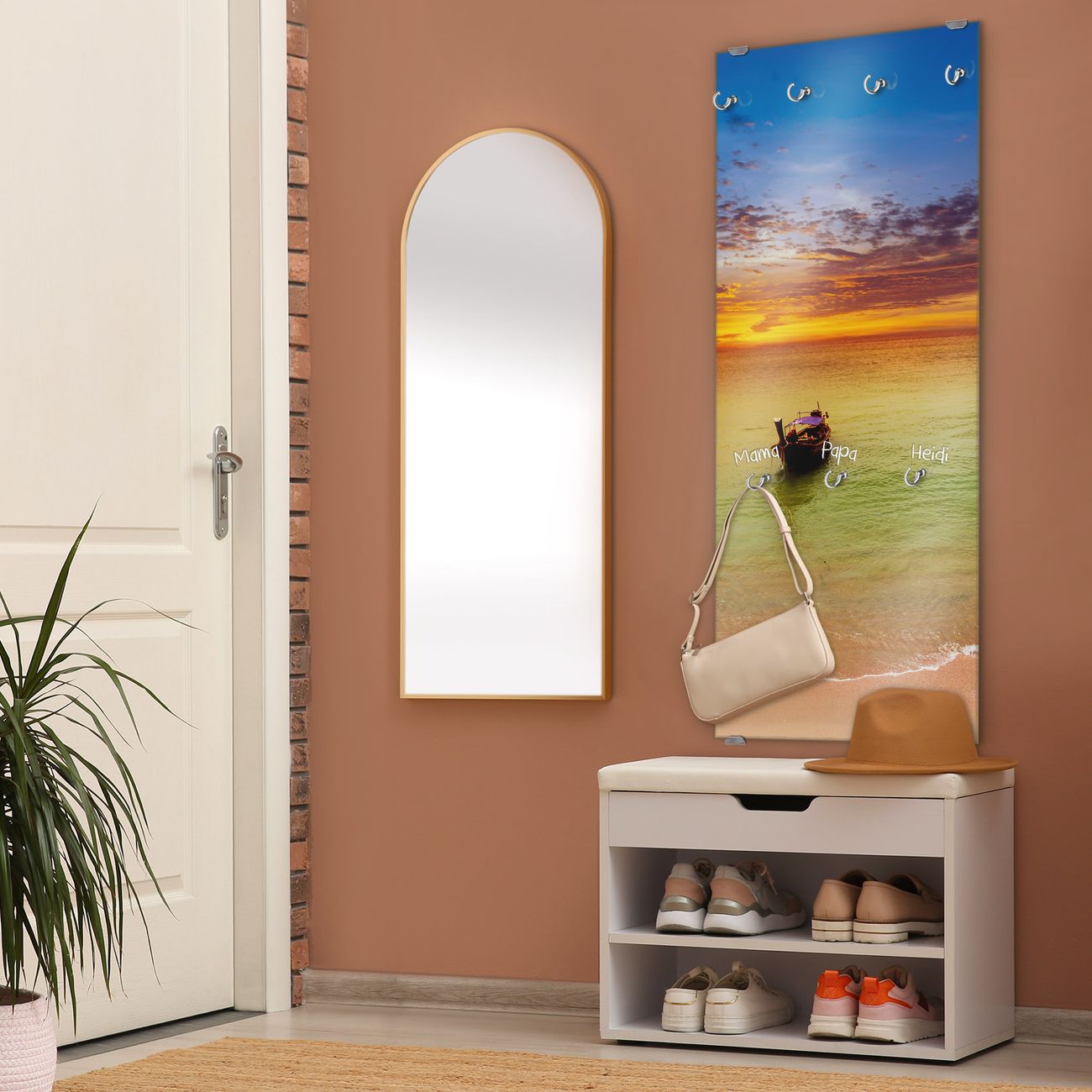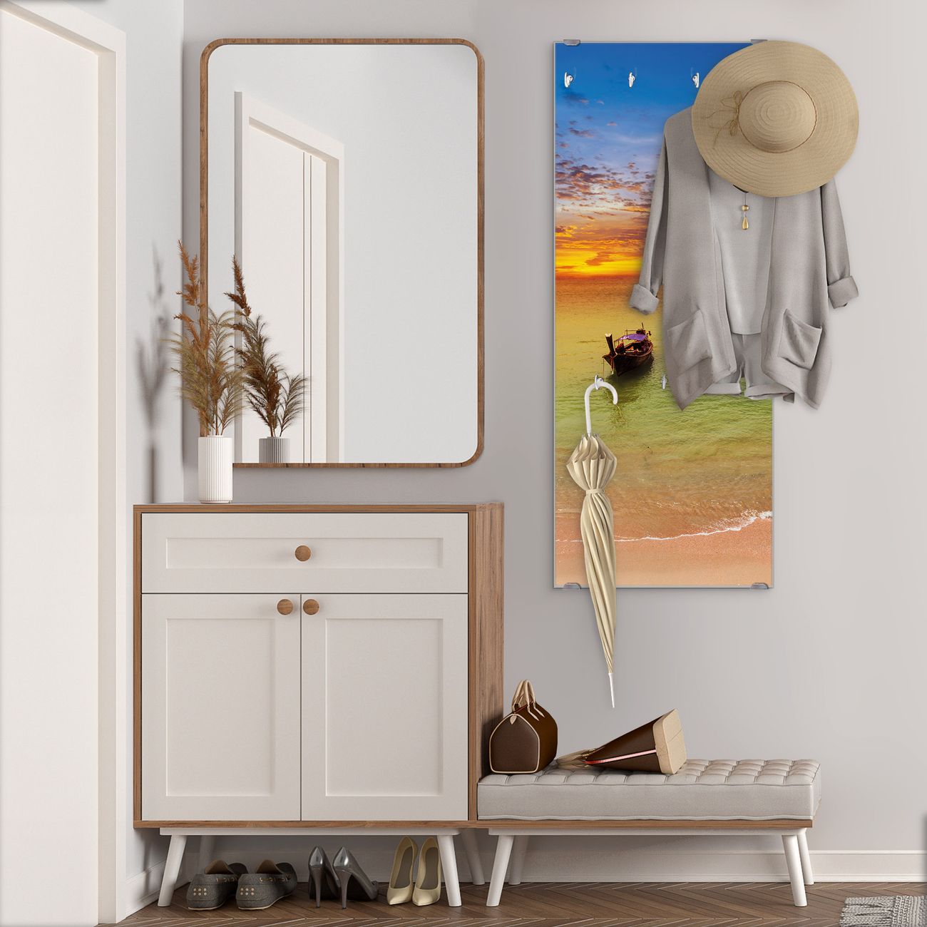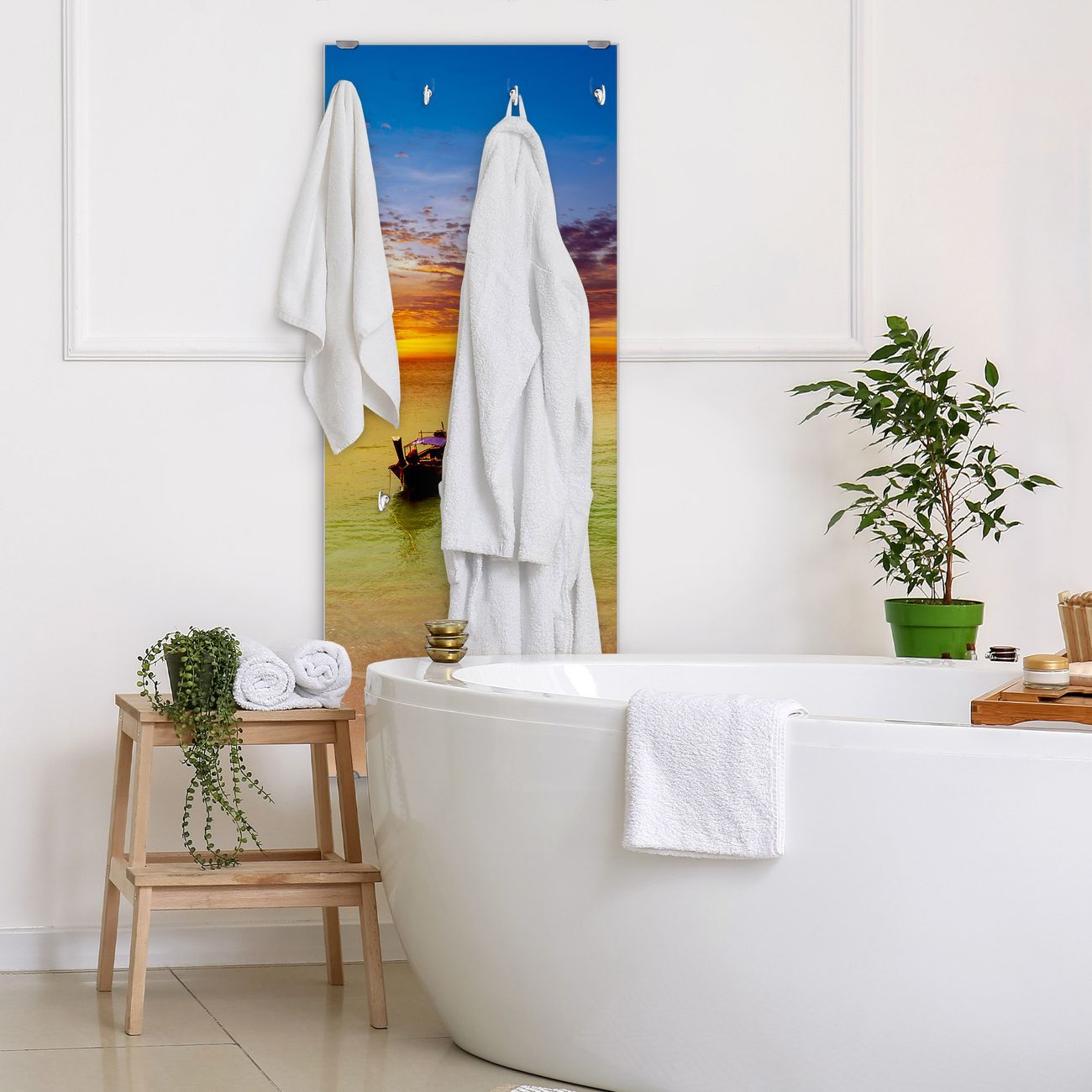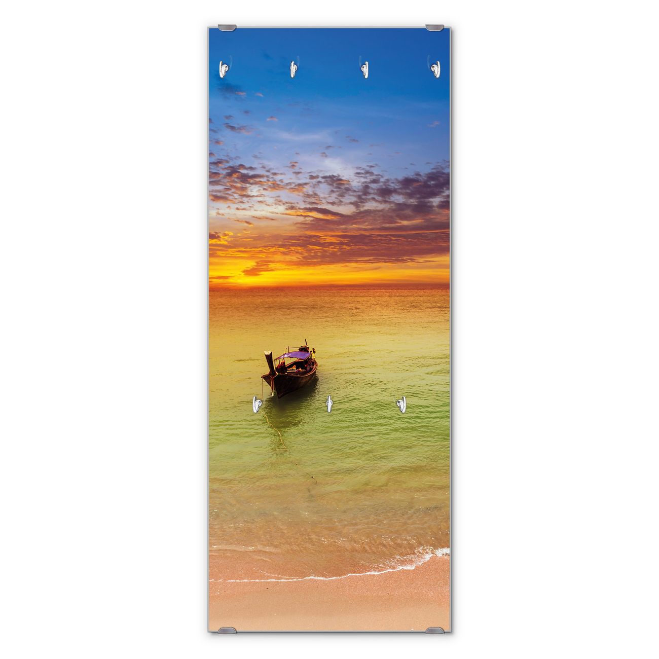 FUNKTION: Die banjado Wandgarderobe mit Motiv Golf Von Thailand ist Ihr täglicher Begleiter. Zuverlässig hängen hier Ihre Jacken und Mäntel griffbereit. Das Echtglas ist Ihr Paneel auch beschreibbar und wieder abwischbar. DESIGN: Sie erhalten eine Garderobenleiste aus elegantem Echtglas mit dem Farbbrillanten Motiv Golf Von Thailand hinterklebt. Das Design ist zeitlos klassisch, ohne dabei auf Funktionalität zu verzichten. Suchen Sie aus einer Vielzahl von Motiven das für Ihre Einrichtung Passende aus. DETAILS: Die Flurgarderobe besteht aus 4mm gehärtetem Sicherheitsglas. Sie ist 50cm breit, 125cm hoch und 6cm tief. Die Garderobenhaken zur Selbstmontage präsentieren sich in Edelstahl-Optik, ebenso die Abstandshalter für die Wandmontage. Ihre neue Garderobe ist sofort einsatzbereit. NUTZEN: Ihre neue Garderobe hält nicht nur zuverlässig Ihre Kleidung, sie ist auch optisch ein Blickfang. Durch das Glas können Sie an der Garderobe mit wasserlöslichen Kreidestiften oder Whiteboard-Markern auch Nachrichten hinterlassen. BANJADO: Wir sind ein kleines kreatives Team aus Sachsen und entwickeln Produkte die Design und Funktionalität verbinden sollen. Viel Freude mit Ihrer neuen Garderobe wünscht das banjado-Team!