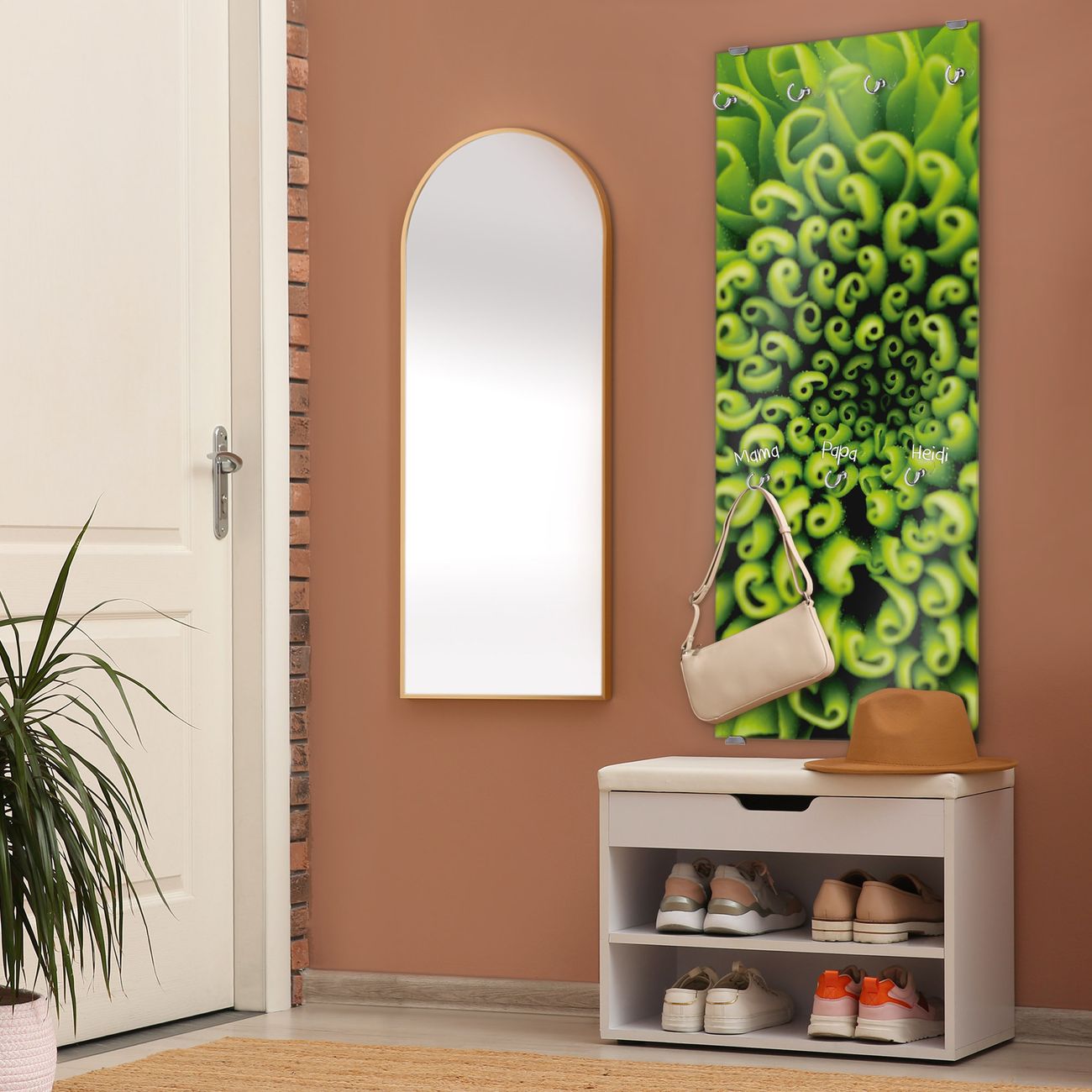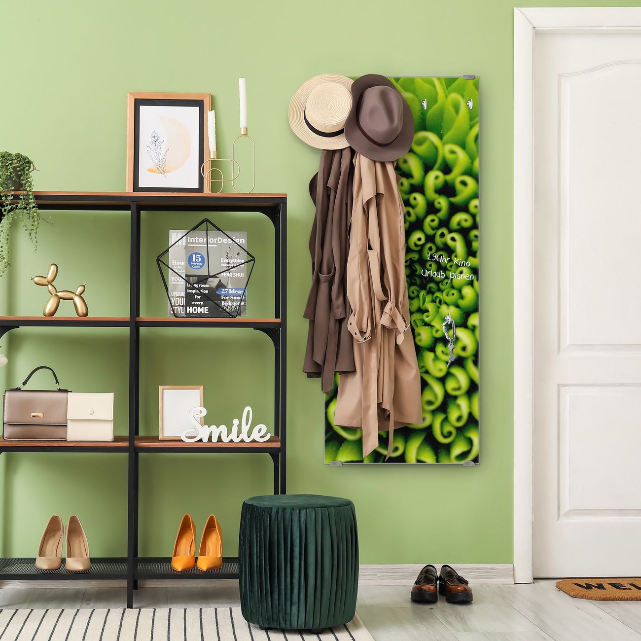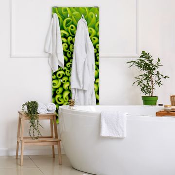 FUNKTION: Die banjado Wandgarderobe mit Motiv Grüne Chrysantheme ist Ihr täglicher Begleiter. Zuverlässig hängen hier Ihre Jacken und Mäntel griffbereit. Das Echtglas ist Ihr Paneel auch beschreibbar und wieder abwischbar. DESIGN: Sie erhalten eine Garderobenleiste aus elegantem Echtglas mit dem Farbbrillanten Motiv Grüne Chrysantheme hinterklebt. Das Design ist zeitlos klassisch, ohne dabei auf Funktionalität zu verzichten. Suchen Sie aus einer Vielzahl von Motiven das für Ihre Einrichtung Passende aus. DETAILS: Die Flurgarderobe besteht aus 4mm gehärtetem Sicherheitsglas. Sie ist 50cm breit, 125cm hoch und 6cm tief. Die Garderobenhaken zur Selbstmontage präsentieren sich in Edelstahl-Optik, ebenso die Abstandshalter für die Wandmontage. Ihre neue Garderobe ist sofort einsatzbereit. NUTZEN: Ihre neue Garderobe hält nicht nur zuverlässig Ihre Kleidung, sie ist auch optisch ein Blickfang. Durch das Glas können Sie an der Garderobe mit wasserlöslichen Kreidestiften oder Whiteboard-Markern auch Nachrichten hinterlassen. BANJADO: Wir sind ein kleines kreatives Team aus Sachsen und entwickeln Produkte die Design und Funktionalität verbinden sollen. Viel Freude mit Ihrer neuen Garderobe wünscht das banjado-Team!
