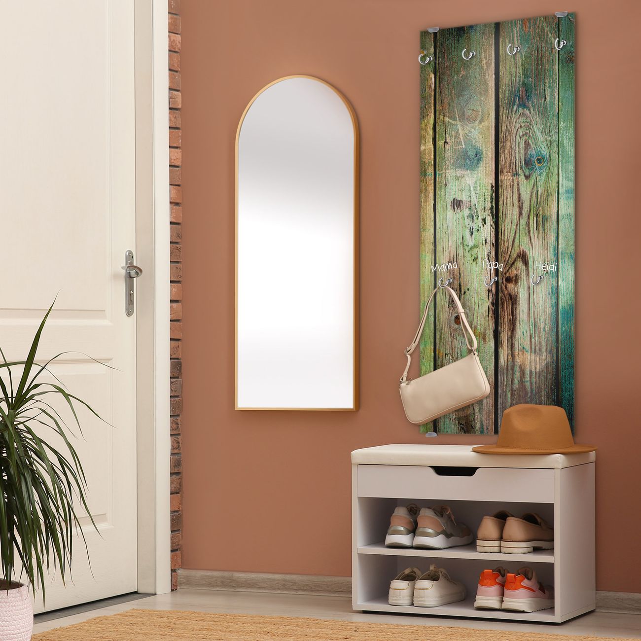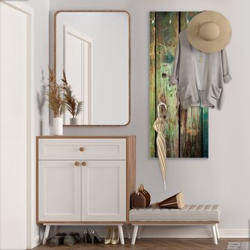 FUNKTION: Die banjado Wandgarderobe mit Motiv Grünes Holz ist Ihr täglicher Begleiter. Zuverlässig hängen hier Ihre Jacken und Mäntel griffbereit. Das Echtglas ist Ihr Paneel auch beschreibbar und wieder abwischbar. DESIGN: Sie erhalten eine Garderobenleiste aus elegantem Echtglas mit dem Farbbrillanten Motiv Grünes Holz hinterklebt. Das Design ist zeitlos klassisch, ohne dabei auf Funktionalität zu verzichten. Suchen Sie aus einer Vielzahl von Motiven das für Ihre Einrichtung Passende aus. DETAILS: Die Flurgarderobe besteht aus 4mm gehärtetem Sicherheitsglas. Sie ist 50cm breit, 125cm hoch und 6cm tief. Die Garderobenhaken zur Selbstmontage präsentieren sich in Edelstahl-Optik, ebenso die Abstandshalter für die Wandmontage. Ihre neue Garderobe ist sofort einsatzbereit. NUTZEN: Ihre neue Garderobe hält nicht nur zuverlässig Ihre Kleidung, sie ist auch optisch ein Blickfang. Durch das Glas können Sie an der Garderobe mit wasserlöslichen Kreidestiften oder Whiteboard-Markern auch Nachrichten hinterlassen. BANJADO: Wir sind ein kleines kreatives Team aus Sachsen und entwickeln Produkte die Design und Funktionalität verbinden sollen. Viel Freude mit Ihrer neuen Garderobe wünscht das banjado-Team!