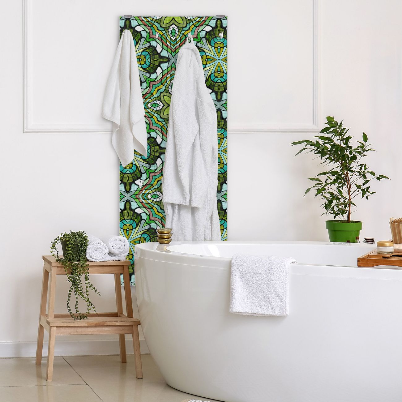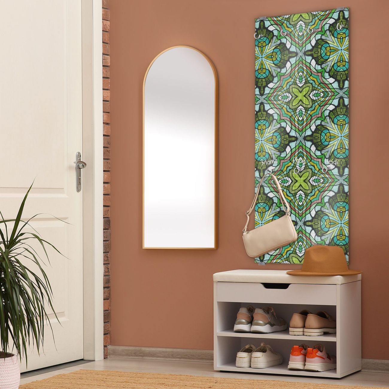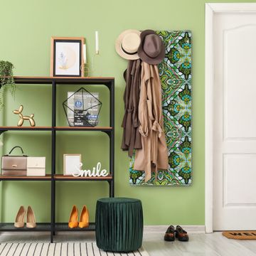 FUNKTION: Die banjado Wandgarderobe mit Motiv Grünes Muster ist Ihr täglicher Begleiter. Zuverlässig hängen hier Ihre Jacken und Mäntel griffbereit. Das Echtglas ist Ihr Paneel auch beschreibbar und wieder abwischbar. DESIGN: Sie erhalten eine Garderobenleiste aus elegantem Echtglas mit dem Farbbrillanten Motiv Grünes Muster hinterklebt. Das Design ist zeitlos klassisch, ohne dabei auf Funktionalität zu verzichten. Suchen Sie aus einer Vielzahl von Motiven das für Ihre Einrichtung Passende aus. DETAILS: Die Flurgarderobe besteht aus 4mm gehärtetem Sicherheitsglas. Sie ist 50cm breit, 125cm hoch und 6cm tief. Die Garderobenhaken zur Selbstmontage präsentieren sich in Edelstahl-Optik, ebenso die Abstandshalter für die Wandmontage. Ihre neue Garderobe ist sofort einsatzbereit. NUTZEN: Ihre neue Garderobe hält nicht nur zuverlässig Ihre Kleidung, sie ist auch optisch ein Blickfang. Durch das Glas können Sie an der Garderobe mit wasserlöslichen Kreidestiften oder Whiteboard-Markern auch Nachrichten hinterlassen. BANJADO: Wir sind ein kleines kreatives Team aus Sachsen und entwickeln Produkte die Design und Funktionalität verbinden sollen. Viel Freude mit Ihrer neuen Garderobe wünscht das banjado-Team!