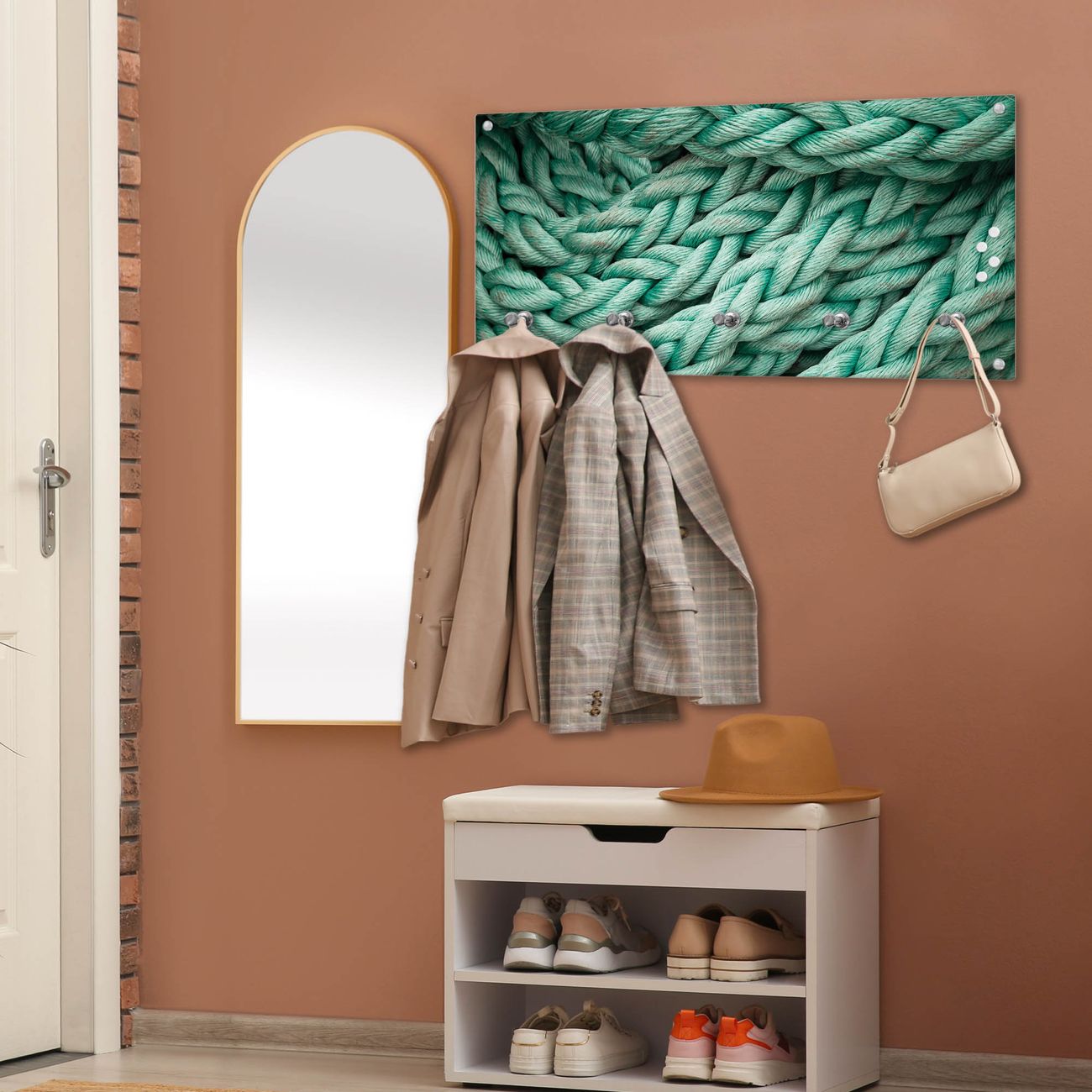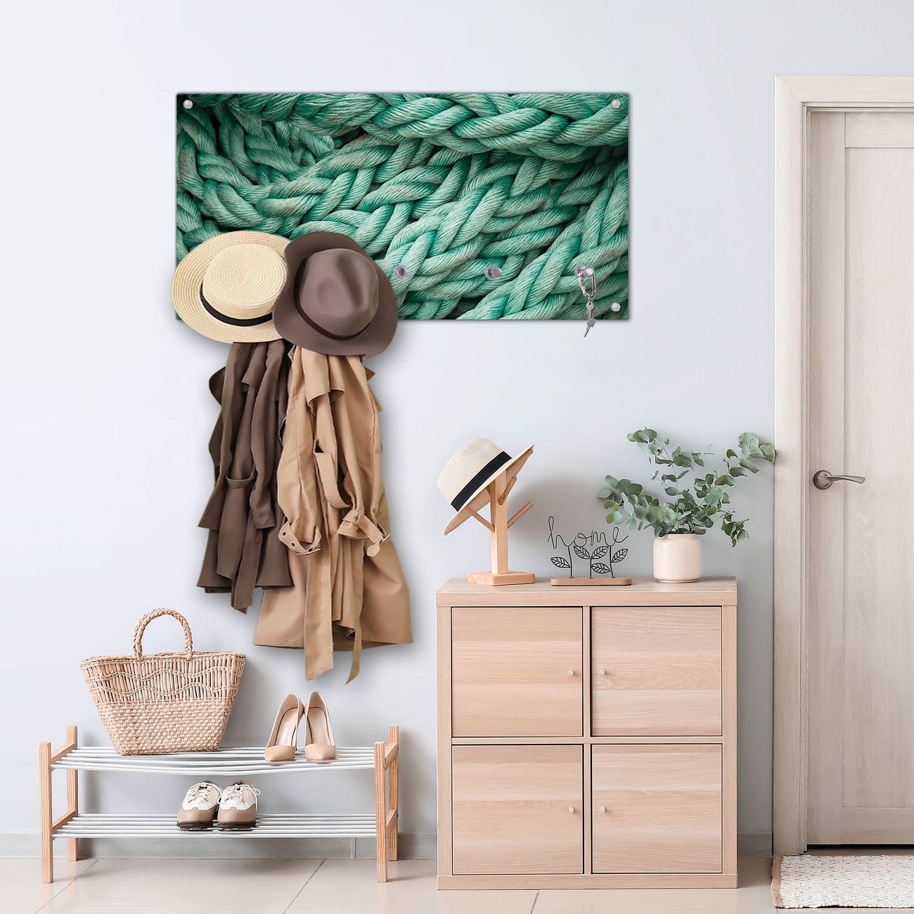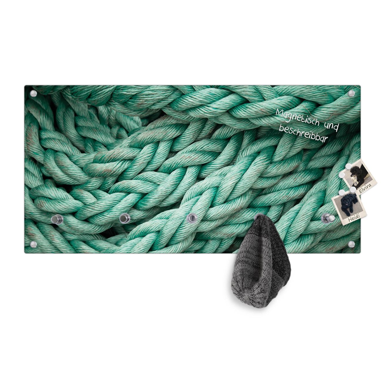 Bitte beachten Sie, dass an dieser Garderobe nur starke Neodym-Magnete halten! FUNKTION: Die banjado Wandgarderobe mit Motiv Grünes Tau ist Ihr täglicher Begleiter. Zuverlässig hängen hier Ihre Jacken und Mäntel griffbereit. Gleichzeitig ist die Design Garderobe magnetisch, Sie können Notizen anheften und durch das Echtglas ist Ihr Paneel auch beschreibbar und wieder abwischbar. DESIGN: Sie erhalten eine Garderobenleiste aus elegantem Echtglas mit dem Farbbrillanten Motiv Grünes Tau hinterklebt. Das Design ist zeitlos klassisch, ohne dabei auf Funktionalität zu verzichten. Suchen Sie aus einer Vielzahl von Motiven das für Ihre Einrichtung Passende aus. DETAILS: Die Flurgarderobe besteht aus 4mm gehärtetem Sicherheitsglas. Sie ist 80cm breit, 40cm hoch und 6cm tief. Die Garderobenhaken zur Selbstmontage präsentieren sich in Edelstahl-Optik, ebenso die Abstandshalter für die Wandmontage. Ihre neue Garderobe ist sofort einsatzbereit. NUTZEN: Ihre neue Garderobe hält nicht nur zuverlässig Ihre Kleidung, sie ist auch optisch ein Blickfang. Durch die magnetische Wirkung können Sie mit 4 beigefügten extrastarken Neodym-Magneten Notizen anheften und mit wasserlöslichen Kreidestiften oder Whiteboard-Markern auch Nachrichten hinterlassen. BANJADO: Wir sind ein kleines kreatives Team aus Sachsen und entwickeln Produkte die Design und Funktionalität verbinden sollen. Viel Freude mit Ihrer neuen Garderobe wünscht das banjado-Team!