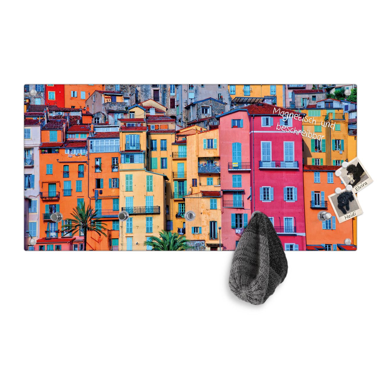 Bitte beachten Sie, dass an dieser Garderobe nur starke Neodym-Magnete halten! FUNKTION: Die banjado Wandgarderobe mit Motiv Häuserberg ist Ihr täglicher Begleiter. Zuverlässig hängen hier Ihre Jacken und Mäntel griffbereit. Gleichzeitig ist die Design Garderobe magnetisch, Sie können Notizen anheften und durch das Echtglas ist Ihr Paneel auch beschreibbar und wieder abwischbar. DESIGN: Sie erhalten eine Garderobenleiste aus elegantem Echtglas mit dem Farbbrillanten Motiv Häuserberg hinterklebt. Das Design ist zeitlos klassisch, ohne dabei auf Funktionalität zu verzichten. Suchen Sie aus einer Vielzahl von Motiven das für Ihre Einrichtung Passende aus. DETAILS: Die Flurgarderobe besteht aus 4mm gehärtetem Sicherheitsglas. Sie ist 80cm breit, 40cm hoch und 6cm tief. Die Garderobenhaken zur Selbstmontage präsentieren sich in Edelstahl-Optik, ebenso die Abstandshalter für die Wandmontage. Ihre neue Garderobe ist sofort einsatzbereit. NUTZEN: Ihre neue Garderobe hält nicht nur zuverlässig Ihre Kleidung, sie ist auch optisch ein Blickfang. Durch die magnetische Wirkung können Sie mit 4 beigefügten extrastarken Neodym-Magneten Notizen anheften und mit wasserlöslichen Kreidestiften oder Whiteboard-Markern auch Nachrichten hinterlassen. BANJADO: Wir sind ein kleines kreatives Team aus Sachsen und entwickeln Produkte die Design und Funktionalität verbinden sollen. Viel Freude mit Ihrer neuen Garderobe wünscht das banjado-Team!