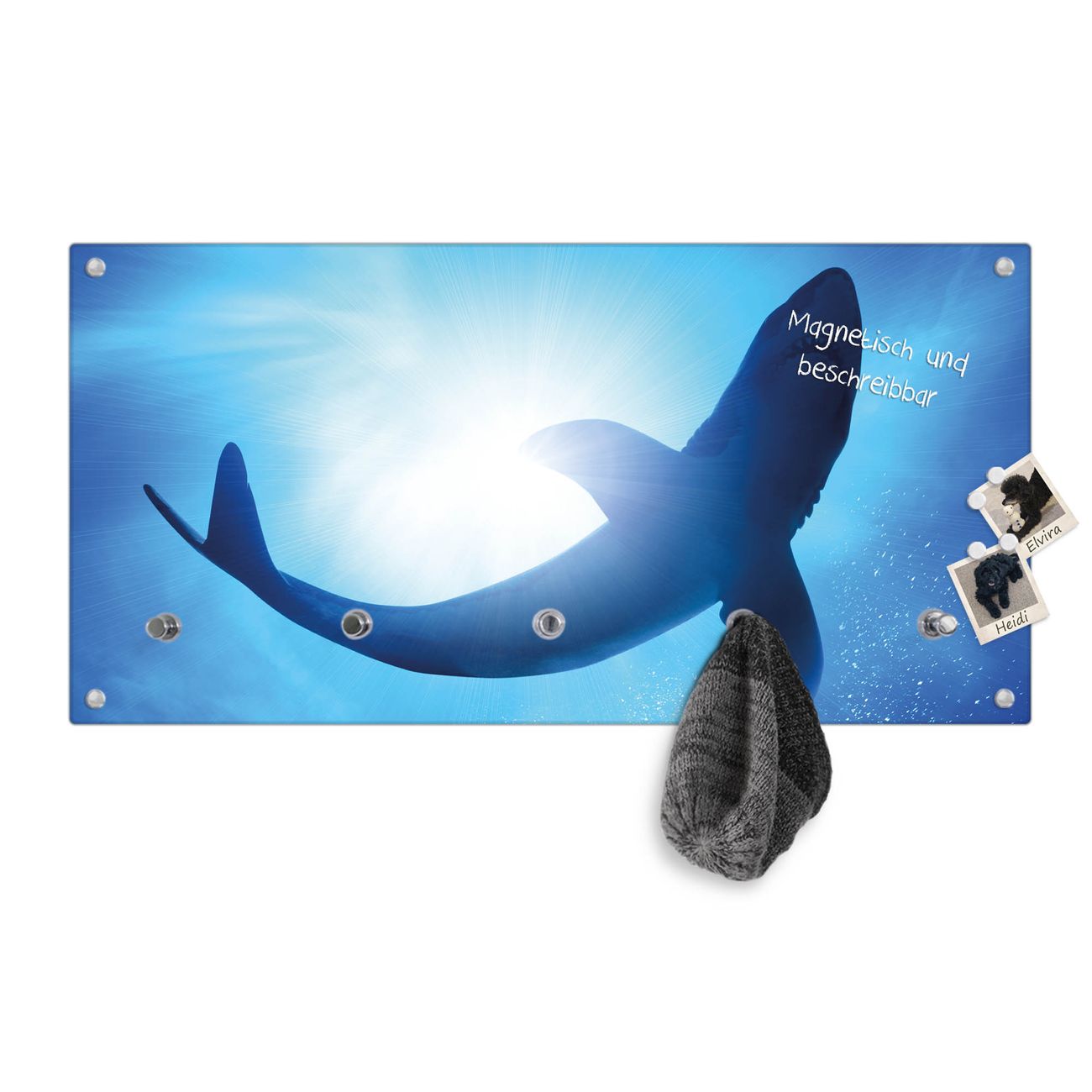Bitte beachten Sie, dass an dieser Garderobe nur starke Neodym-Magnete halten! FUNKTION: Die banjado Wandgarderobe mit Motiv Hai ist Ihr täglicher Begleiter. Zuverlässig hängen hier Ihre Jacken und Mäntel griffbereit. Gleichzeitig ist die Design Garderobe magnetisch, Sie können Notizen anheften und durch das Echtglas ist Ihr Paneel auch beschreibbar und wieder abwischbar. DESIGN: Sie erhalten eine Garderobenleiste aus elegantem Echtglas mit dem Farbbrillanten Motiv Hai hinterklebt. Das Design ist zeitlos klassisch, ohne dabei auf Funktionalität zu verzichten. Suchen Sie aus einer Vielzahl von Motiven das für Ihre Einrichtung Passende aus. DETAILS: Die Flurgarderobe besteht aus 4mm gehärtetem Sicherheitsglas. Sie ist 80cm breit, 40cm hoch und 6cm tief. Die Garderobenhaken zur Selbstmontage präsentieren sich in Edelstahl-Optik, ebenso die Abstandshalter für die Wandmontage. Ihre neue Garderobe ist sofort einsatzbereit. NUTZEN: Ihre neue Garderobe hält nicht nur zuverlässig Ihre Kleidung, sie ist auch optisch ein Blickfang. Durch die magnetische Wirkung können Sie mit 4 beigefügten extrastarken Neodym-Magneten Notizen anheften und mit wasserlöslichen Kreidestiften oder Whiteboard-Markern auch Nachrichten hinterlassen. BANJADO: Wir sind ein kleines kreatives Team aus Sachsen und entwickeln Produkte die Design und Funktionalität verbinden sollen. Viel Freude mit Ihrer neuen Garderobe wünscht das banjado-Team!