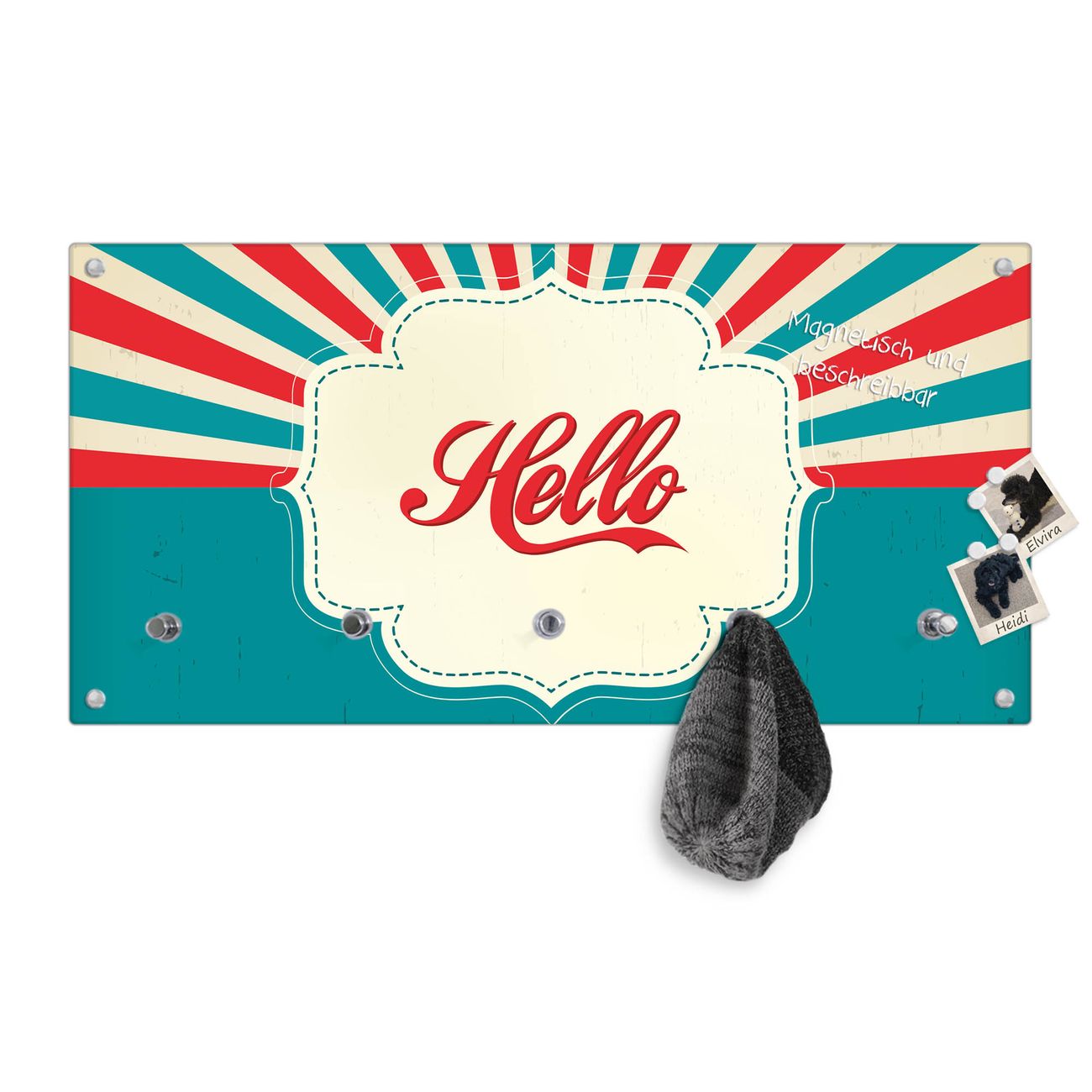 Bitte beachten Sie, dass an dieser Garderobe nur starke Neodym-Magnete halten! FUNKTION: Die banjado Wandgarderobe mit Motiv Hello ist Ihr täglicher Begleiter. Zuverlässig hängen hier Ihre Jacken und Mäntel griffbereit. Gleichzeitig ist die Design Garderobe magnetisch, Sie können Notizen anheften und durch das Echtglas ist Ihr Paneel auch beschreibbar und wieder abwischbar. DESIGN: Sie erhalten eine Garderobenleiste aus elegantem Echtglas mit dem Farbbrillanten Motiv Hello hinterklebt. Das Design ist zeitlos klassisch, ohne dabei auf Funktionalität zu verzichten. Suchen Sie aus einer Vielzahl von Motiven das für Ihre Einrichtung Passende aus. DETAILS: Die Flurgarderobe besteht aus 4mm gehärtetem Sicherheitsglas. Sie ist 80cm breit, 40cm hoch und 6cm tief. Die Garderobenhaken zur Selbstmontage präsentieren sich in Edelstahl-Optik, ebenso die Abstandshalter für die Wandmontage. Ihre neue Garderobe ist sofort einsatzbereit. NUTZEN: Ihre neue Garderobe hält nicht nur zuverlässig Ihre Kleidung, sie ist auch optisch ein Blickfang. Durch die magnetische Wirkung können Sie mit 4 beigefügten extrastarken Neodym-Magneten Notizen anheften und mit wasserlöslichen Kreidestiften oder Whiteboard-Markern auch Nachrichten hinterlassen. BANJADO: Wir sind ein kleines kreatives Team aus Sachsen und entwickeln Produkte die Design und Funktionalität verbinden sollen. Viel Freude mit Ihrer neuen Garderobe wünscht das banjado-Team!