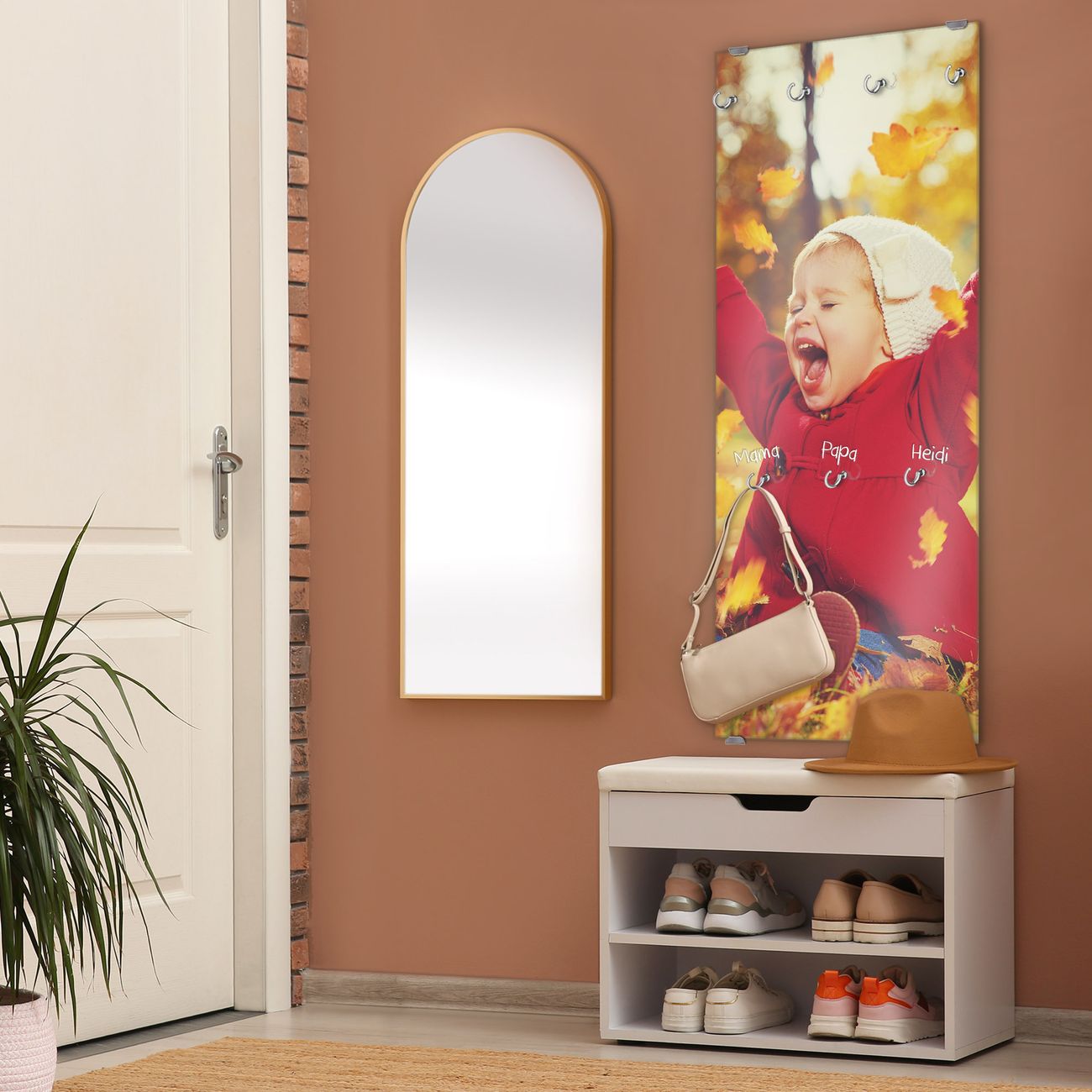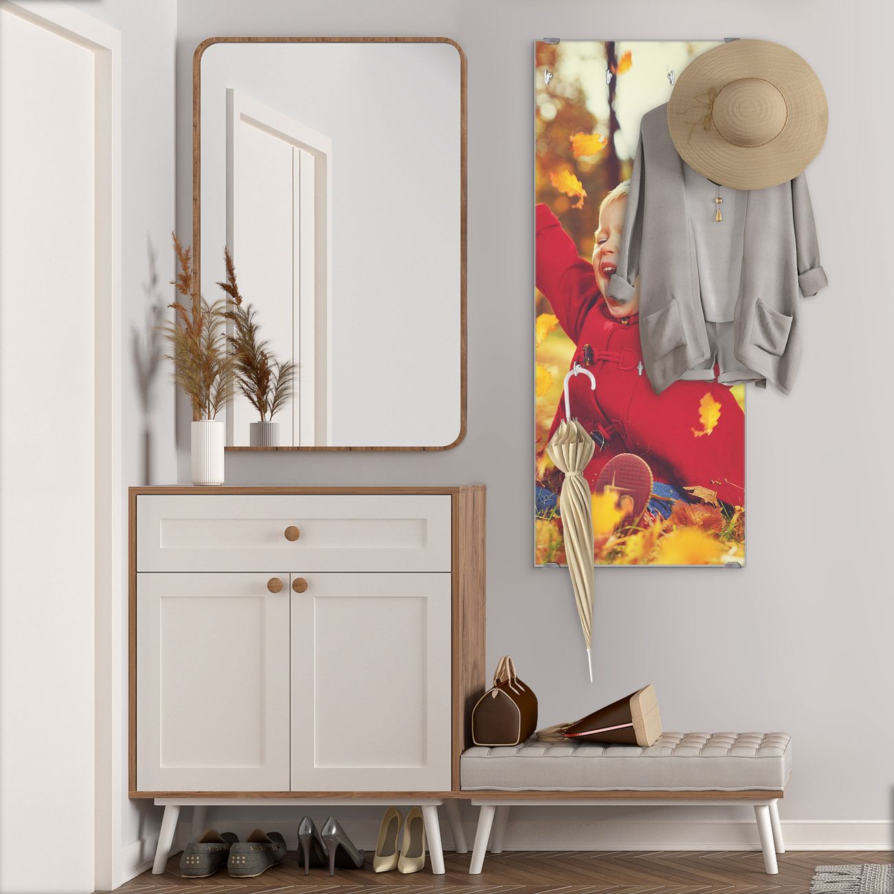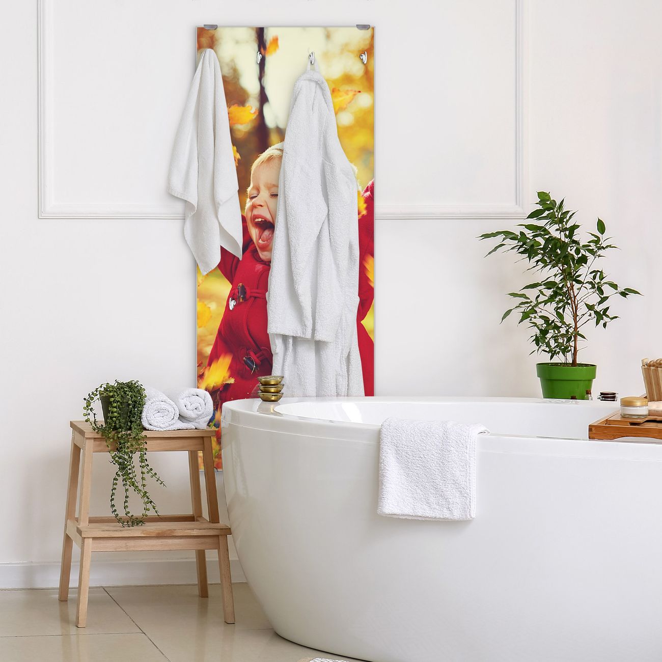 FUNKTION: Die banjado Wandgarderobe mit Motiv Herbstfreude ist Ihr täglicher Begleiter. Zuverlässig hängen hier Ihre Jacken und Mäntel griffbereit. Das Echtglas ist Ihr Paneel auch beschreibbar und wieder abwischbar. DESIGN: Sie erhalten eine Garderobenleiste aus elegantem Echtglas mit dem Farbbrillanten Motiv Herbstfreude hinterklebt. Das Design ist zeitlos klassisch, ohne dabei auf Funktionalität zu verzichten. Suchen Sie aus einer Vielzahl von Motiven das für Ihre Einrichtung Passende aus. DETAILS: Die Flurgarderobe besteht aus 4mm gehärtetem Sicherheitsglas. Sie ist 50cm breit, 125cm hoch und 6cm tief. Die Garderobenhaken zur Selbstmontage präsentieren sich in Edelstahl-Optik, ebenso die Abstandshalter für die Wandmontage. Ihre neue Garderobe ist sofort einsatzbereit. NUTZEN: Ihre neue Garderobe hält nicht nur zuverlässig Ihre Kleidung, sie ist auch optisch ein Blickfang. Durch das Glas können Sie an der Garderobe mit wasserlöslichen Kreidestiften oder Whiteboard-Markern auch Nachrichten hinterlassen. BANJADO: Wir sind ein kleines kreatives Team aus Sachsen und entwickeln Produkte die Design und Funktionalität verbinden sollen. Viel Freude mit Ihrer neuen Garderobe wünscht das banjado-Team!