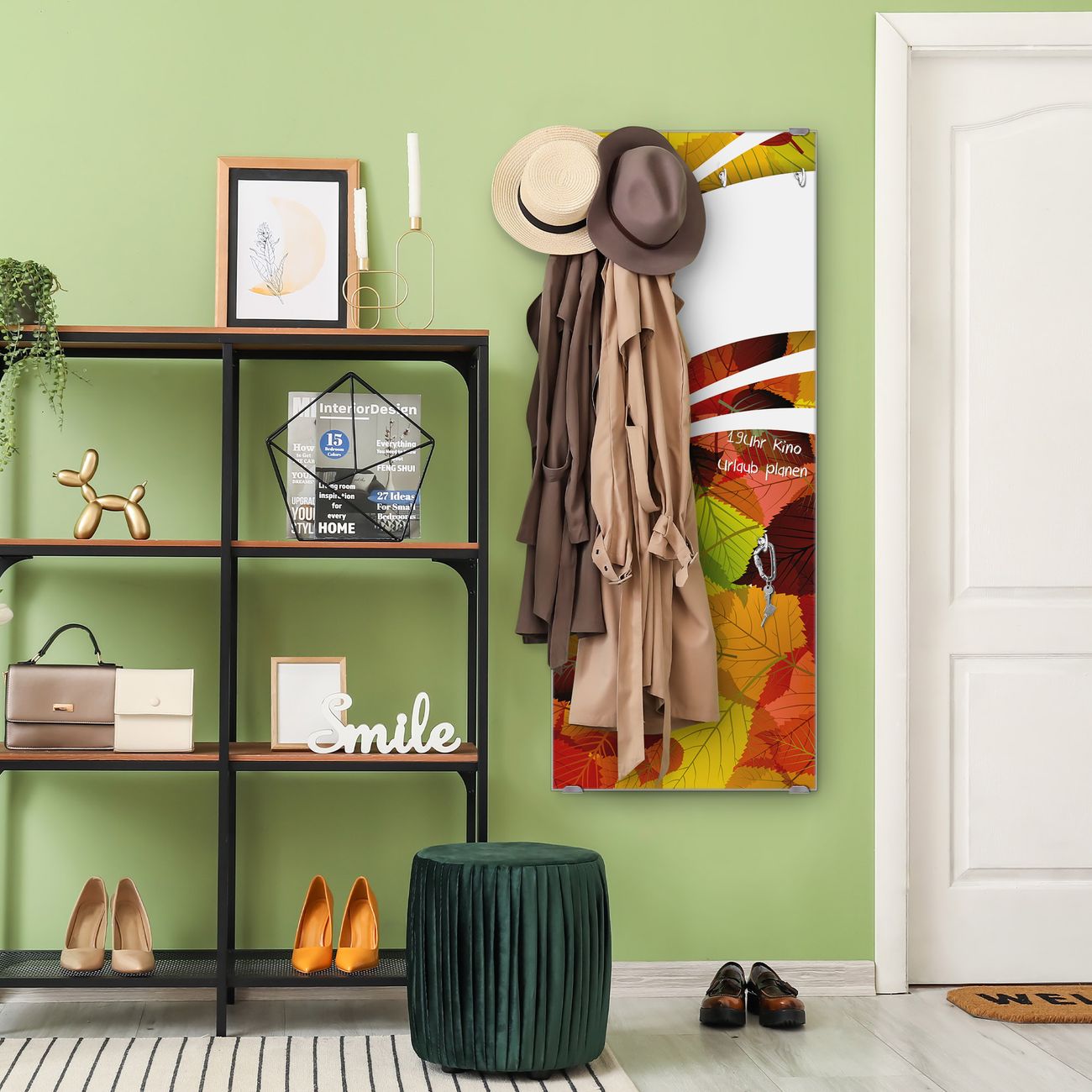 FUNKTION: Die banjado Wandgarderobe mit Motiv Herbstlaub ist Ihr täglicher Begleiter. Zuverlässig hängen hier Ihre Jacken und Mäntel griffbereit. Das Echtglas ist Ihr Paneel auch beschreibbar und wieder abwischbar. DESIGN: Sie erhalten eine Garderobenleiste aus elegantem Echtglas mit dem Farbbrillanten Motiv Herbstlaub hinterklebt. Das Design ist zeitlos klassisch, ohne dabei auf Funktionalität zu verzichten. Suchen Sie aus einer Vielzahl von Motiven das für Ihre Einrichtung Passende aus. DETAILS: Die Flurgarderobe besteht aus 4mm gehärtetem Sicherheitsglas. Sie ist 50cm breit, 125cm hoch und 6cm tief. Die Garderobenhaken zur Selbstmontage präsentieren sich in Edelstahl-Optik, ebenso die Abstandshalter für die Wandmontage. Ihre neue Garderobe ist sofort einsatzbereit. NUTZEN: Ihre neue Garderobe hält nicht nur zuverlässig Ihre Kleidung, sie ist auch optisch ein Blickfang. Durch das Glas können Sie an der Garderobe mit wasserlöslichen Kreidestiften oder Whiteboard-Markern auch Nachrichten hinterlassen. BANJADO: Wir sind ein kleines kreatives Team aus Sachsen und entwickeln Produkte die Design und Funktionalität verbinden sollen. Viel Freude mit Ihrer neuen Garderobe wünscht das banjado-Team!