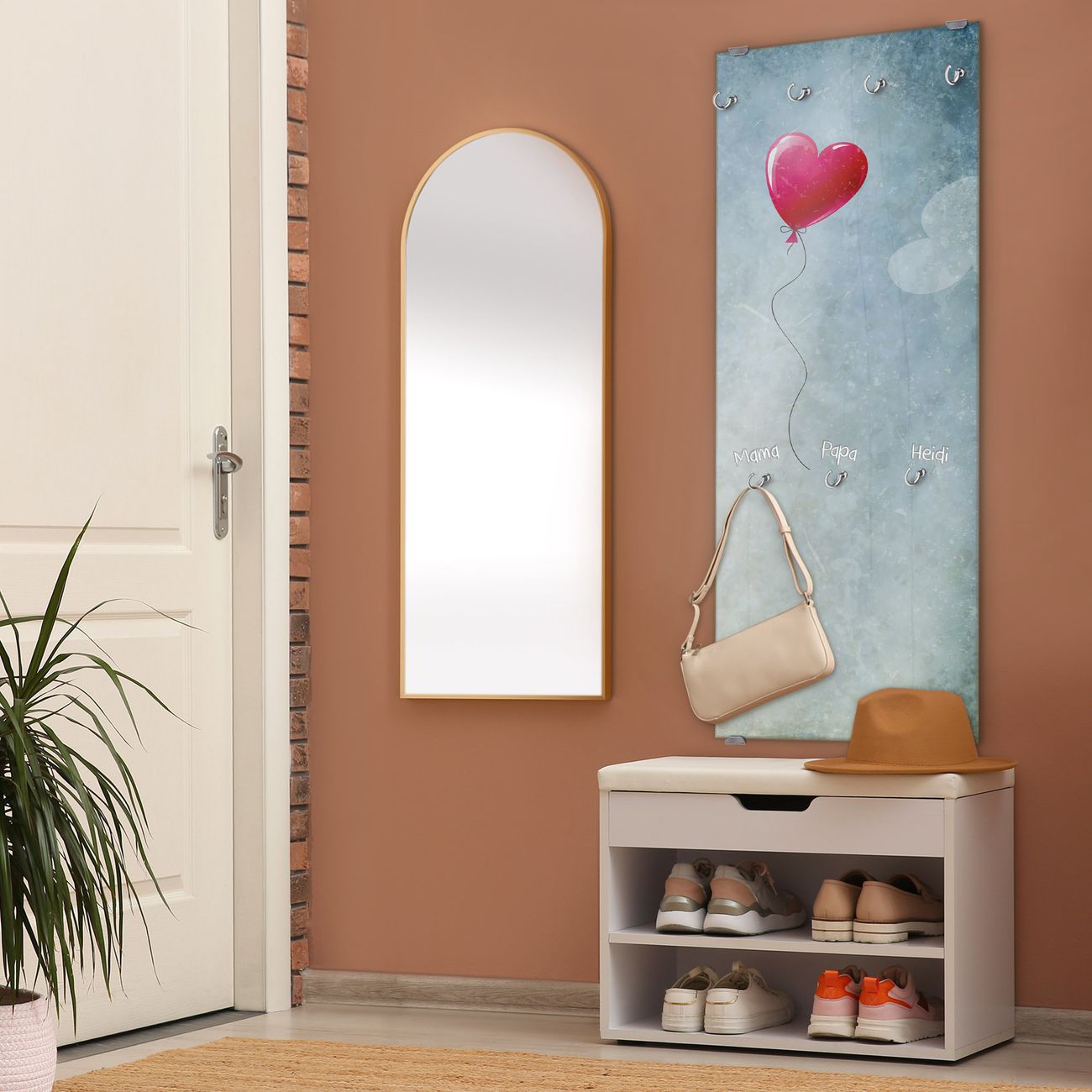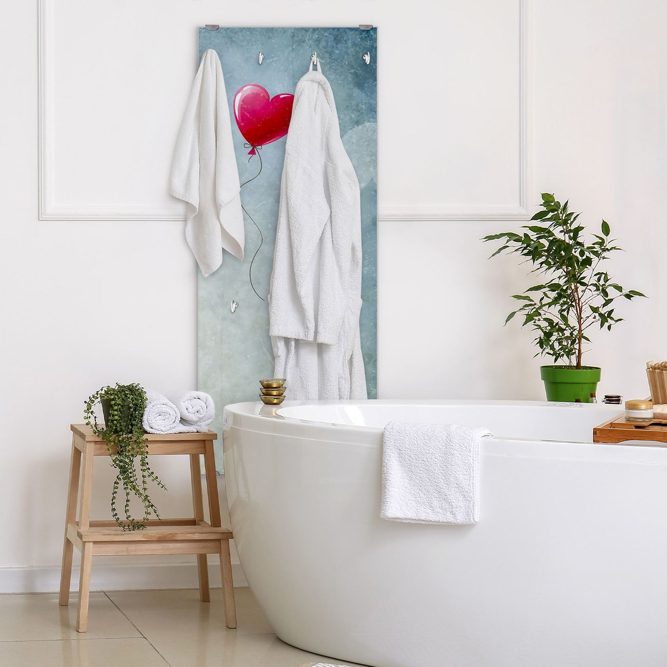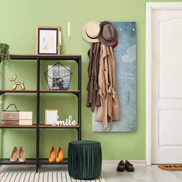 FUNKTION: Die banjado Wandgarderobe mit Motiv Herzballon ist Ihr täglicher Begleiter. Zuverlässig hängen hier Ihre Jacken und Mäntel griffbereit. Das Echtglas ist Ihr Paneel auch beschreibbar und wieder abwischbar. DESIGN: Sie erhalten eine Garderobenleiste aus elegantem Echtglas mit dem Farbbrillanten Motiv Herzballon hinterklebt. Das Design ist zeitlos klassisch, ohne dabei auf Funktionalität zu verzichten. Suchen Sie aus einer Vielzahl von Motiven das für Ihre Einrichtung Passende aus. DETAILS: Die Flurgarderobe besteht aus 4mm gehärtetem Sicherheitsglas. Sie ist 50cm breit, 125cm hoch und 6cm tief. Die Garderobenhaken zur Selbstmontage präsentieren sich in Edelstahl-Optik, ebenso die Abstandshalter für die Wandmontage. Ihre neue Garderobe ist sofort einsatzbereit. NUTZEN: Ihre neue Garderobe hält nicht nur zuverlässig Ihre Kleidung, sie ist auch optisch ein Blickfang. Durch das Glas können Sie an der Garderobe mit wasserlöslichen Kreidestiften oder Whiteboard-Markern auch Nachrichten hinterlassen. BANJADO: Wir sind ein kleines kreatives Team aus Sachsen und entwickeln Produkte die Design und Funktionalität verbinden sollen. Viel Freude mit Ihrer neuen Garderobe wünscht das banjado-Team!