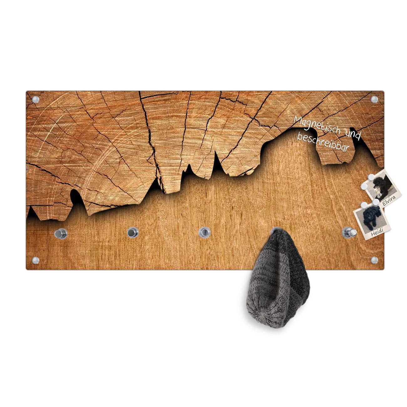 Bitte beachten Sie, dass an dieser Garderobe nur starke Neodym-Magnete halten! FUNKTION: Die banjado Wandgarderobe mit Motiv Holz ist Ihr täglicher Begleiter. Zuverlässig hängen hier Ihre Jacken und Mäntel griffbereit. Gleichzeitig ist die Design Garderobe magnetisch, Sie können Notizen anheften und durch das Echtglas ist Ihr Paneel auch beschreibbar und wieder abwischbar. DESIGN: Sie erhalten eine Garderobenleiste aus elegantem Echtglas mit dem Farbbrillanten Motiv Holz hinterklebt. Das Design ist zeitlos klassisch, ohne dabei auf Funktionalität zu verzichten. Suchen Sie aus einer Vielzahl von Motiven das für Ihre Einrichtung Passende aus. DETAILS: Die Flurgarderobe besteht aus 4mm gehärtetem Sicherheitsglas. Sie ist 80cm breit, 40cm hoch und 6cm tief. Die Garderobenhaken zur Selbstmontage präsentieren sich in Edelstahl-Optik, ebenso die Abstandshalter für die Wandmontage. Ihre neue Garderobe ist sofort einsatzbereit. NUTZEN: Ihre neue Garderobe hält nicht nur zuverlässig Ihre Kleidung, sie ist auch optisch ein Blickfang. Durch die magnetische Wirkung können Sie mit 4 beigefügten extrastarken Neodym-Magneten Notizen anheften und mit wasserlöslichen Kreidestiften oder Whiteboard-Markern auch Nachrichten hinterlassen. BANJADO: Wir sind ein kleines kreatives Team aus Sachsen und entwickeln Produkte die Design und Funktionalität verbinden sollen. Viel Freude mit Ihrer neuen Garderobe wünscht das banjado-Team!