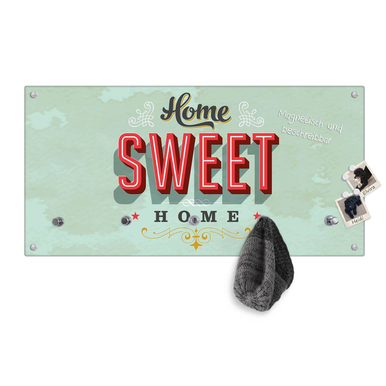 Bitte beachten Sie, dass an dieser Garderobe nur starke Neodym-Magnete halten! FUNKTION: Die banjado Wandgarderobe mit Motiv Home Sweet Home ist Ihr täglicher Begleiter. Zuverlässig hängen hier Ihre Jacken und Mäntel griffbereit. Gleichzeitig ist die Design Garderobe magnetisch, Sie können Notizen anheften und durch das Echtglas ist Ihr Paneel auch beschreibbar und wieder abwischbar. DESIGN: Sie erhalten eine Garderobenleiste aus elegantem Echtglas mit dem Farbbrillanten Motiv Home Sweet Home hinterklebt. Das Design ist zeitlos klassisch, ohne dabei auf Funktionalität zu verzichten. Suchen Sie aus einer Vielzahl von Motiven das für Ihre Einrichtung Passende aus. DETAILS: Die Flurgarderobe besteht aus 4mm gehärtetem Sicherheitsglas. Sie ist 80cm breit, 40cm hoch und 6cm tief. Die Garderobenhaken zur Selbstmontage präsentieren sich in Edelstahl-Optik, ebenso die Abstandshalter für die Wandmontage. Ihre neue Garderobe ist sofort einsatzbereit. NUTZEN: Ihre neue Garderobe hält nicht nur zuverlässig Ihre Kleidung, sie ist auch optisch ein Blickfang. Durch die magnetische Wirkung können Sie mit 4 beigefügten extrastarken Neodym-Magneten Notizen anheften und mit wasserlöslichen Kreidestiften oder Whiteboard-Markern auch Nachrichten hinterlassen. BANJADO: Wir sind ein kleines kreatives Team aus Sachsen und entwickeln Produkte die Design und Funktionalität verbinden sollen. Viel Freude mit Ihrer neuen Garderobe wünscht das banjado-Team!