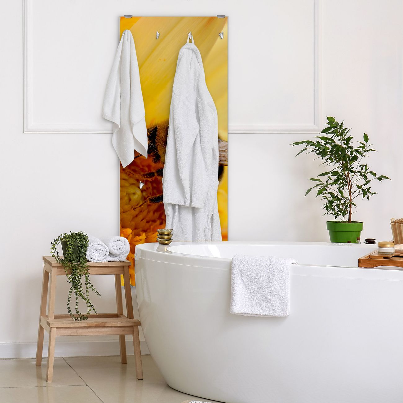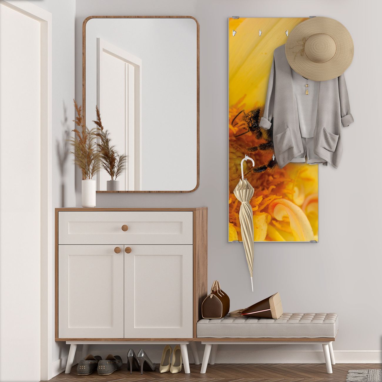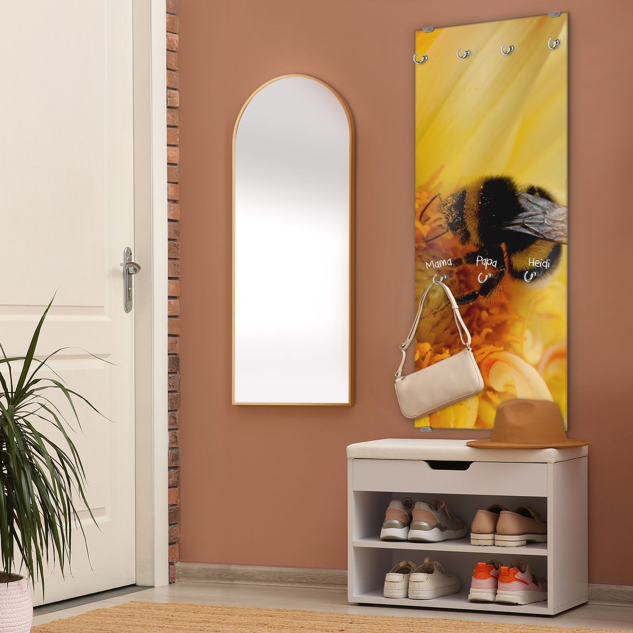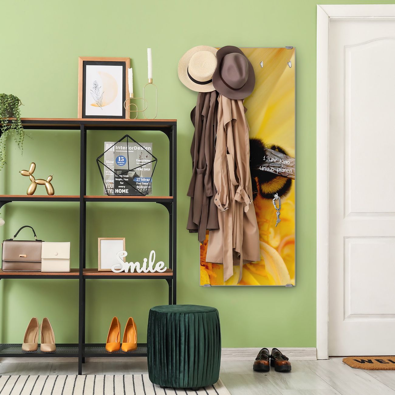 FUNKTION: Die banjado Wandgarderobe mit Motiv Hummel ist Ihr täglicher Begleiter. Zuverlässig hängen hier Ihre Jacken und Mäntel griffbereit. Das Echtglas ist Ihr Paneel auch beschreibbar und wieder abwischbar. DESIGN: Sie erhalten eine Garderobenleiste aus elegantem Echtglas mit dem Farbbrillanten Motiv Hummel hinterklebt. Das Design ist zeitlos klassisch, ohne dabei auf Funktionalität zu verzichten. Suchen Sie aus einer Vielzahl von Motiven das für Ihre Einrichtung Passende aus. DETAILS: Die Flurgarderobe besteht aus 4mm gehärtetem Sicherheitsglas. Sie ist 50cm breit, 125cm hoch und 6cm tief. Die Garderobenhaken zur Selbstmontage präsentieren sich in Edelstahl-Optik, ebenso die Abstandshalter für die Wandmontage. Ihre neue Garderobe ist sofort einsatzbereit. NUTZEN: Ihre neue Garderobe hält nicht nur zuverlässig Ihre Kleidung, sie ist auch optisch ein Blickfang. Durch das Glas können Sie an der Garderobe mit wasserlöslichen Kreidestiften oder Whiteboard-Markern auch Nachrichten hinterlassen. BANJADO: Wir sind ein kleines kreatives Team aus Sachsen und entwickeln Produkte die Design und Funktionalität verbinden sollen. Viel Freude mit Ihrer neuen Garderobe wünscht das banjado-Team!
