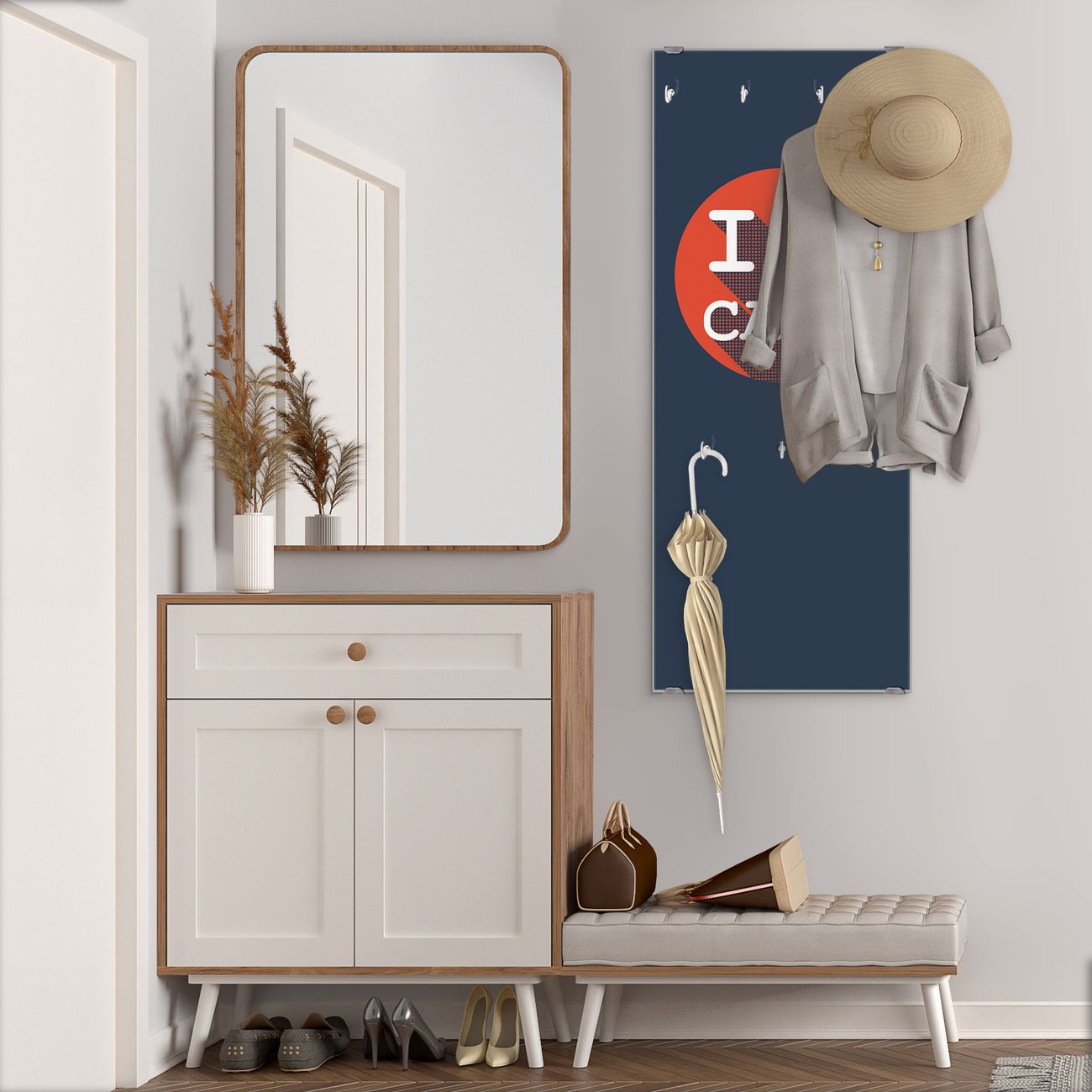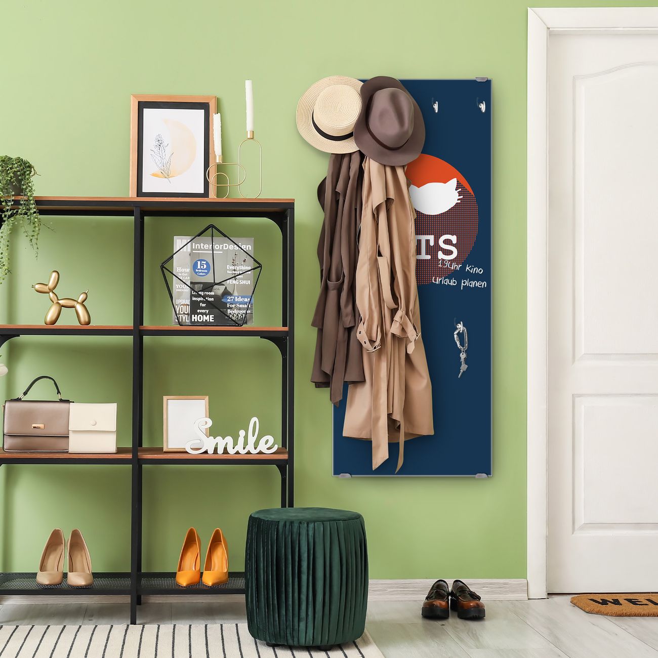 FUNKTION: Die banjado Wandgarderobe mit Motiv I Love Cats ist Ihr täglicher Begleiter. Zuverlässig hängen hier Ihre Jacken und Mäntel griffbereit. Das Echtglas ist Ihr Paneel auch beschreibbar und wieder abwischbar. DESIGN: Sie erhalten eine Garderobenleiste aus elegantem Echtglas mit dem Farbbrillanten Motiv I Love Cats hinterklebt. Das Design ist zeitlos klassisch, ohne dabei auf Funktionalität zu verzichten. Suchen Sie aus einer Vielzahl von Motiven das für Ihre Einrichtung Passende aus. DETAILS: Die Flurgarderobe besteht aus 4mm gehärtetem Sicherheitsglas. Sie ist 50cm breit, 125cm hoch und 6cm tief. Die Garderobenhaken zur Selbstmontage präsentieren sich in Edelstahl-Optik, ebenso die Abstandshalter für die Wandmontage. Ihre neue Garderobe ist sofort einsatzbereit. NUTZEN: Ihre neue Garderobe hält nicht nur zuverlässig Ihre Kleidung, sie ist auch optisch ein Blickfang. Durch das Glas können Sie an der Garderobe mit wasserlöslichen Kreidestiften oder Whiteboard-Markern auch Nachrichten hinterlassen. BANJADO: Wir sind ein kleines kreatives Team aus Sachsen und entwickeln Produkte die Design und Funktionalität verbinden sollen. Viel Freude mit Ihrer neuen Garderobe wünscht das banjado-Team!
