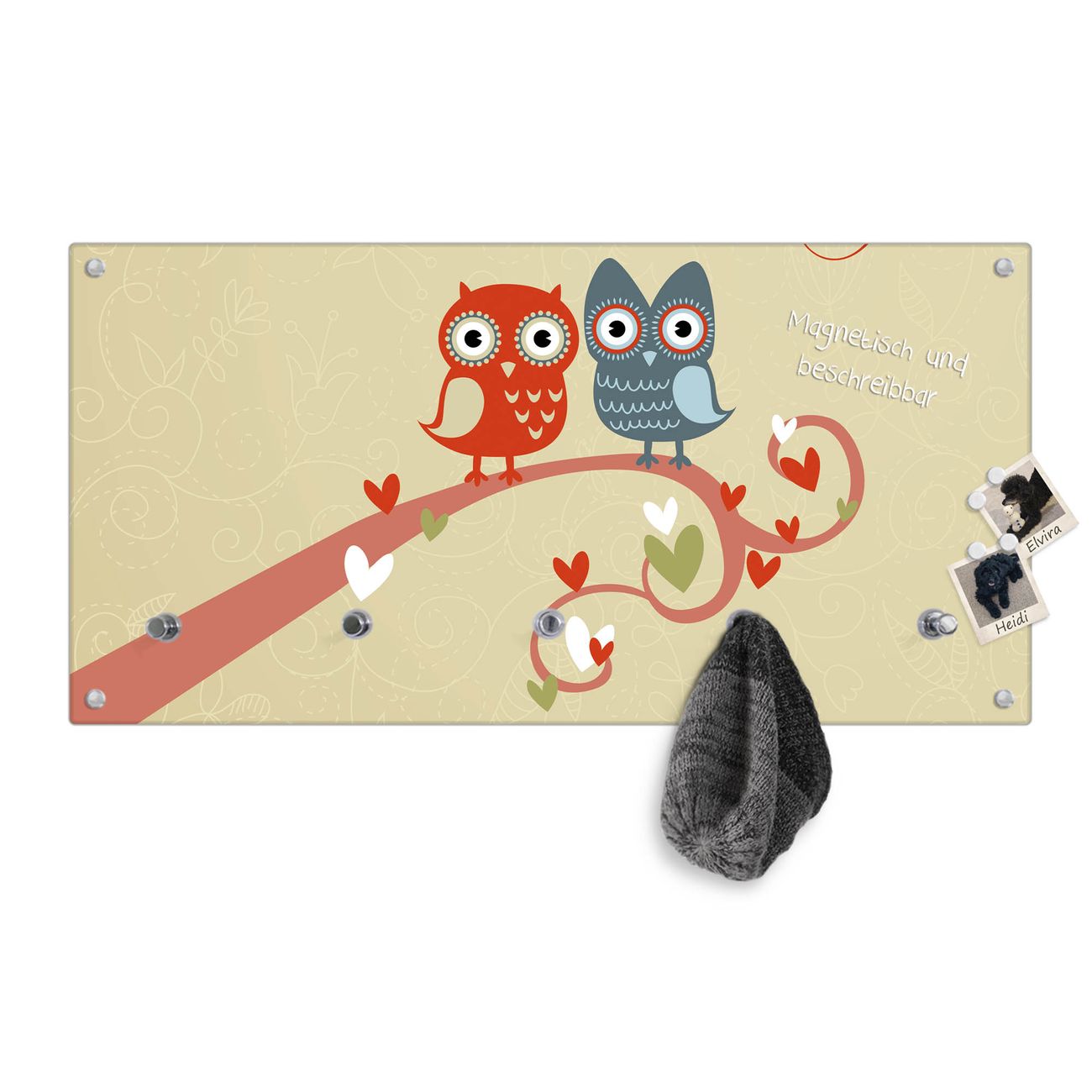 Bitte beachten Sie, dass an dieser Garderobe nur starke Neodym-Magnete halten! FUNKTION: Die banjado Wandgarderobe mit Motiv I Love You ist Ihr täglicher Begleiter. Zuverlässig hängen hier Ihre Jacken und Mäntel griffbereit. Gleichzeitig ist die Design Garderobe magnetisch, Sie können Notizen anheften und durch das Echtglas ist Ihr Paneel auch beschreibbar und wieder abwischbar. DESIGN: Sie erhalten eine Garderobenleiste aus elegantem Echtglas mit dem Farbbrillanten Motiv I Love You hinterklebt. Das Design ist zeitlos klassisch, ohne dabei auf Funktionalität zu verzichten. Suchen Sie aus einer Vielzahl von Motiven das für Ihre Einrichtung Passende aus. DETAILS: Die Flurgarderobe besteht aus 4mm gehärtetem Sicherheitsglas. Sie ist 80cm breit, 40cm hoch und 6cm tief. Die Garderobenhaken zur Selbstmontage präsentieren sich in Edelstahl-Optik, ebenso die Abstandshalter für die Wandmontage. Ihre neue Garderobe ist sofort einsatzbereit. NUTZEN: Ihre neue Garderobe hält nicht nur zuverlässig Ihre Kleidung, sie ist auch optisch ein Blickfang. Durch die magnetische Wirkung können Sie mit 4 beigefügten extrastarken Neodym-Magneten Notizen anheften und mit wasserlöslichen Kreidestiften oder Whiteboard-Markern auch Nachrichten hinterlassen. BANJADO: Wir sind ein kleines kreatives Team aus Sachsen und entwickeln Produkte die Design und Funktionalität verbinden sollen. Viel Freude mit Ihrer neuen Garderobe wünscht das banjado-Team!