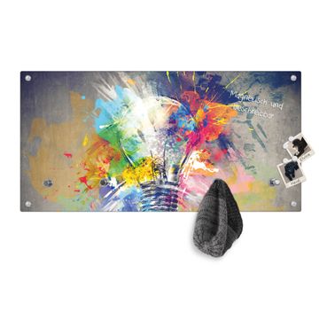 Bitte beachten Sie, dass an dieser Garderobe nur starke Neodym-Magnete halten! FUNKTION: Die banjado Wandgarderobe mit Motiv Idee ist Ihr täglicher Begleiter. Zuverlässig hängen hier Ihre Jacken und Mäntel griffbereit. Gleichzeitig ist die Design Garderobe magnetisch, Sie können Notizen anheften und durch das Echtglas ist Ihr Paneel auch beschreibbar und wieder abwischbar. DESIGN: Sie erhalten eine Garderobenleiste aus elegantem Echtglas mit dem Farbbrillanten Motiv Idee hinterklebt. Das Design ist zeitlos klassisch, ohne dabei auf Funktionalität zu verzichten. Suchen Sie aus einer Vielzahl von Motiven das für Ihre Einrichtung Passende aus. DETAILS: Die Flurgarderobe besteht aus 4mm gehärtetem Sicherheitsglas. Sie ist 80cm breit, 40cm hoch und 6cm tief. Die Garderobenhaken zur Selbstmontage präsentieren sich in Edelstahl-Optik, ebenso die Abstandshalter für die Wandmontage. Ihre neue Garderobe ist sofort einsatzbereit. NUTZEN: Ihre neue Garderobe hält nicht nur zuverlässig Ihre Kleidung, sie ist auch optisch ein Blickfang. Durch die magnetische Wirkung können Sie mit 4 beigefügten extrastarken Neodym-Magneten Notizen anheften und mit wasserlöslichen Kreidestiften oder Whiteboard-Markern auch Nachrichten hinterlassen. BANJADO: Wir sind ein kleines kreatives Team aus Sachsen und entwickeln Produkte die Design und Funktionalität verbinden sollen. Viel Freude mit Ihrer neuen Garderobe wünscht das banjado-Team!