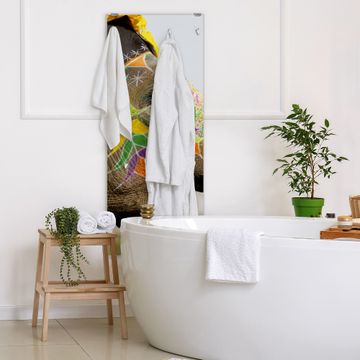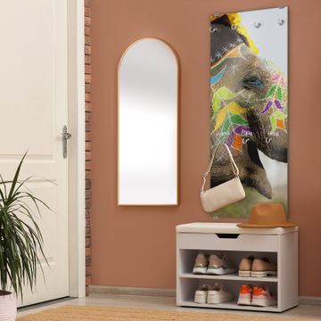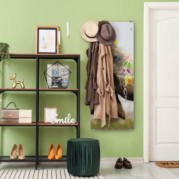 FUNKTION: Die banjado Wandgarderobe mit Motiv Indischer Elephant ist Ihr täglicher Begleiter. Zuverlässig hängen hier Ihre Jacken und Mäntel griffbereit. Das Echtglas ist Ihr Paneel auch beschreibbar und wieder abwischbar. DESIGN: Sie erhalten eine Garderobenleiste aus elegantem Echtglas mit dem Farbbrillanten Motiv Indischer Elephant hinterklebt. Das Design ist zeitlos klassisch, ohne dabei auf Funktionalität zu verzichten. Suchen Sie aus einer Vielzahl von Motiven das für Ihre Einrichtung Passende aus. DETAILS: Die Flurgarderobe besteht aus 4mm gehärtetem Sicherheitsglas. Sie ist 50cm breit, 125cm hoch und 6cm tief. Die Garderobenhaken zur Selbstmontage präsentieren sich in Edelstahl-Optik, ebenso die Abstandshalter für die Wandmontage. Ihre neue Garderobe ist sofort einsatzbereit. NUTZEN: Ihre neue Garderobe hält nicht nur zuverlässig Ihre Kleidung, sie ist auch optisch ein Blickfang. Durch das Glas können Sie an der Garderobe mit wasserlöslichen Kreidestiften oder Whiteboard-Markern auch Nachrichten hinterlassen. BANJADO: Wir sind ein kleines kreatives Team aus Sachsen und entwickeln Produkte die Design und Funktionalität verbinden sollen. Viel Freude mit Ihrer neuen Garderobe wünscht das banjado-Team!