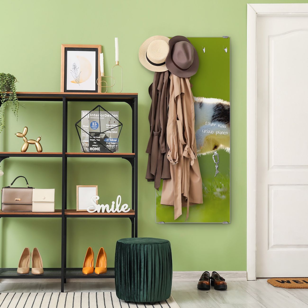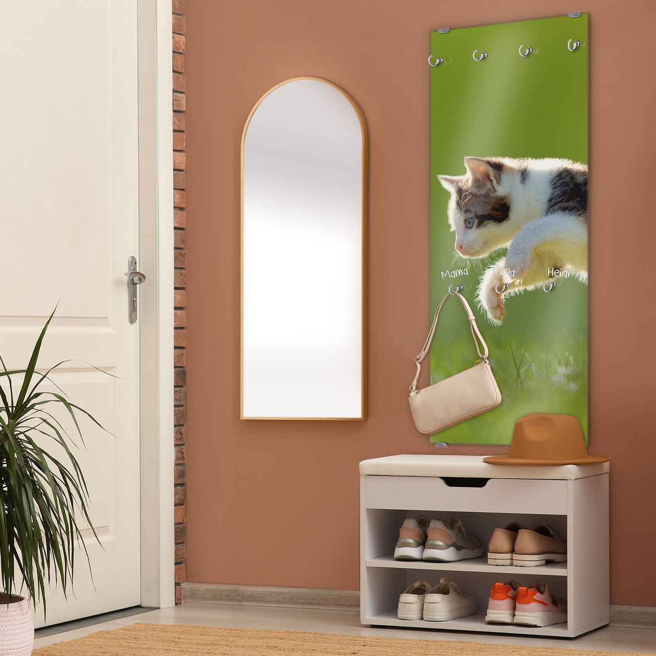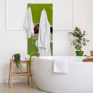 FUNKTION: Die banjado Wandgarderobe mit Motiv Jagende Katze ist Ihr täglicher Begleiter. Zuverlässig hängen hier Ihre Jacken und Mäntel griffbereit. Das Echtglas ist Ihr Paneel auch beschreibbar und wieder abwischbar. DESIGN: Sie erhalten eine Garderobenleiste aus elegantem Echtglas mit dem Farbbrillanten Motiv Jagende Katze hinterklebt. Das Design ist zeitlos klassisch, ohne dabei auf Funktionalität zu verzichten. Suchen Sie aus einer Vielzahl von Motiven das für Ihre Einrichtung Passende aus. DETAILS: Die Flurgarderobe besteht aus 4mm gehärtetem Sicherheitsglas. Sie ist 50cm breit, 125cm hoch und 6cm tief. Die Garderobenhaken zur Selbstmontage präsentieren sich in Edelstahl-Optik, ebenso die Abstandshalter für die Wandmontage. Ihre neue Garderobe ist sofort einsatzbereit. NUTZEN: Ihre neue Garderobe hält nicht nur zuverlässig Ihre Kleidung, sie ist auch optisch ein Blickfang. Durch das Glas können Sie an der Garderobe mit wasserlöslichen Kreidestiften oder Whiteboard-Markern auch Nachrichten hinterlassen. BANJADO: Wir sind ein kleines kreatives Team aus Sachsen und entwickeln Produkte die Design und Funktionalität verbinden sollen. Viel Freude mit Ihrer neuen Garderobe wünscht das banjado-Team!