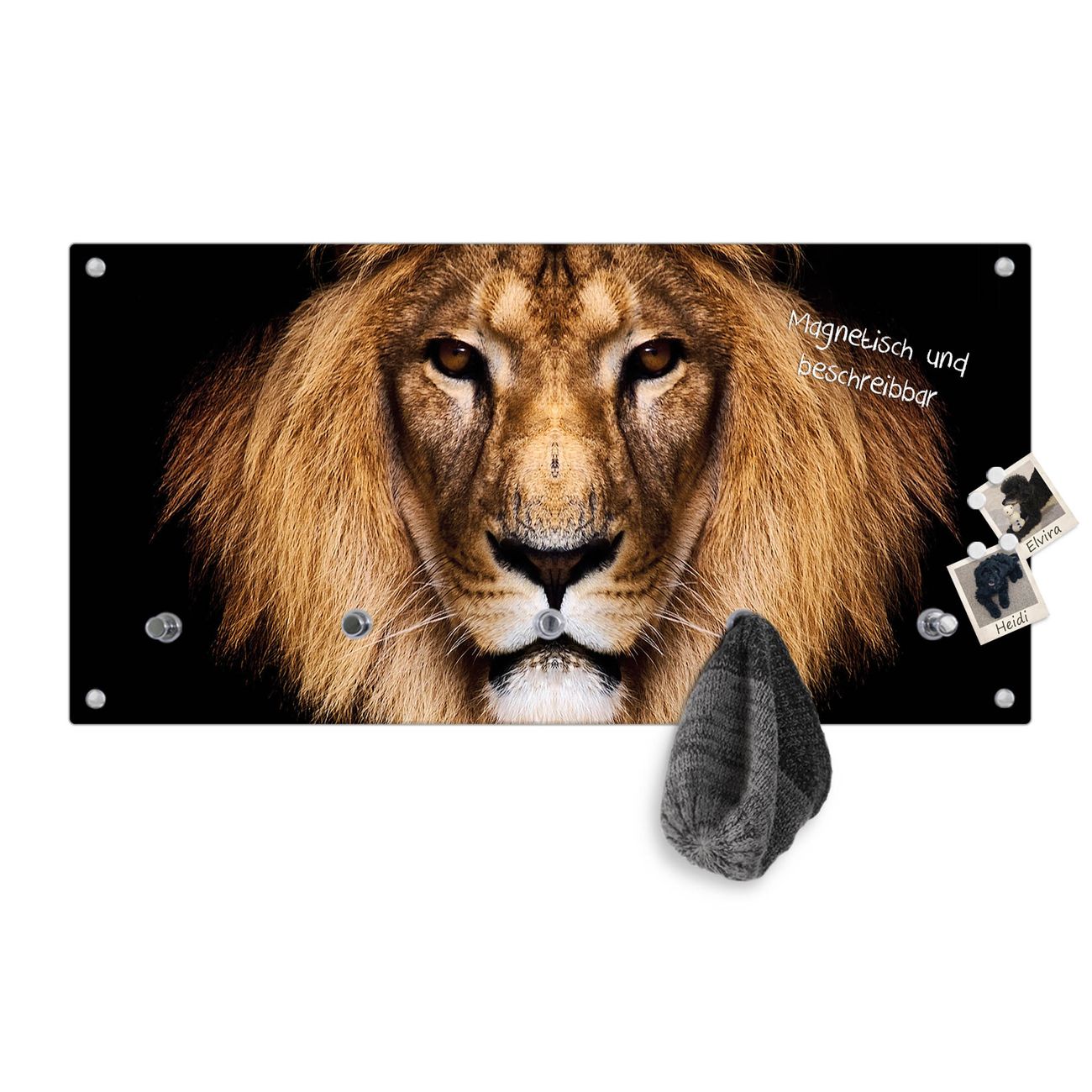Bitte beachten Sie, dass an dieser Garderobe nur starke Neodym-Magnete halten! FUNKTION: Die banjado Wandgarderobe mit Motiv Jakob ist Ihr täglicher Begleiter. Zuverlässig hängen hier Ihre Jacken und Mäntel griffbereit. Gleichzeitig ist die Design Garderobe magnetisch, Sie können Notizen anheften und durch das Echtglas ist Ihr Paneel auch beschreibbar und wieder abwischbar. DESIGN: Sie erhalten eine Garderobenleiste aus elegantem Echtglas mit dem Farbbrillanten Motiv Jakob hinterklebt. Das Design ist zeitlos klassisch, ohne dabei auf Funktionalität zu verzichten. Suchen Sie aus einer Vielzahl von Motiven das für Ihre Einrichtung Passende aus. DETAILS: Die Flurgarderobe besteht aus 4mm gehärtetem Sicherheitsglas. Sie ist 80cm breit, 40cm hoch und 6cm tief. Die Garderobenhaken zur Selbstmontage präsentieren sich in Edelstahl-Optik, ebenso die Abstandshalter für die Wandmontage. Ihre neue Garderobe ist sofort einsatzbereit. NUTZEN: Ihre neue Garderobe hält nicht nur zuverlässig Ihre Kleidung, sie ist auch optisch ein Blickfang. Durch die magnetische Wirkung können Sie mit 4 beigefügten extrastarken Neodym-Magneten Notizen anheften und mit wasserlöslichen Kreidestiften oder Whiteboard-Markern auch Nachrichten hinterlassen. BANJADO: Wir sind ein kleines kreatives Team aus Sachsen und entwickeln Produkte die Design und Funktionalität verbinden sollen. Viel Freude mit Ihrer neuen Garderobe wünscht das banjado-Team!