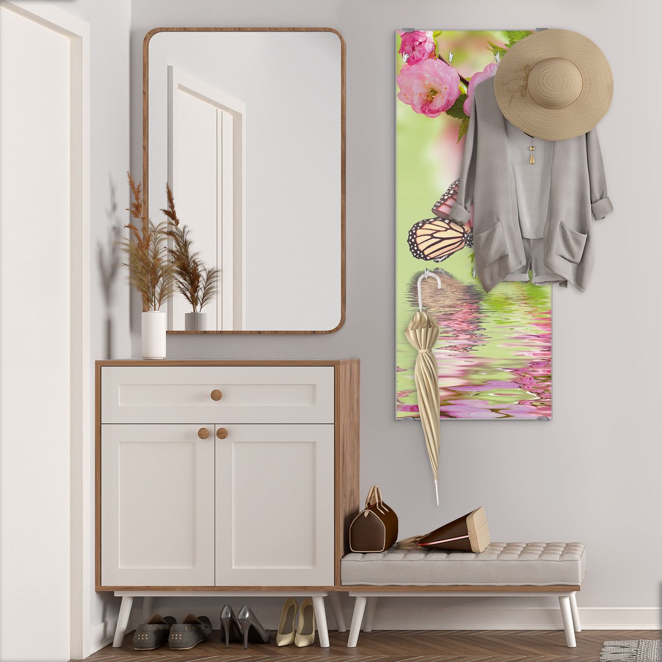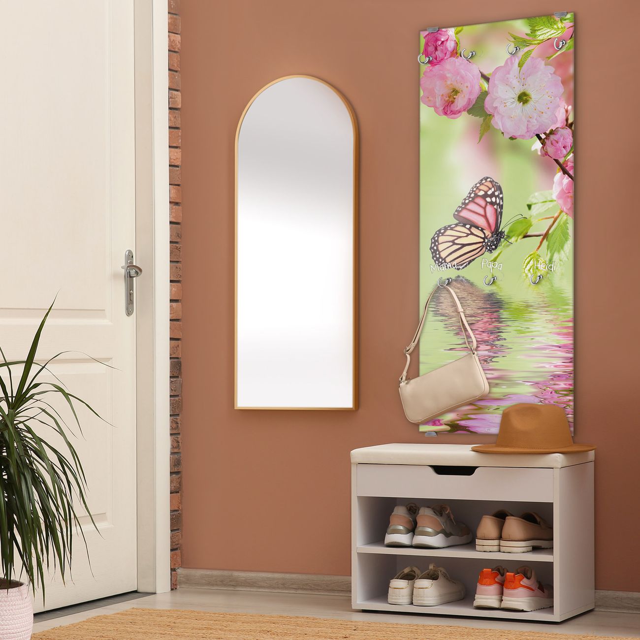 FUNKTION: Die banjado Wandgarderobe mit Motiv Japanische Kirschblüte ist Ihr täglicher Begleiter. Zuverlässig hängen hier Ihre Jacken und Mäntel griffbereit. Das Echtglas ist Ihr Paneel auch beschreibbar und wieder abwischbar. DESIGN: Sie erhalten eine Garderobenleiste aus elegantem Echtglas mit dem Farbbrillanten Motiv Japanische Kirschblüte hinterklebt. Das Design ist zeitlos klassisch, ohne dabei auf Funktionalität zu verzichten. Suchen Sie aus einer Vielzahl von Motiven das für Ihre Einrichtung Passende aus. DETAILS: Die Flurgarderobe besteht aus 4mm gehärtetem Sicherheitsglas. Sie ist 50cm breit, 125cm hoch und 6cm tief. Die Garderobenhaken zur Selbstmontage präsentieren sich in Edelstahl-Optik, ebenso die Abstandshalter für die Wandmontage. Ihre neue Garderobe ist sofort einsatzbereit. NUTZEN: Ihre neue Garderobe hält nicht nur zuverlässig Ihre Kleidung, sie ist auch optisch ein Blickfang. Durch das Glas können Sie an der Garderobe mit wasserlöslichen Kreidestiften oder Whiteboard-Markern auch Nachrichten hinterlassen. BANJADO: Wir sind ein kleines kreatives Team aus Sachsen und entwickeln Produkte die Design und Funktionalität verbinden sollen. Viel Freude mit Ihrer neuen Garderobe wünscht das banjado-Team!