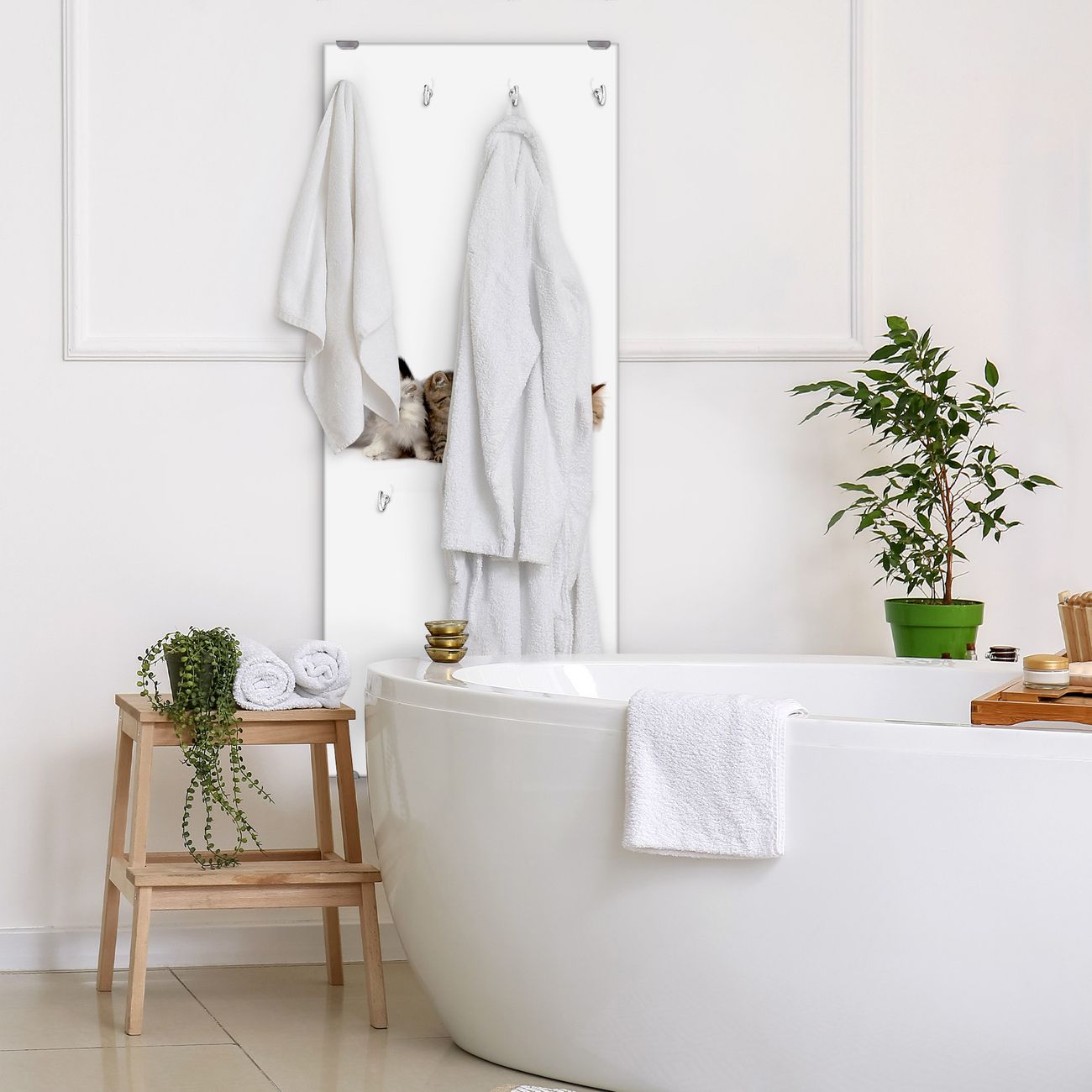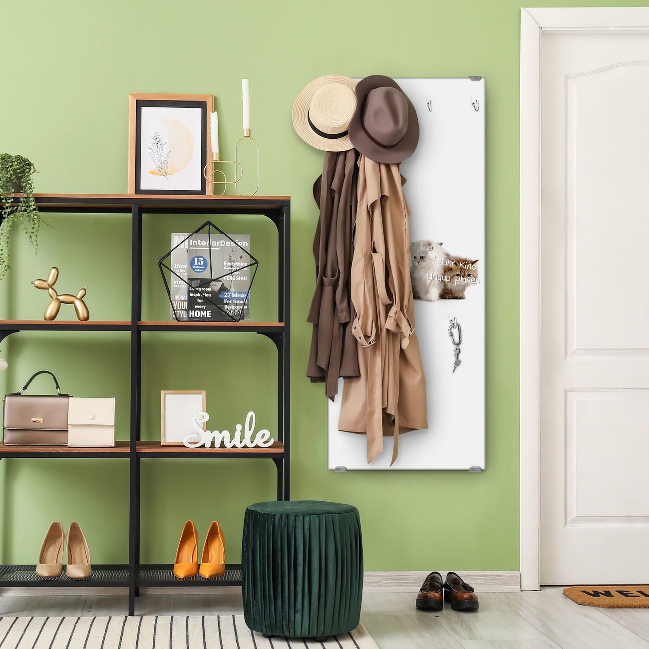 FUNKTION: Die banjado Wandgarderobe mit Motiv Kaetzchen ist Ihr täglicher Begleiter. Zuverlässig hängen hier Ihre Jacken und Mäntel griffbereit. Das Echtglas ist Ihr Paneel auch beschreibbar und wieder abwischbar. DESIGN: Sie erhalten eine Garderobenleiste aus elegantem Echtglas mit dem Farbbrillanten Motiv Kaetzchen hinterklebt. Das Design ist zeitlos klassisch, ohne dabei auf Funktionalität zu verzichten. Suchen Sie aus einer Vielzahl von Motiven das für Ihre Einrichtung Passende aus. DETAILS: Die Flurgarderobe besteht aus 4mm gehärtetem Sicherheitsglas. Sie ist 50cm breit, 125cm hoch und 6cm tief. Die Garderobenhaken zur Selbstmontage präsentieren sich in Edelstahl-Optik, ebenso die Abstandshalter für die Wandmontage. Ihre neue Garderobe ist sofort einsatzbereit. NUTZEN: Ihre neue Garderobe hält nicht nur zuverlässig Ihre Kleidung, sie ist auch optisch ein Blickfang. Durch das Glas können Sie an der Garderobe mit wasserlöslichen Kreidestiften oder Whiteboard-Markern auch Nachrichten hinterlassen. BANJADO: Wir sind ein kleines kreatives Team aus Sachsen und entwickeln Produkte die Design und Funktionalität verbinden sollen. Viel Freude mit Ihrer neuen Garderobe wünscht das banjado-Team!
