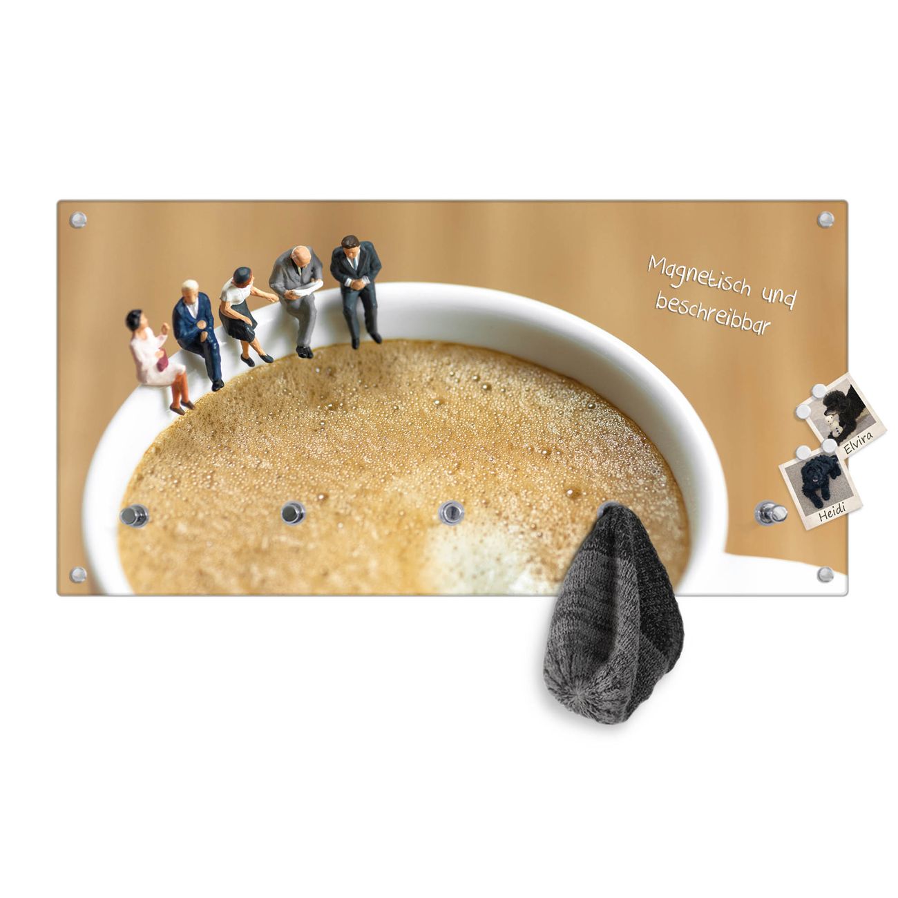 Bitte beachten Sie, dass an dieser Garderobe nur starke Neodym-Magnete halten! FUNKTION: Die banjado Wandgarderobe mit Motiv Kaffeepause ist Ihr täglicher Begleiter. Zuverlässig hängen hier Ihre Jacken und Mäntel griffbereit. Gleichzeitig ist die Design Garderobe magnetisch, Sie können Notizen anheften und durch das Echtglas ist Ihr Paneel auch beschreibbar und wieder abwischbar. DESIGN: Sie erhalten eine Garderobenleiste aus elegantem Echtglas mit dem Farbbrillanten Motiv Kaffeepause hinterklebt. Das Design ist zeitlos klassisch, ohne dabei auf Funktionalität zu verzichten. Suchen Sie aus einer Vielzahl von Motiven das für Ihre Einrichtung Passende aus. DETAILS: Die Flurgarderobe besteht aus 4mm gehärtetem Sicherheitsglas. Sie ist 80cm breit, 40cm hoch und 6cm tief. Die Garderobenhaken zur Selbstmontage präsentieren sich in Edelstahl-Optik, ebenso die Abstandshalter für die Wandmontage. Ihre neue Garderobe ist sofort einsatzbereit. NUTZEN: Ihre neue Garderobe hält nicht nur zuverlässig Ihre Kleidung, sie ist auch optisch ein Blickfang. Durch die magnetische Wirkung können Sie mit 4 beigefügten extrastarken Neodym-Magneten Notizen anheften und mit wasserlöslichen Kreidestiften oder Whiteboard-Markern auch Nachrichten hinterlassen. BANJADO: Wir sind ein kleines kreatives Team aus Sachsen und entwickeln Produkte die Design und Funktionalität verbinden sollen. Viel Freude mit Ihrer neuen Garderobe wünscht das banjado-Team!