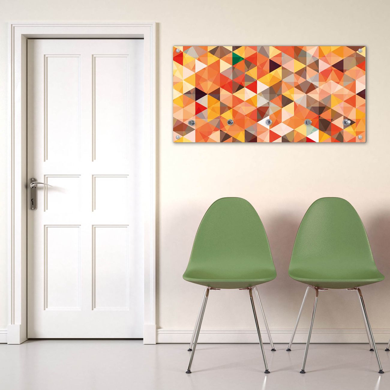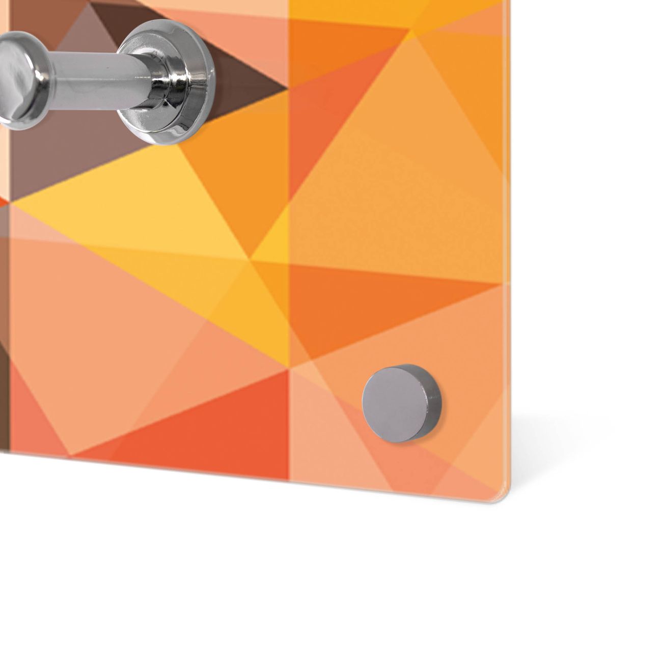 Bitte beachten Sie, dass an dieser Garderobe nur starke Neodym-Magnete halten! FUNKTION: Die banjado Wandgarderobe mit Motiv Kaleidoskop ist Ihr täglicher Begleiter. Zuverlässig hängen hier Ihre Jacken und Mäntel griffbereit. Gleichzeitig ist die Design Garderobe magnetisch, Sie können Notizen anheften und durch das Echtglas ist Ihr Paneel auch beschreibbar und wieder abwischbar. DESIGN: Sie erhalten eine Garderobenleiste aus elegantem Echtglas mit dem Farbbrillanten Motiv Kaleidoskop hinterklebt. Das Design ist zeitlos klassisch, ohne dabei auf Funktionalität zu verzichten. Suchen Sie aus einer Vielzahl von Motiven das für Ihre Einrichtung Passende aus. DETAILS: Die Flurgarderobe besteht aus 4mm gehärtetem Sicherheitsglas. Sie ist 80cm breit, 40cm hoch und 6cm tief. Die Garderobenhaken zur Selbstmontage präsentieren sich in Edelstahl-Optik, ebenso die Abstandshalter für die Wandmontage. Ihre neue Garderobe ist sofort einsatzbereit. NUTZEN: Ihre neue Garderobe hält nicht nur zuverlässig Ihre Kleidung, sie ist auch optisch ein Blickfang. Durch die magnetische Wirkung können Sie mit 4 beigefügten extrastarken Neodym-Magneten Notizen anheften und mit wasserlöslichen Kreidestiften oder Whiteboard-Markern auch Nachrichten hinterlassen. BANJADO: Wir sind ein kleines kreatives Team aus Sachsen und entwickeln Produkte die Design und Funktionalität verbinden sollen. Viel Freude mit Ihrer neuen Garderobe wünscht das banjado-Team!