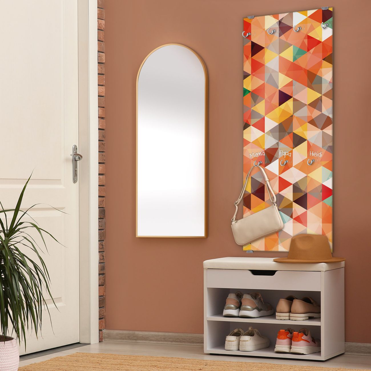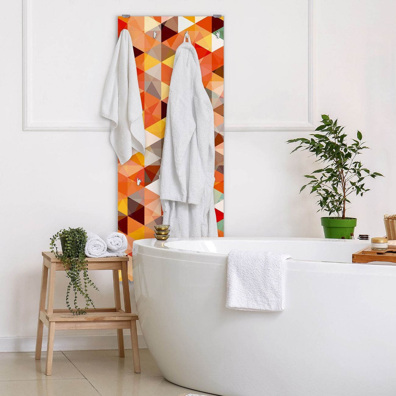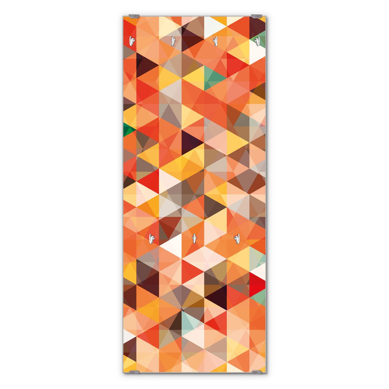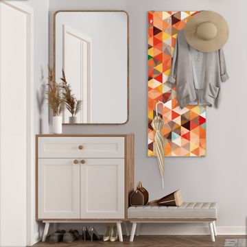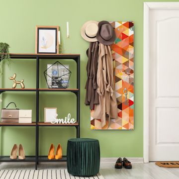 FUNKTION: Die banjado Wandgarderobe mit Motiv Kaleidoskop ist Ihr täglicher Begleiter. Zuverlässig hängen hier Ihre Jacken und Mäntel griffbereit. Das Echtglas ist Ihr Paneel auch beschreibbar und wieder abwischbar. DESIGN: Sie erhalten eine Garderobenleiste aus elegantem Echtglas mit dem Farbbrillanten Motiv Kaleidoskop hinterklebt. Das Design ist zeitlos klassisch, ohne dabei auf Funktionalität zu verzichten. Suchen Sie aus einer Vielzahl von Motiven das für Ihre Einrichtung Passende aus. DETAILS: Die Flurgarderobe besteht aus 4mm gehärtetem Sicherheitsglas. Sie ist 50cm breit, 125cm hoch und 6cm tief. Die Garderobenhaken zur Selbstmontage präsentieren sich in Edelstahl-Optik, ebenso die Abstandshalter für die Wandmontage. Ihre neue Garderobe ist sofort einsatzbereit. NUTZEN: Ihre neue Garderobe hält nicht nur zuverlässig Ihre Kleidung, sie ist auch optisch ein Blickfang. Durch das Glas können Sie an der Garderobe mit wasserlöslichen Kreidestiften oder Whiteboard-Markern auch Nachrichten hinterlassen. BANJADO: Wir sind ein kleines kreatives Team aus Sachsen und entwickeln Produkte die Design und Funktionalität verbinden sollen. Viel Freude mit Ihrer neuen Garderobe wünscht das banjado-Team!