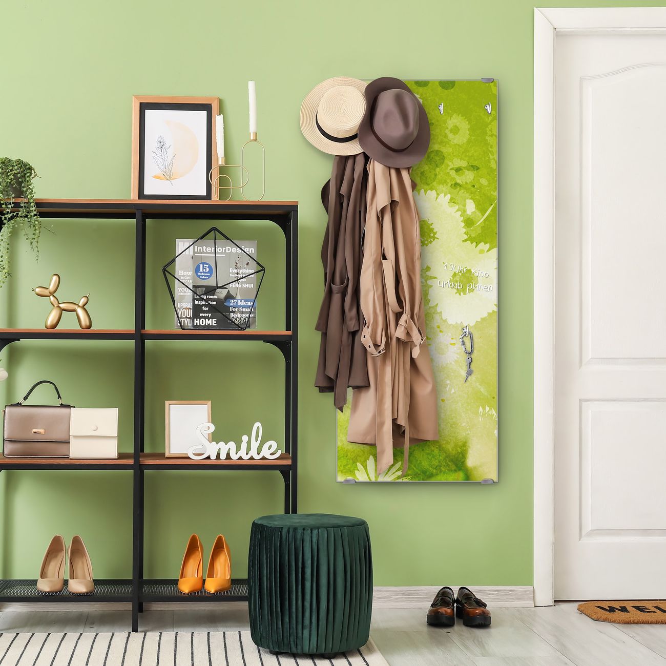 FUNKTION: Die banjado Wandgarderobe mit Motiv Kamille Grün ist Ihr täglicher Begleiter. Zuverlässig hängen hier Ihre Jacken und Mäntel griffbereit. Das Echtglas ist Ihr Paneel auch beschreibbar und wieder abwischbar. DESIGN: Sie erhalten eine Garderobenleiste aus elegantem Echtglas mit dem Farbbrillanten Motiv Kamille Grün hinterklebt. Das Design ist zeitlos klassisch, ohne dabei auf Funktionalität zu verzichten. Suchen Sie aus einer Vielzahl von Motiven das für Ihre Einrichtung Passende aus. DETAILS: Die Flurgarderobe besteht aus 4mm gehärtetem Sicherheitsglas. Sie ist 50cm breit, 125cm hoch und 6cm tief. Die Garderobenhaken zur Selbstmontage präsentieren sich in Edelstahl-Optik, ebenso die Abstandshalter für die Wandmontage. Ihre neue Garderobe ist sofort einsatzbereit. NUTZEN: Ihre neue Garderobe hält nicht nur zuverlässig Ihre Kleidung, sie ist auch optisch ein Blickfang. Durch das Glas können Sie an der Garderobe mit wasserlöslichen Kreidestiften oder Whiteboard-Markern auch Nachrichten hinterlassen. BANJADO: Wir sind ein kleines kreatives Team aus Sachsen und entwickeln Produkte die Design und Funktionalität verbinden sollen. Viel Freude mit Ihrer neuen Garderobe wünscht das banjado-Team!