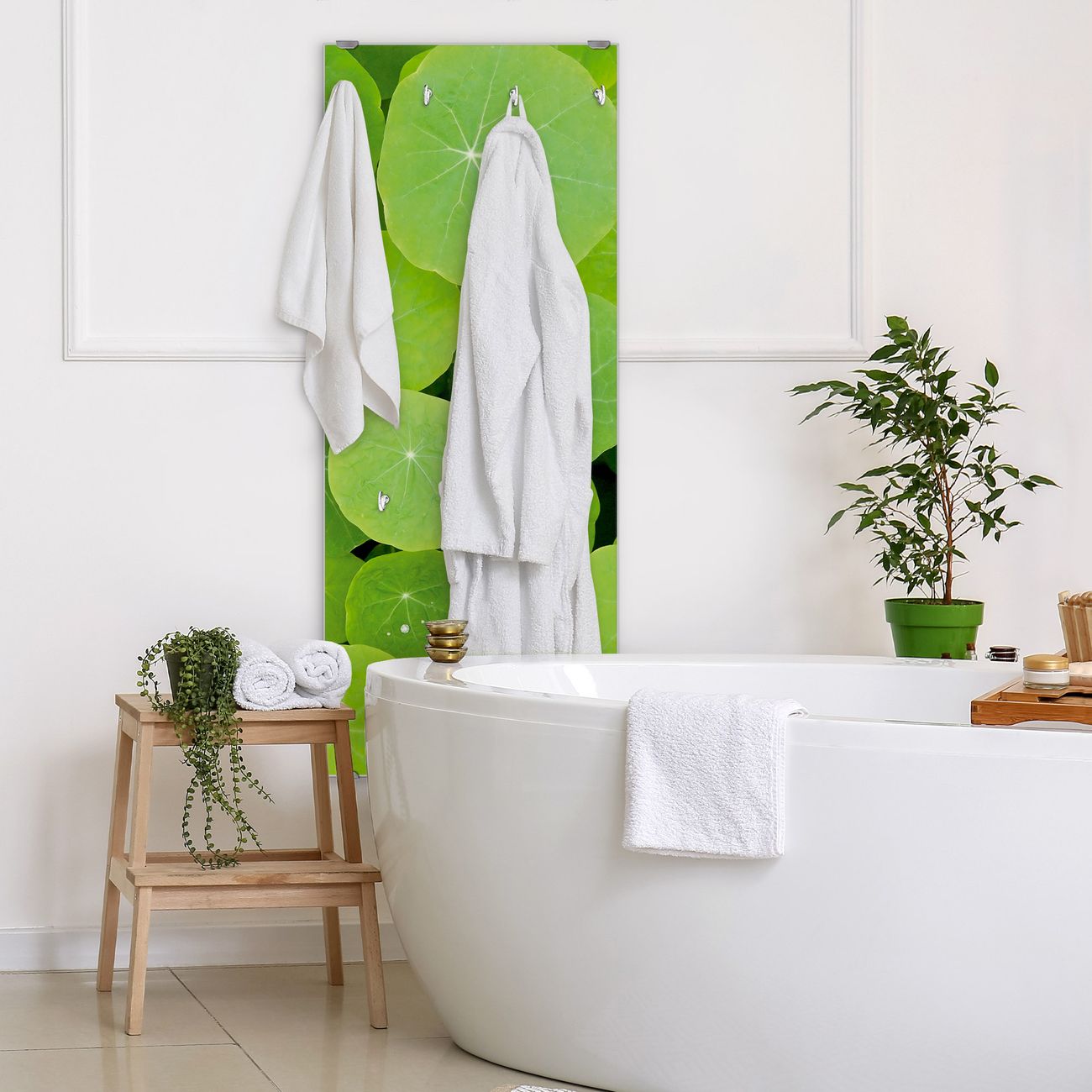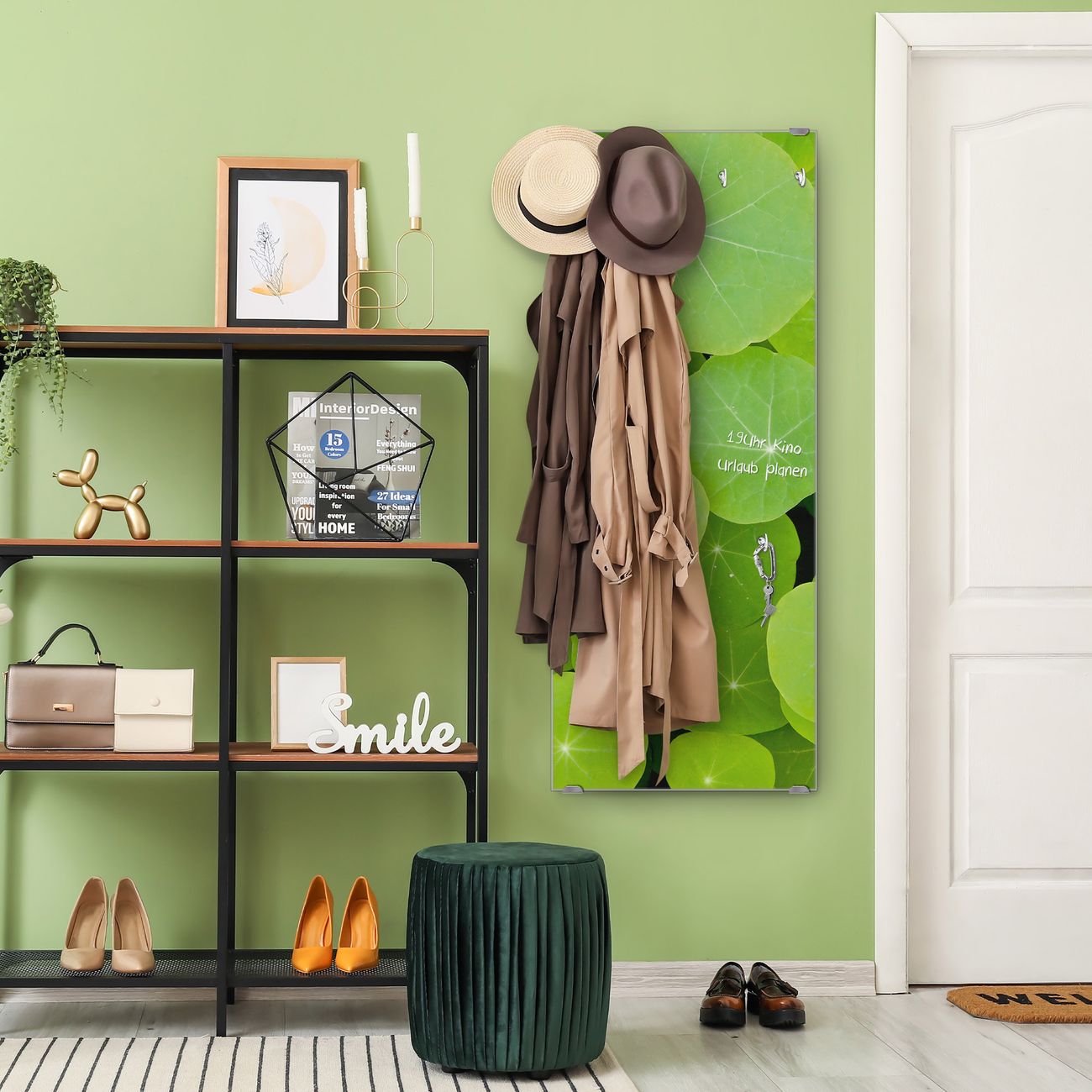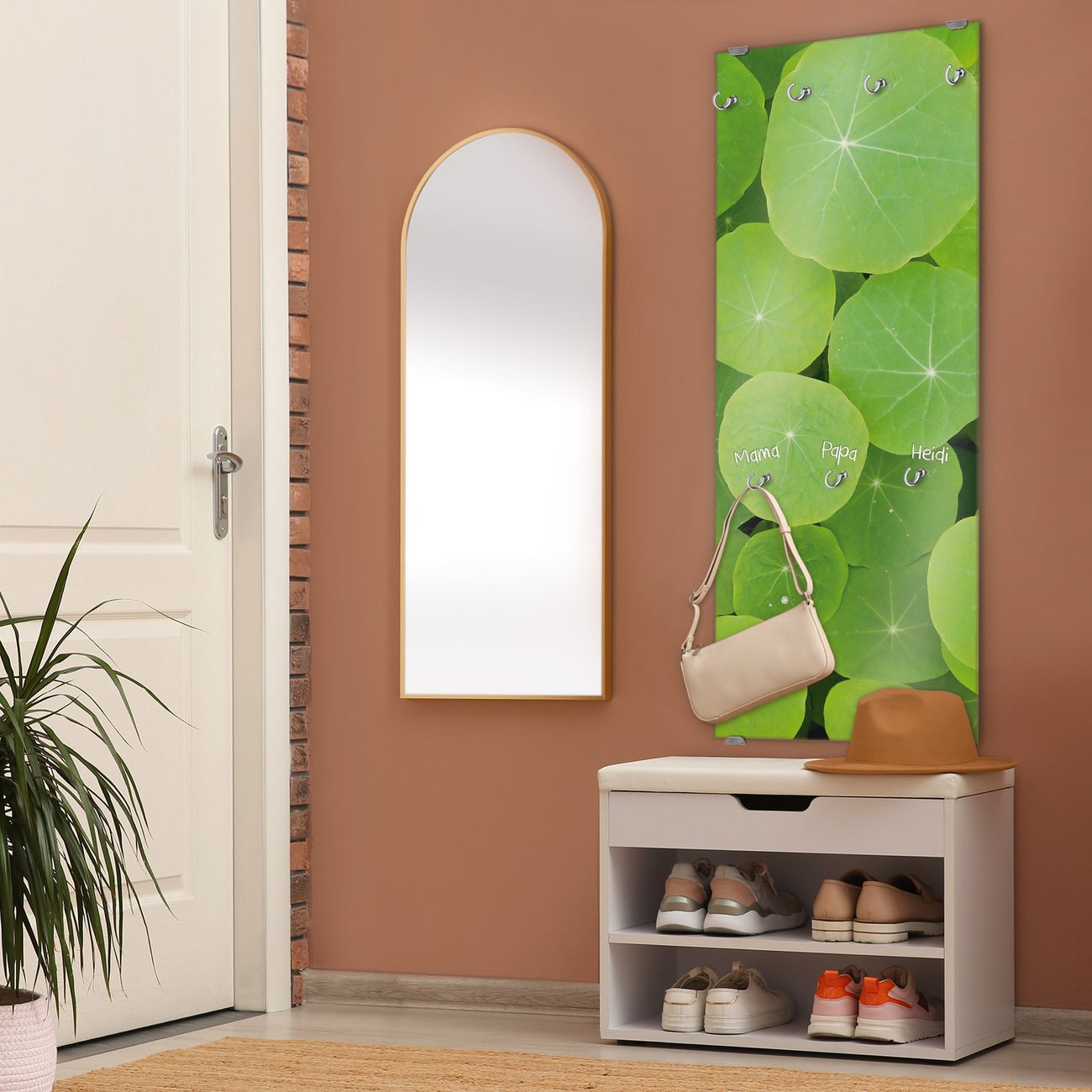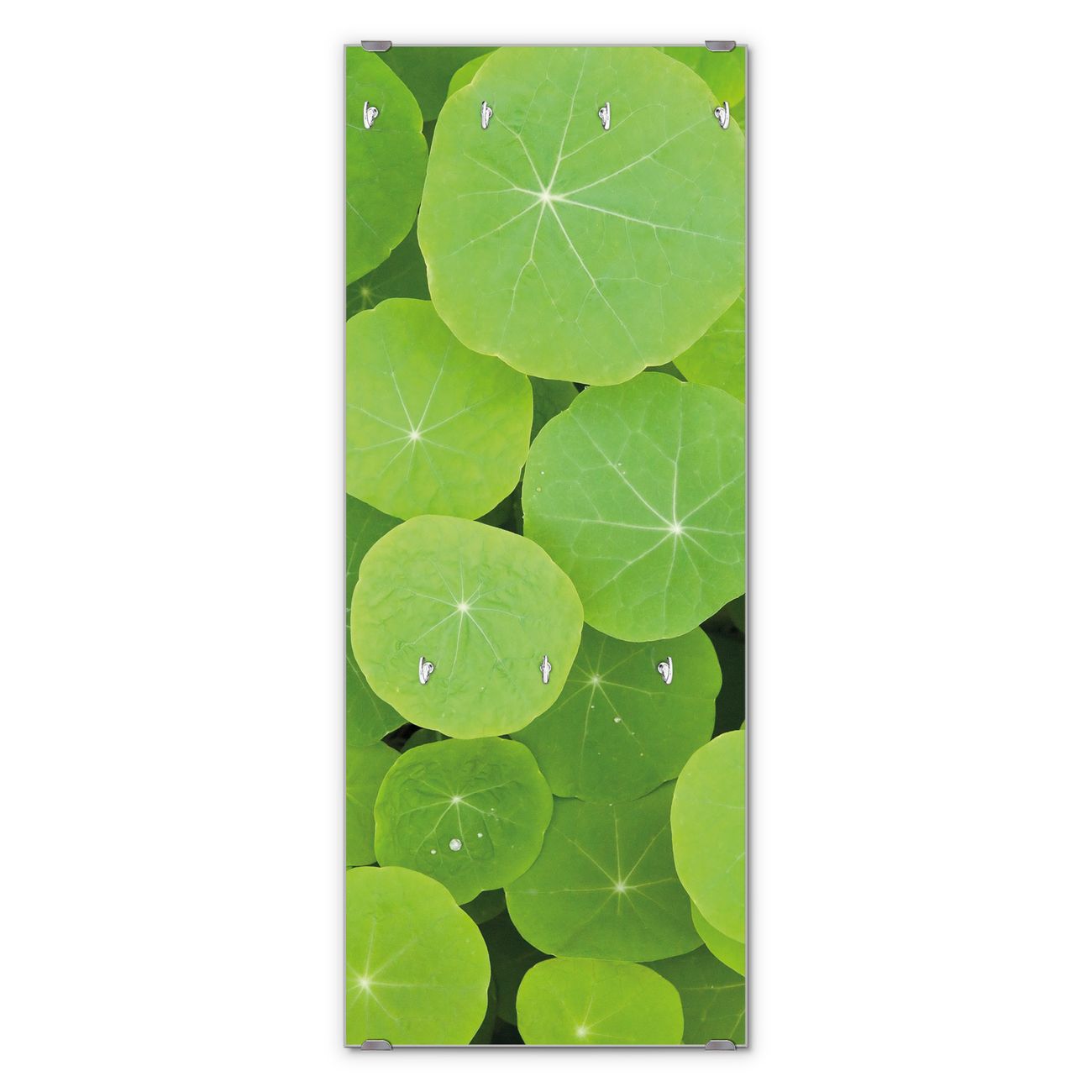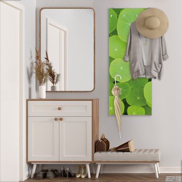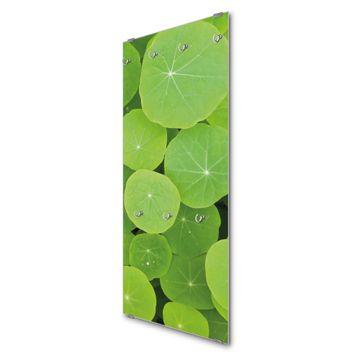 FUNKTION: Die banjado Wandgarderobe mit Motiv Kapuzinerkresse ist Ihr täglicher Begleiter. Zuverlässig hängen hier Ihre Jacken und Mäntel griffbereit. Das Echtglas ist Ihr Paneel auch beschreibbar und wieder abwischbar. DESIGN: Sie erhalten eine Garderobenleiste aus elegantem Echtglas mit dem Farbbrillanten Motiv Kapuzinerkresse hinterklebt. Das Design ist zeitlos klassisch, ohne dabei auf Funktionalität zu verzichten. Suchen Sie aus einer Vielzahl von Motiven das für Ihre Einrichtung Passende aus. DETAILS: Die Flurgarderobe besteht aus 4mm gehärtetem Sicherheitsglas. Sie ist 50cm breit, 125cm hoch und 6cm tief. Die Garderobenhaken zur Selbstmontage präsentieren sich in Edelstahl-Optik, ebenso die Abstandshalter für die Wandmontage. Ihre neue Garderobe ist sofort einsatzbereit. NUTZEN: Ihre neue Garderobe hält nicht nur zuverlässig Ihre Kleidung, sie ist auch optisch ein Blickfang. Durch das Glas können Sie an der Garderobe mit wasserlöslichen Kreidestiften oder Whiteboard-Markern auch Nachrichten hinterlassen. BANJADO: Wir sind ein kleines kreatives Team aus Sachsen und entwickeln Produkte die Design und Funktionalität verbinden sollen. Viel Freude mit Ihrer neuen Garderobe wünscht das banjado-Team!