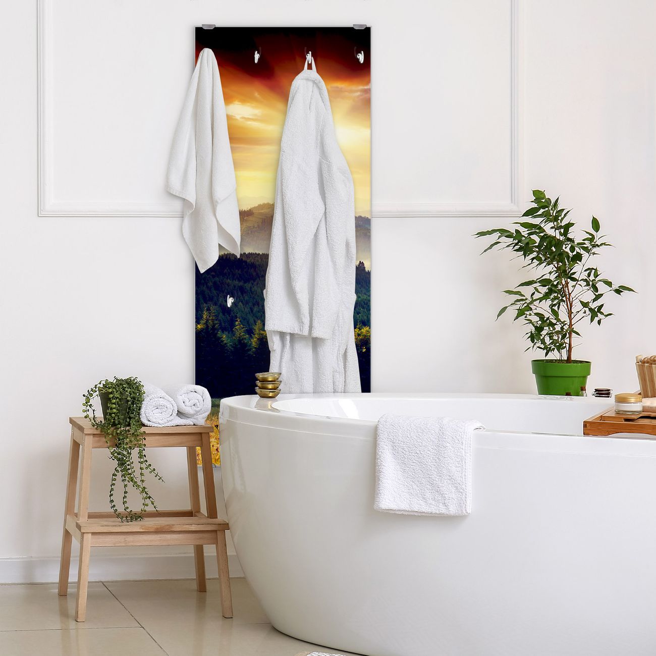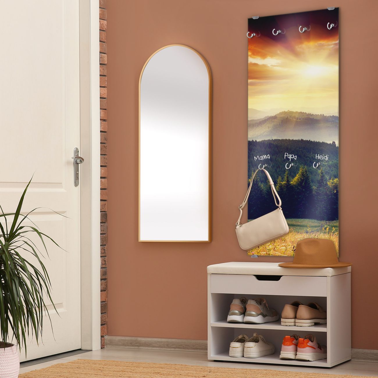 FUNKTION: Die banjado Wandgarderobe mit Motiv Karpaten Sonnenuntergang ist Ihr täglicher Begleiter. Zuverlässig hängen hier Ihre Jacken und Mäntel griffbereit. Das Echtglas ist Ihr Paneel auch beschreibbar und wieder abwischbar. DESIGN: Sie erhalten eine Garderobenleiste aus elegantem Echtglas mit dem Farbbrillanten Motiv Karpaten Sonnenuntergang hinterklebt. Das Design ist zeitlos klassisch, ohne dabei auf Funktionalität zu verzichten. Suchen Sie aus einer Vielzahl von Motiven das für Ihre Einrichtung Passende aus. DETAILS: Die Flurgarderobe besteht aus 4mm gehärtetem Sicherheitsglas. Sie ist 50cm breit, 125cm hoch und 6cm tief. Die Garderobenhaken zur Selbstmontage präsentieren sich in Edelstahl-Optik, ebenso die Abstandshalter für die Wandmontage. Ihre neue Garderobe ist sofort einsatzbereit. NUTZEN: Ihre neue Garderobe hält nicht nur zuverlässig Ihre Kleidung, sie ist auch optisch ein Blickfang. Durch das Glas können Sie an der Garderobe mit wasserlöslichen Kreidestiften oder Whiteboard-Markern auch Nachrichten hinterlassen. BANJADO: Wir sind ein kleines kreatives Team aus Sachsen und entwickeln Produkte die Design und Funktionalität verbinden sollen. Viel Freude mit Ihrer neuen Garderobe wünscht das banjado-Team!