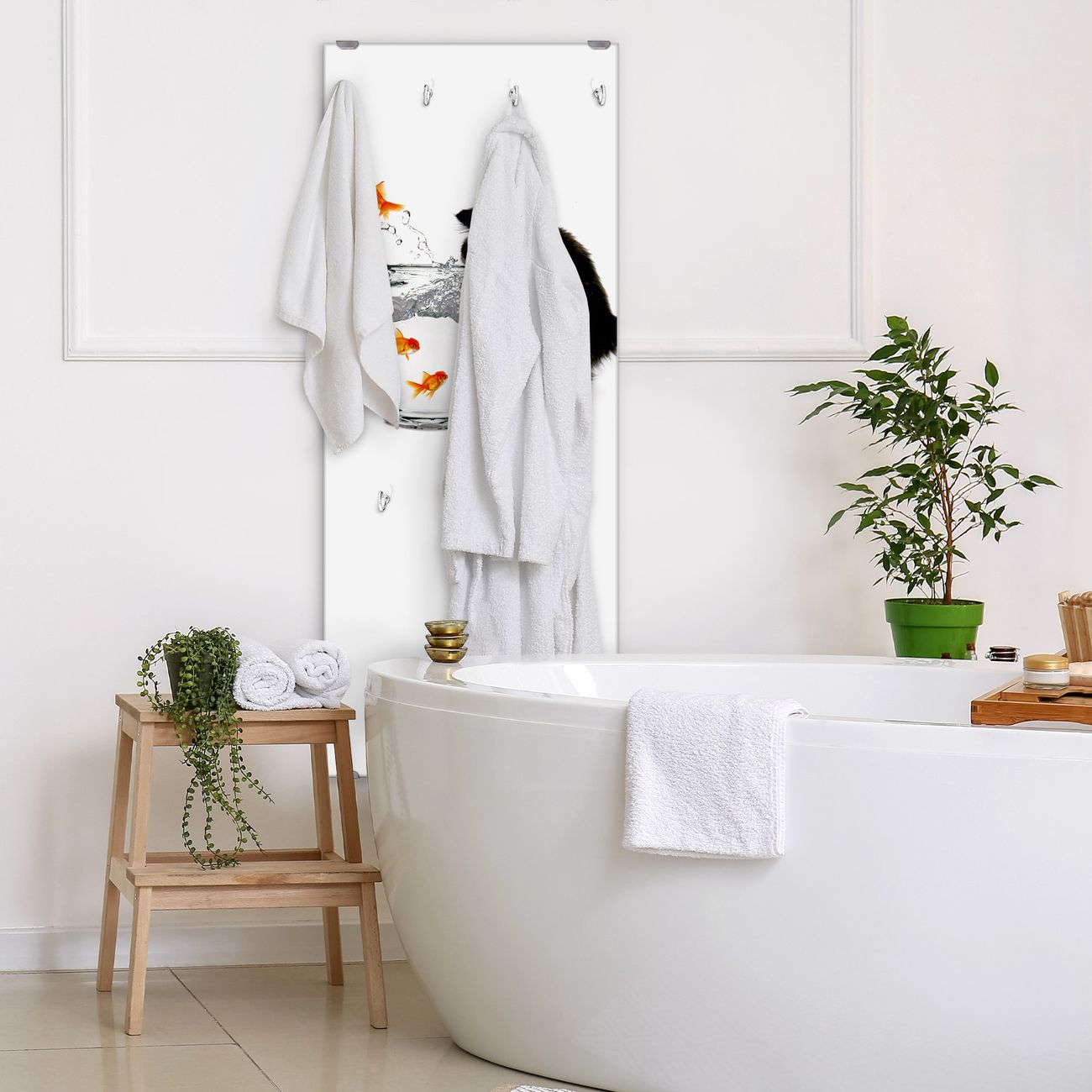 FUNKTION: Die banjado Wandgarderobe mit Motiv Katze Und Fisch ist Ihr täglicher Begleiter. Zuverlässig hängen hier Ihre Jacken und Mäntel griffbereit. Das Echtglas ist Ihr Paneel auch beschreibbar und wieder abwischbar. DESIGN: Sie erhalten eine Garderobenleiste aus elegantem Echtglas mit dem Farbbrillanten Motiv Katze Und Fisch hinterklebt. Das Design ist zeitlos klassisch, ohne dabei auf Funktionalität zu verzichten. Suchen Sie aus einer Vielzahl von Motiven das für Ihre Einrichtung Passende aus. DETAILS: Die Flurgarderobe besteht aus 4mm gehärtetem Sicherheitsglas. Sie ist 50cm breit, 125cm hoch und 6cm tief. Die Garderobenhaken zur Selbstmontage präsentieren sich in Edelstahl-Optik, ebenso die Abstandshalter für die Wandmontage. Ihre neue Garderobe ist sofort einsatzbereit. NUTZEN: Ihre neue Garderobe hält nicht nur zuverlässig Ihre Kleidung, sie ist auch optisch ein Blickfang. Durch das Glas können Sie an der Garderobe mit wasserlöslichen Kreidestiften oder Whiteboard-Markern auch Nachrichten hinterlassen. BANJADO: Wir sind ein kleines kreatives Team aus Sachsen und entwickeln Produkte die Design und Funktionalität verbinden sollen. Viel Freude mit Ihrer neuen Garderobe wünscht das banjado-Team!