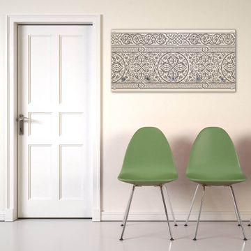 Bitte beachten Sie, dass an dieser Garderobe nur starke Neodym-Magnete halten! FUNKTION: Die banjado Wandgarderobe mit Motiv Keltischer Knoten ist Ihr täglicher Begleiter. Zuverlässig hängen hier Ihre Jacken und Mäntel griffbereit. Gleichzeitig ist die Design Garderobe magnetisch, Sie können Notizen anheften und durch das Echtglas ist Ihr Paneel auch beschreibbar und wieder abwischbar. DESIGN: Sie erhalten eine Garderobenleiste aus elegantem Echtglas mit dem Farbbrillanten Motiv Keltischer Knoten hinterklebt. Das Design ist zeitlos klassisch, ohne dabei auf Funktionalität zu verzichten. Suchen Sie aus einer Vielzahl von Motiven das für Ihre Einrichtung Passende aus. DETAILS: Die Flurgarderobe besteht aus 4mm gehärtetem Sicherheitsglas. Sie ist 80cm breit, 40cm hoch und 6cm tief. Die Garderobenhaken zur Selbstmontage präsentieren sich in Edelstahl-Optik, ebenso die Abstandshalter für die Wandmontage. Ihre neue Garderobe ist sofort einsatzbereit. NUTZEN: Ihre neue Garderobe hält nicht nur zuverlässig Ihre Kleidung, sie ist auch optisch ein Blickfang. Durch die magnetische Wirkung können Sie mit 4 beigefügten extrastarken Neodym-Magneten Notizen anheften und mit wasserlöslichen Kreidestiften oder Whiteboard-Markern auch Nachrichten hinterlassen. BANJADO: Wir sind ein kleines kreatives Team aus Sachsen und entwickeln Produkte die Design und Funktionalität verbinden sollen. Viel Freude mit Ihrer neuen Garderobe wünscht das banjado-Team!