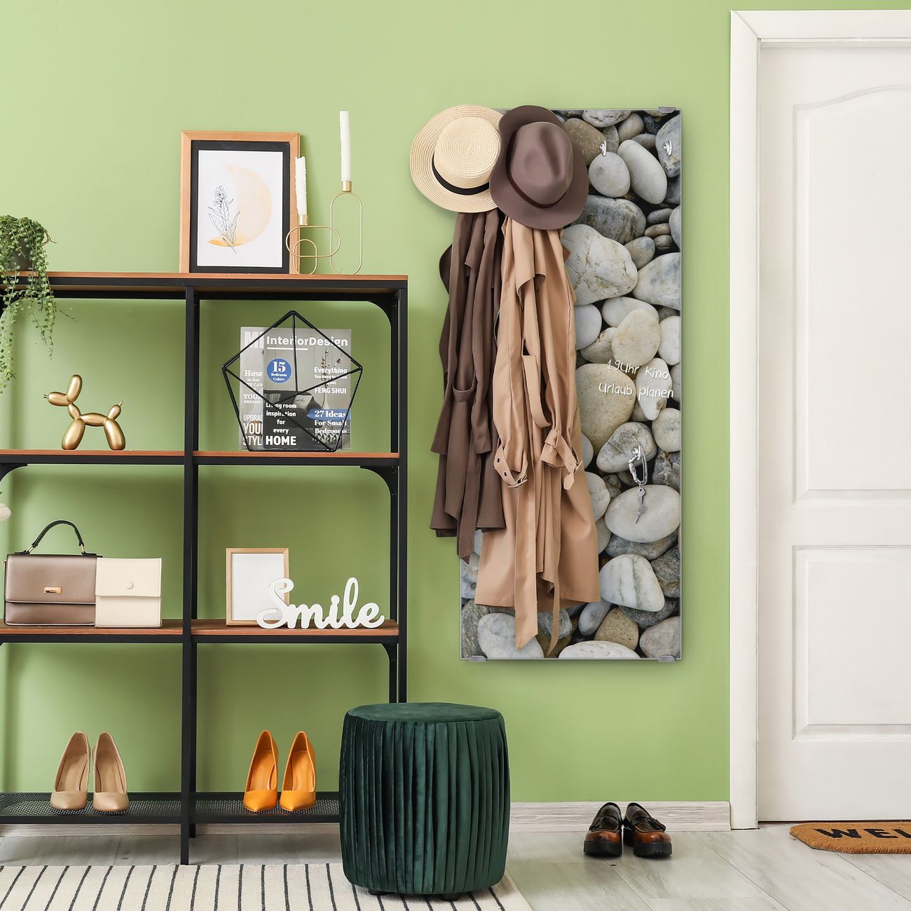 FUNKTION: Die banjado Wandgarderobe mit Motiv Kieselsteine ist Ihr täglicher Begleiter. Zuverlässig hängen hier Ihre Jacken und Mäntel griffbereit. Das Echtglas ist Ihr Paneel auch beschreibbar und wieder abwischbar. DESIGN: Sie erhalten eine Garderobenleiste aus elegantem Echtglas mit dem Farbbrillanten Motiv Kieselsteine hinterklebt. Das Design ist zeitlos klassisch, ohne dabei auf Funktionalität zu verzichten. Suchen Sie aus einer Vielzahl von Motiven das für Ihre Einrichtung Passende aus. DETAILS: Die Flurgarderobe besteht aus 4mm gehärtetem Sicherheitsglas. Sie ist 50cm breit, 125cm hoch und 6cm tief. Die Garderobenhaken zur Selbstmontage präsentieren sich in Edelstahl-Optik, ebenso die Abstandshalter für die Wandmontage. Ihre neue Garderobe ist sofort einsatzbereit. NUTZEN: Ihre neue Garderobe hält nicht nur zuverlässig Ihre Kleidung, sie ist auch optisch ein Blickfang. Durch das Glas können Sie an der Garderobe mit wasserlöslichen Kreidestiften oder Whiteboard-Markern auch Nachrichten hinterlassen. BANJADO: Wir sind ein kleines kreatives Team aus Sachsen und entwickeln Produkte die Design und Funktionalität verbinden sollen. Viel Freude mit Ihrer neuen Garderobe wünscht das banjado-Team!