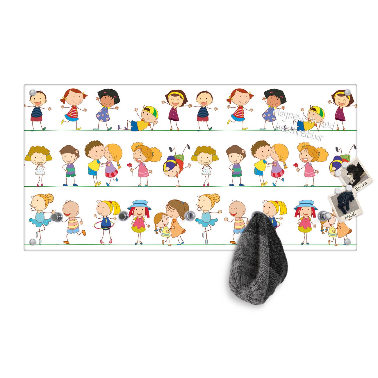 Bitte beachten Sie, dass an dieser Garderobe nur starke Neodym-Magnete halten! FUNKTION: Die banjado Wandgarderobe mit Motiv Kinder ist Ihr täglicher Begleiter. Zuverlässig hängen hier Ihre Jacken und Mäntel griffbereit. Gleichzeitig ist die Design Garderobe magnetisch, Sie können Notizen anheften und durch das Echtglas ist Ihr Paneel auch beschreibbar und wieder abwischbar. DESIGN: Sie erhalten eine Garderobenleiste aus elegantem Echtglas mit dem Farbbrillanten Motiv Kinder hinterklebt. Das Design ist zeitlos klassisch, ohne dabei auf Funktionalität zu verzichten. Suchen Sie aus einer Vielzahl von Motiven das für Ihre Einrichtung Passende aus. DETAILS: Die Flurgarderobe besteht aus 4mm gehärtetem Sicherheitsglas. Sie ist 80cm breit, 40cm hoch und 6cm tief. Die Garderobenhaken zur Selbstmontage präsentieren sich in Edelstahl-Optik, ebenso die Abstandshalter für die Wandmontage. Ihre neue Garderobe ist sofort einsatzbereit. NUTZEN: Ihre neue Garderobe hält nicht nur zuverlässig Ihre Kleidung, sie ist auch optisch ein Blickfang. Durch die magnetische Wirkung können Sie mit 4 beigefügten extrastarken Neodym-Magneten Notizen anheften und mit wasserlöslichen Kreidestiften oder Whiteboard-Markern auch Nachrichten hinterlassen. BANJADO: Wir sind ein kleines kreatives Team aus Sachsen und entwickeln Produkte die Design und Funktionalität verbinden sollen. Viel Freude mit Ihrer neuen Garderobe wünscht das banjado-Team!