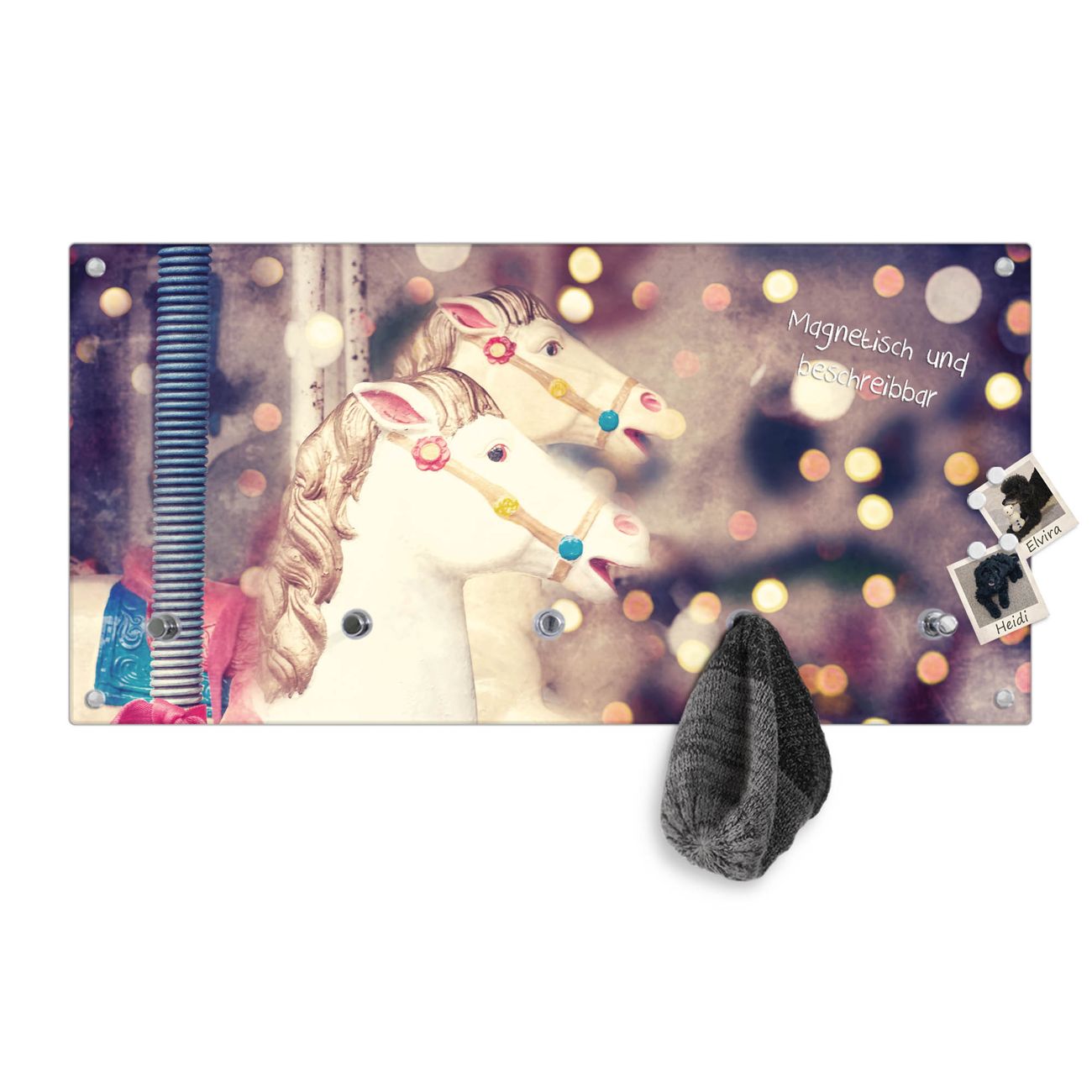 Bitte beachten Sie, dass an dieser Garderobe nur starke Neodym-Magnete halten! FUNKTION: Die banjado Wandgarderobe mit Motiv Kinderkarussell ist Ihr täglicher Begleiter. Zuverlässig hängen hier Ihre Jacken und Mäntel griffbereit. Gleichzeitig ist die Design Garderobe magnetisch, Sie können Notizen anheften und durch das Echtglas ist Ihr Paneel auch beschreibbar und wieder abwischbar. DESIGN: Sie erhalten eine Garderobenleiste aus elegantem Echtglas mit dem Farbbrillanten Motiv Kinderkarussell hinterklebt. Das Design ist zeitlos klassisch, ohne dabei auf Funktionalität zu verzichten. Suchen Sie aus einer Vielzahl von Motiven das für Ihre Einrichtung Passende aus. DETAILS: Die Flurgarderobe besteht aus 4mm gehärtetem Sicherheitsglas. Sie ist 80cm breit, 40cm hoch und 6cm tief. Die Garderobenhaken zur Selbstmontage präsentieren sich in Edelstahl-Optik, ebenso die Abstandshalter für die Wandmontage. Ihre neue Garderobe ist sofort einsatzbereit. NUTZEN: Ihre neue Garderobe hält nicht nur zuverlässig Ihre Kleidung, sie ist auch optisch ein Blickfang. Durch die magnetische Wirkung können Sie mit 4 beigefügten extrastarken Neodym-Magneten Notizen anheften und mit wasserlöslichen Kreidestiften oder Whiteboard-Markern auch Nachrichten hinterlassen. BANJADO: Wir sind ein kleines kreatives Team aus Sachsen und entwickeln Produkte die Design und Funktionalität verbinden sollen. Viel Freude mit Ihrer neuen Garderobe wünscht das banjado-Team!