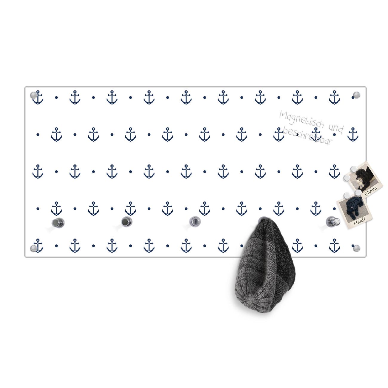 Bitte beachten Sie, dass an dieser Garderobe nur starke Neodym-Magnete halten! FUNKTION: Die banjado Wandgarderobe mit Motiv Kleine Anker ist Ihr täglicher Begleiter. Zuverlässig hängen hier Ihre Jacken und Mäntel griffbereit. Gleichzeitig ist die Design Garderobe magnetisch, Sie können Notizen anheften und durch das Echtglas ist Ihr Paneel auch beschreibbar und wieder abwischbar. DESIGN: Sie erhalten eine Garderobenleiste aus elegantem Echtglas mit dem Farbbrillanten Motiv Kleine Anker hinterklebt. Das Design ist zeitlos klassisch, ohne dabei auf Funktionalität zu verzichten. Suchen Sie aus einer Vielzahl von Motiven das für Ihre Einrichtung Passende aus. DETAILS: Die Flurgarderobe besteht aus 4mm gehärtetem Sicherheitsglas. Sie ist 80cm breit, 40cm hoch und 6cm tief. Die Garderobenhaken zur Selbstmontage präsentieren sich in Edelstahl-Optik, ebenso die Abstandshalter für die Wandmontage. Ihre neue Garderobe ist sofort einsatzbereit. NUTZEN: Ihre neue Garderobe hält nicht nur zuverlässig Ihre Kleidung, sie ist auch optisch ein Blickfang. Durch die magnetische Wirkung können Sie mit 4 beigefügten extrastarken Neodym-Magneten Notizen anheften und mit wasserlöslichen Kreidestiften oder Whiteboard-Markern auch Nachrichten hinterlassen. BANJADO: Wir sind ein kleines kreatives Team aus Sachsen und entwickeln Produkte die Design und Funktionalität verbinden sollen. Viel Freude mit Ihrer neuen Garderobe wünscht das banjado-Team!