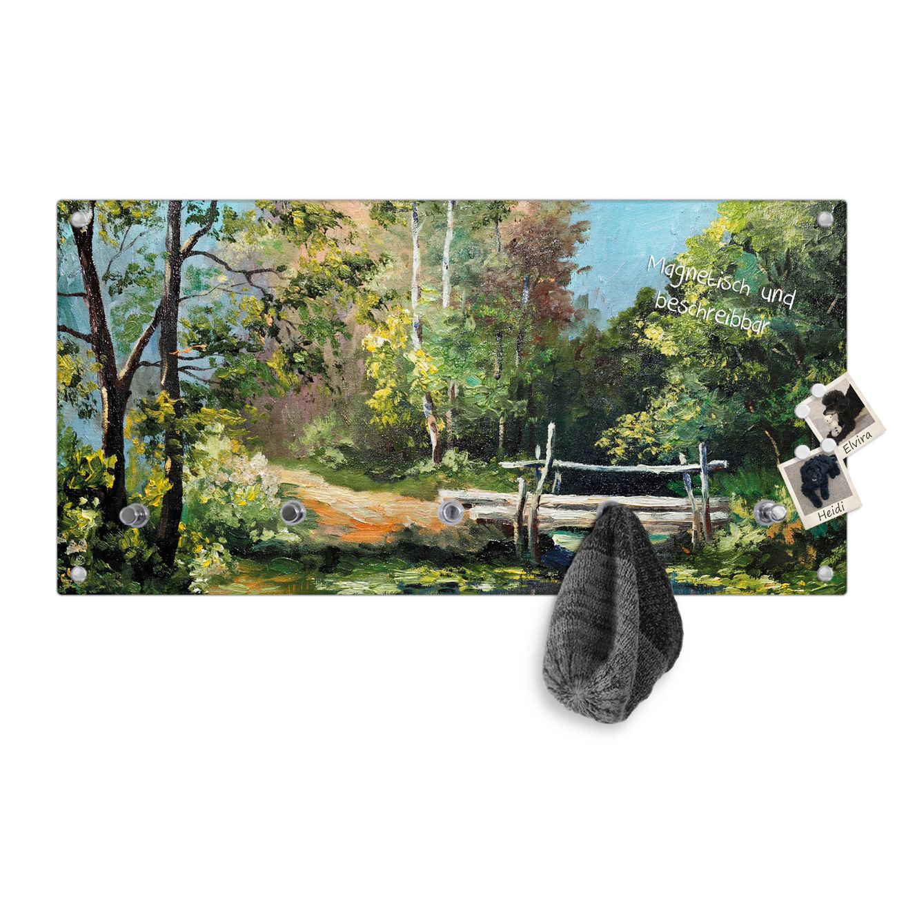 Bitte beachten Sie, dass an dieser Garderobe nur starke Neodym-Magnete halten! FUNKTION: Die banjado Wandgarderobe mit Motiv Kleine Brücke ist Ihr täglicher Begleiter. Zuverlässig hängen hier Ihre Jacken und Mäntel griffbereit. Gleichzeitig ist die Design Garderobe magnetisch, Sie können Notizen anheften und durch das Echtglas ist Ihr Paneel auch beschreibbar und wieder abwischbar. DESIGN: Sie erhalten eine Garderobenleiste aus elegantem Echtglas mit dem Farbbrillanten Motiv Kleine Brücke hinterklebt. Das Design ist zeitlos klassisch, ohne dabei auf Funktionalität zu verzichten. Suchen Sie aus einer Vielzahl von Motiven das für Ihre Einrichtung Passende aus. DETAILS: Die Flurgarderobe besteht aus 4mm gehärtetem Sicherheitsglas. Sie ist 80cm breit, 40cm hoch und 6cm tief. Die Garderobenhaken zur Selbstmontage präsentieren sich in Edelstahl-Optik, ebenso die Abstandshalter für die Wandmontage. Ihre neue Garderobe ist sofort einsatzbereit. NUTZEN: Ihre neue Garderobe hält nicht nur zuverlässig Ihre Kleidung, sie ist auch optisch ein Blickfang. Durch die magnetische Wirkung können Sie mit 4 beigefügten extrastarken Neodym-Magneten Notizen anheften und mit wasserlöslichen Kreidestiften oder Whiteboard-Markern auch Nachrichten hinterlassen. BANJADO: Wir sind ein kleines kreatives Team aus Sachsen und entwickeln Produkte die Design und Funktionalität verbinden sollen. Viel Freude mit Ihrer neuen Garderobe wünscht das banjado-Team!