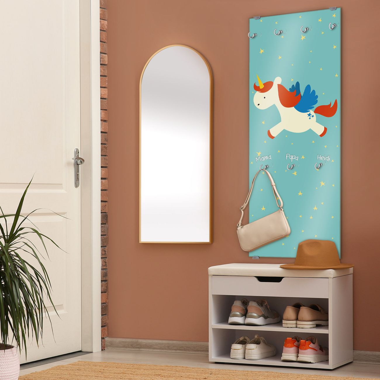 FUNKTION: Die banjado Wandgarderobe mit Motiv Kleines Einhorn ist Ihr täglicher Begleiter. Zuverlässig hängen hier Ihre Jacken und Mäntel griffbereit. Das Echtglas ist Ihr Paneel auch beschreibbar und wieder abwischbar. DESIGN: Sie erhalten eine Garderobenleiste aus elegantem Echtglas mit dem Farbbrillanten Motiv Kleines Einhorn hinterklebt. Das Design ist zeitlos klassisch, ohne dabei auf Funktionalität zu verzichten. Suchen Sie aus einer Vielzahl von Motiven das für Ihre Einrichtung Passende aus. DETAILS: Die Flurgarderobe besteht aus 4mm gehärtetem Sicherheitsglas. Sie ist 50cm breit, 125cm hoch und 6cm tief. Die Garderobenhaken zur Selbstmontage präsentieren sich in Edelstahl-Optik, ebenso die Abstandshalter für die Wandmontage. Ihre neue Garderobe ist sofort einsatzbereit. NUTZEN: Ihre neue Garderobe hält nicht nur zuverlässig Ihre Kleidung, sie ist auch optisch ein Blickfang. Durch das Glas können Sie an der Garderobe mit wasserlöslichen Kreidestiften oder Whiteboard-Markern auch Nachrichten hinterlassen. BANJADO: Wir sind ein kleines kreatives Team aus Sachsen und entwickeln Produkte die Design und Funktionalität verbinden sollen. Viel Freude mit Ihrer neuen Garderobe wünscht das banjado-Team!