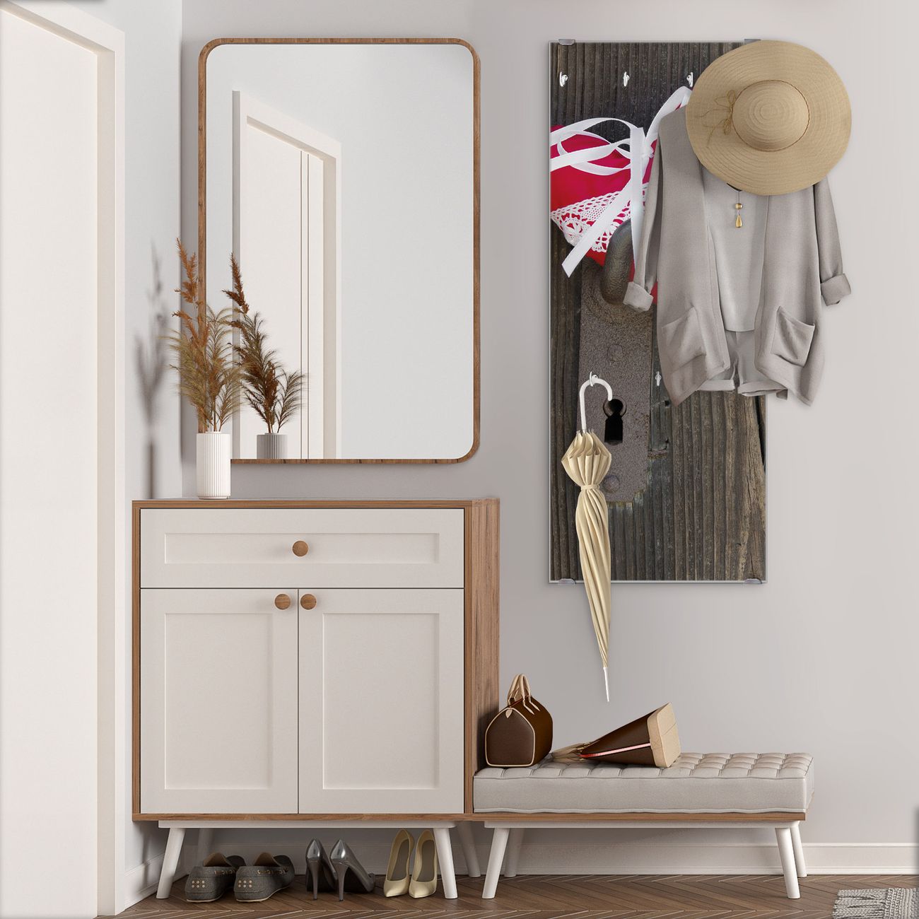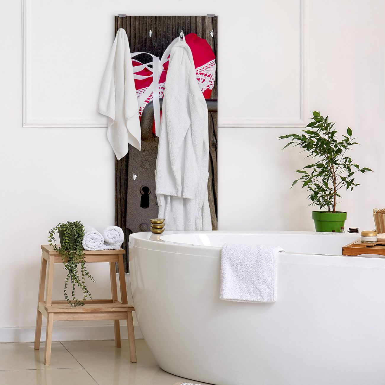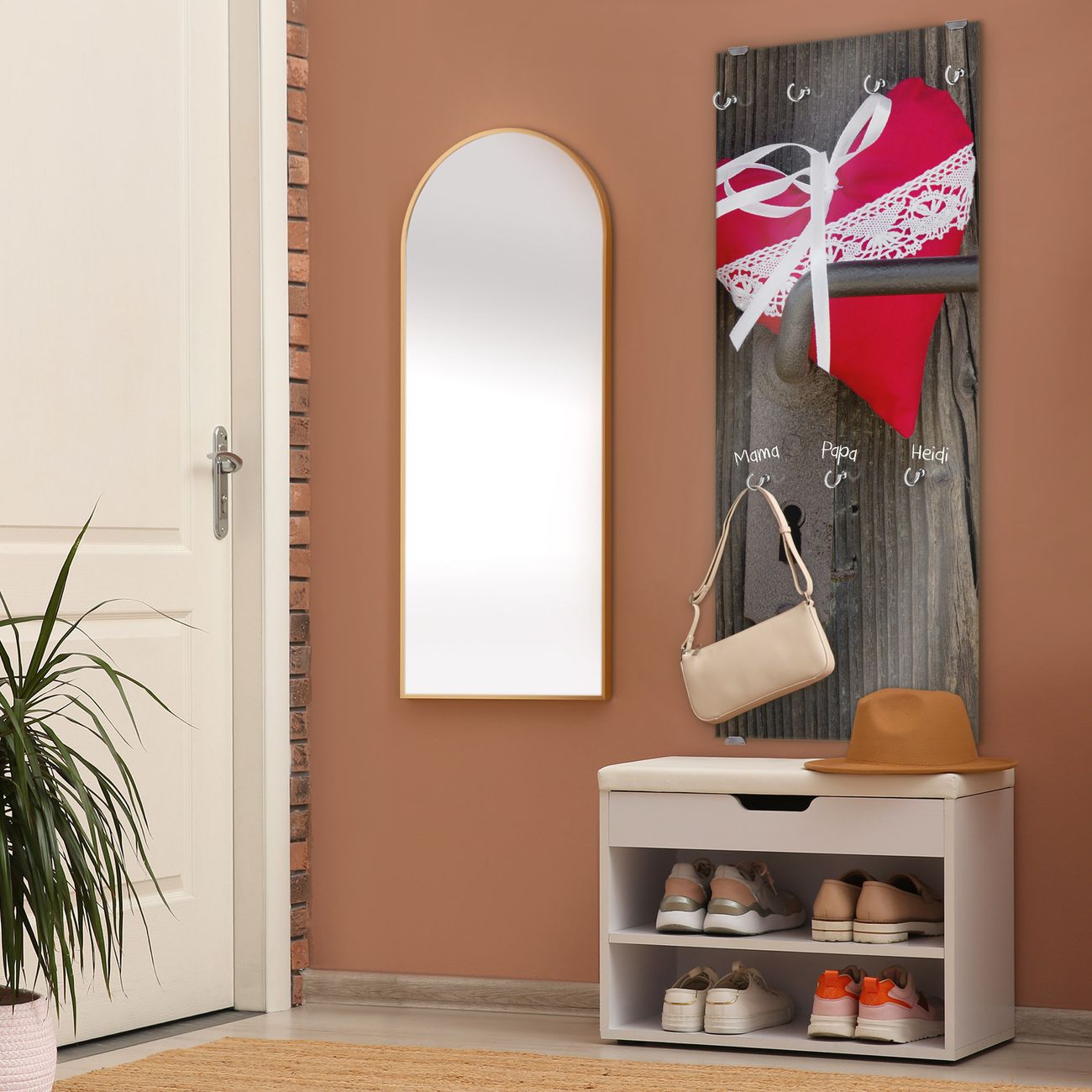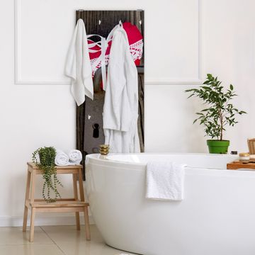FUNKTION: Die banjado Wandgarderobe mit Motiv Knock On Your Door ist Ihr täglicher Begleiter. Zuverlässig hängen hier Ihre Jacken und Mäntel griffbereit. Das Echtglas ist Ihr Paneel auch beschreibbar und wieder abwischbar. DESIGN: Sie erhalten eine Garderobenleiste aus elegantem Echtglas mit dem Farbbrillanten Motiv Knock On Your Door hinterklebt. Das Design ist zeitlos klassisch, ohne dabei auf Funktionalität zu verzichten. Suchen Sie aus einer Vielzahl von Motiven das für Ihre Einrichtung Passende aus. DETAILS: Die Flurgarderobe besteht aus 4mm gehärtetem Sicherheitsglas. Sie ist 50cm breit, 125cm hoch und 6cm tief. Die Garderobenhaken zur Selbstmontage präsentieren sich in Edelstahl-Optik, ebenso die Abstandshalter für die Wandmontage. Ihre neue Garderobe ist sofort einsatzbereit. NUTZEN: Ihre neue Garderobe hält nicht nur zuverlässig Ihre Kleidung, sie ist auch optisch ein Blickfang. Durch das Glas können Sie an der Garderobe mit wasserlöslichen Kreidestiften oder Whiteboard-Markern auch Nachrichten hinterlassen. BANJADO: Wir sind ein kleines kreatives Team aus Sachsen und entwickeln Produkte die Design und Funktionalität verbinden sollen. Viel Freude mit Ihrer neuen Garderobe wünscht das banjado-Team!
