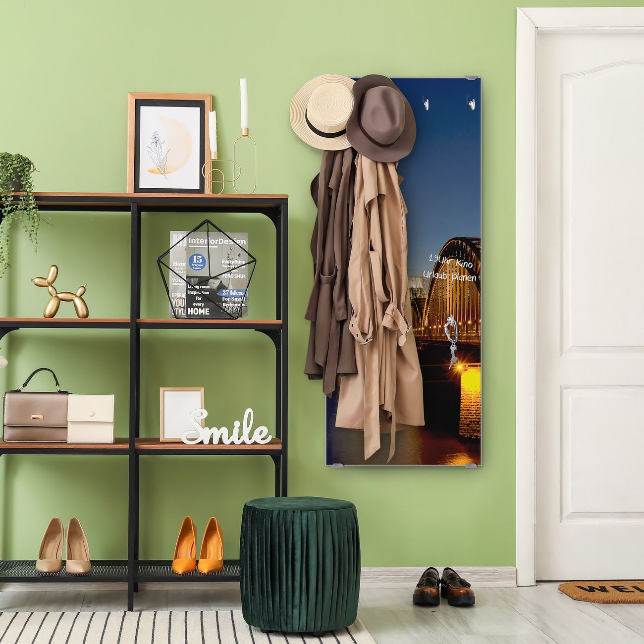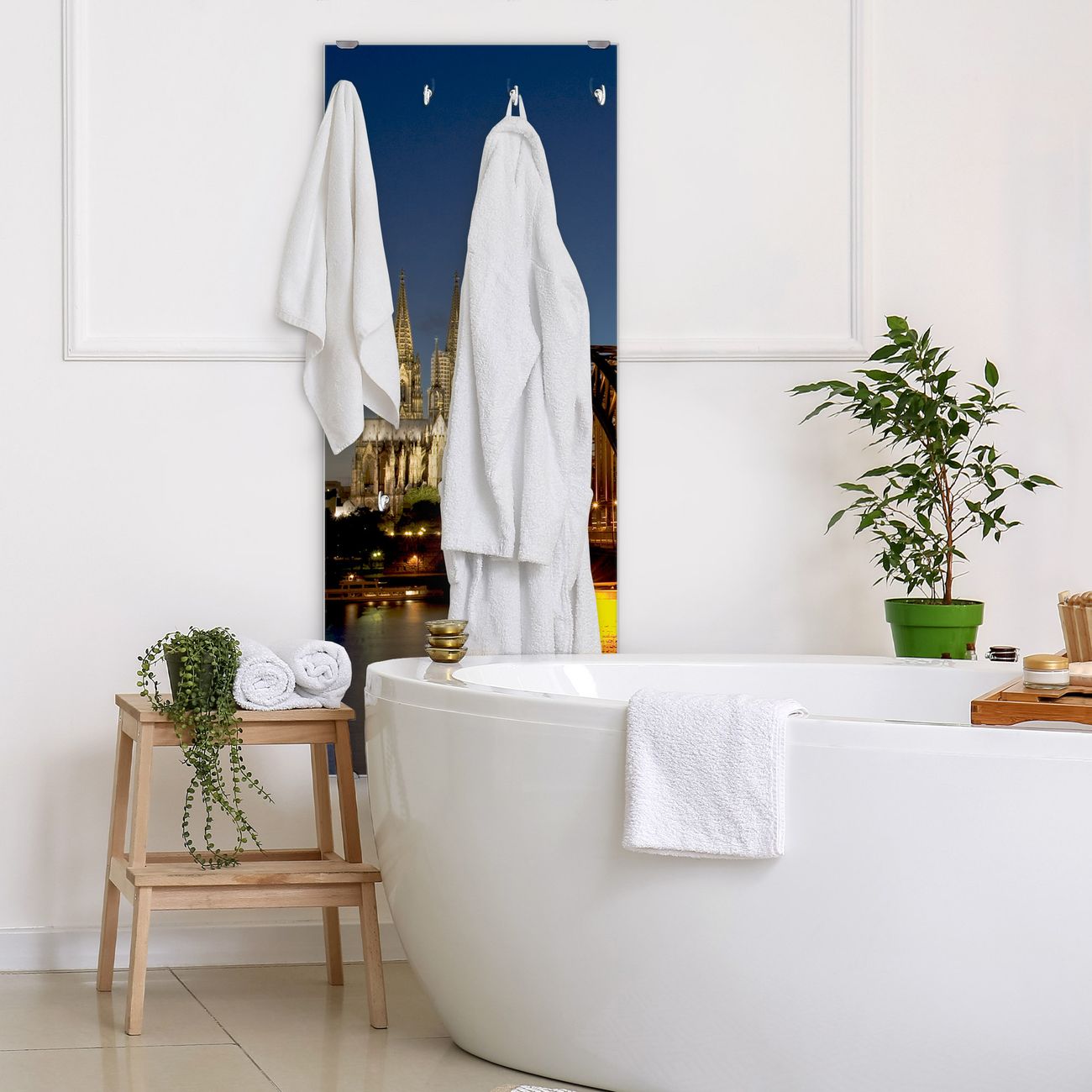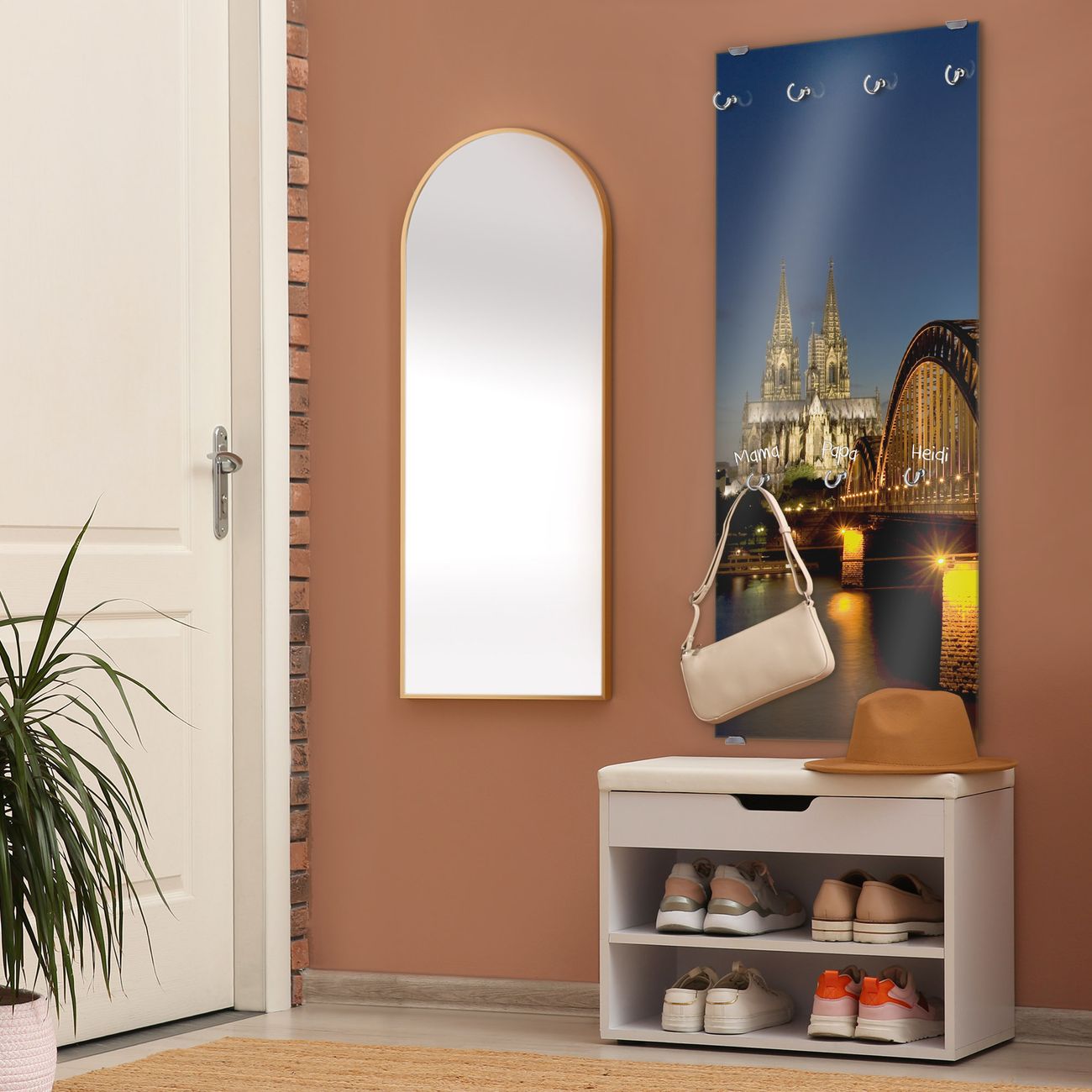 FUNKTION: Die banjado Wandgarderobe mit Motiv Köln ist Ihr täglicher Begleiter. Zuverlässig hängen hier Ihre Jacken und Mäntel griffbereit. Das Echtglas ist Ihr Paneel auch beschreibbar und wieder abwischbar. DESIGN: Sie erhalten eine Garderobenleiste aus elegantem Echtglas mit dem Farbbrillanten Motiv Köln hinterklebt. Das Design ist zeitlos klassisch, ohne dabei auf Funktionalität zu verzichten. Suchen Sie aus einer Vielzahl von Motiven das für Ihre Einrichtung Passende aus. DETAILS: Die Flurgarderobe besteht aus 4mm gehärtetem Sicherheitsglas. Sie ist 50cm breit, 125cm hoch und 6cm tief. Die Garderobenhaken zur Selbstmontage präsentieren sich in Edelstahl-Optik, ebenso die Abstandshalter für die Wandmontage. Ihre neue Garderobe ist sofort einsatzbereit. NUTZEN: Ihre neue Garderobe hält nicht nur zuverlässig Ihre Kleidung, sie ist auch optisch ein Blickfang. Durch das Glas können Sie an der Garderobe mit wasserlöslichen Kreidestiften oder Whiteboard-Markern auch Nachrichten hinterlassen. BANJADO: Wir sind ein kleines kreatives Team aus Sachsen und entwickeln Produkte die Design und Funktionalität verbinden sollen. Viel Freude mit Ihrer neuen Garderobe wünscht das banjado-Team!